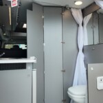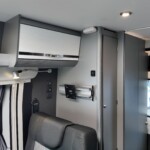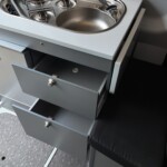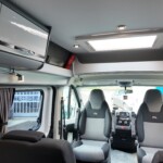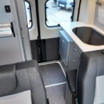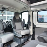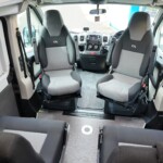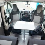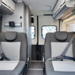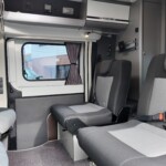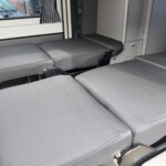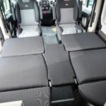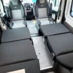 The lounge seats effortlessly transform into two longitudinal single beds 1.95m x 0.70m (approx. 6’4″ x 2’3″). The two forward-facing rear travel seats feature a “slide and drop” mechanism. You pull the seat base forward towards the swivelled front cab seats and fold the backrest flat to bridge the gap.