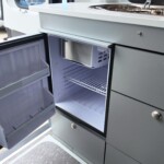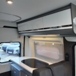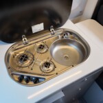 The rear kitchen is located on the nearside, the galley includes a three-burner gas hob, a circular sink, and a 65-litre compressor fridge with a freezer compartment. It also features a flip-up worktop extension for extra preparation space.