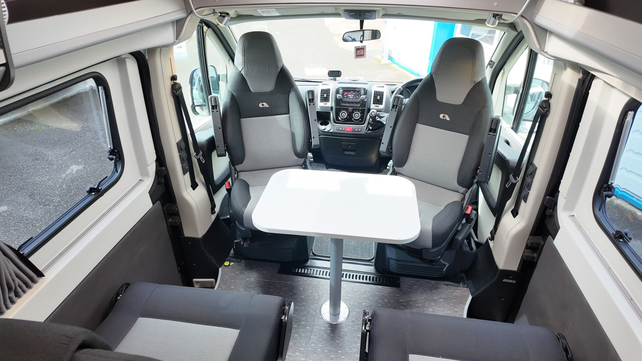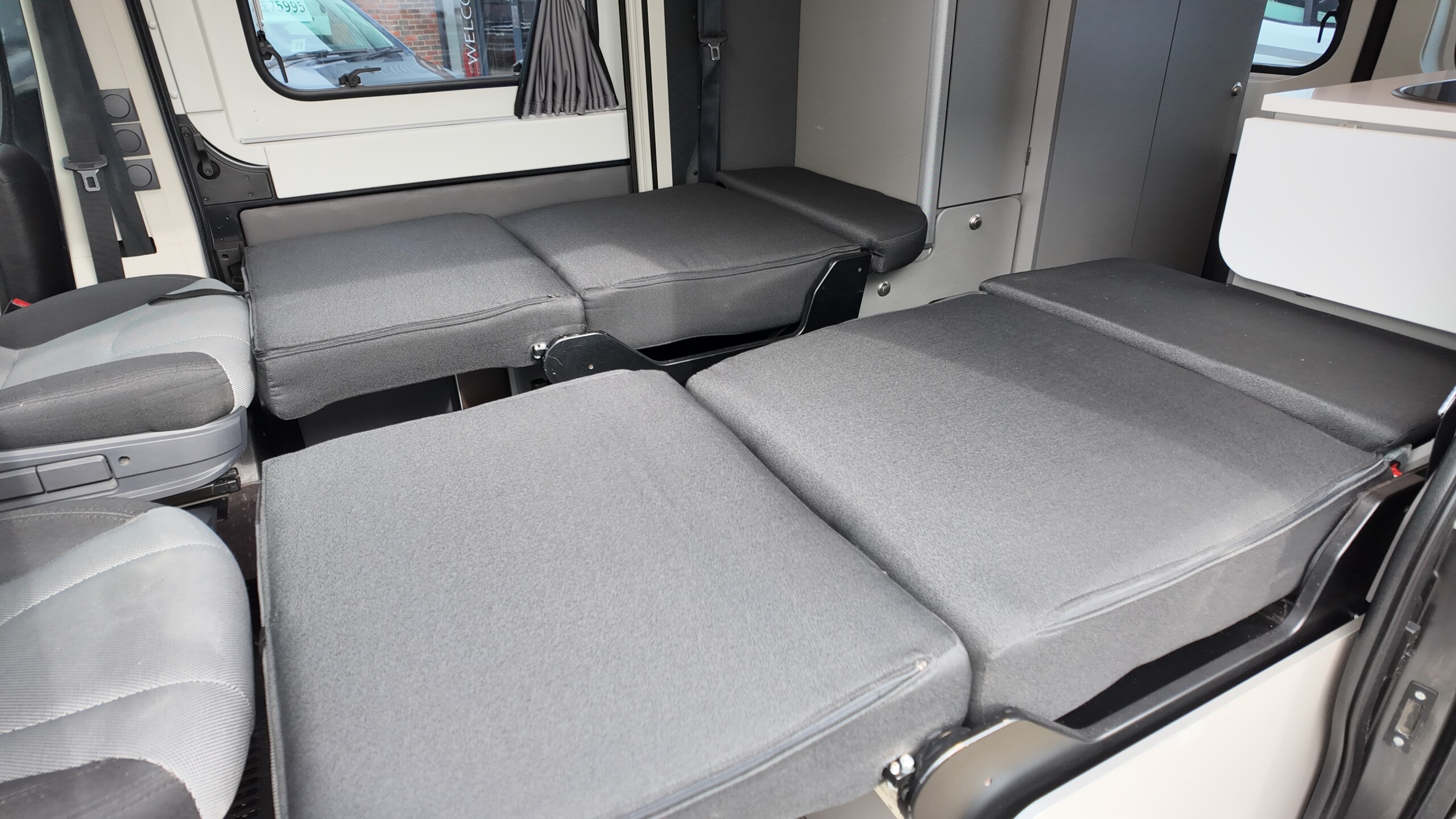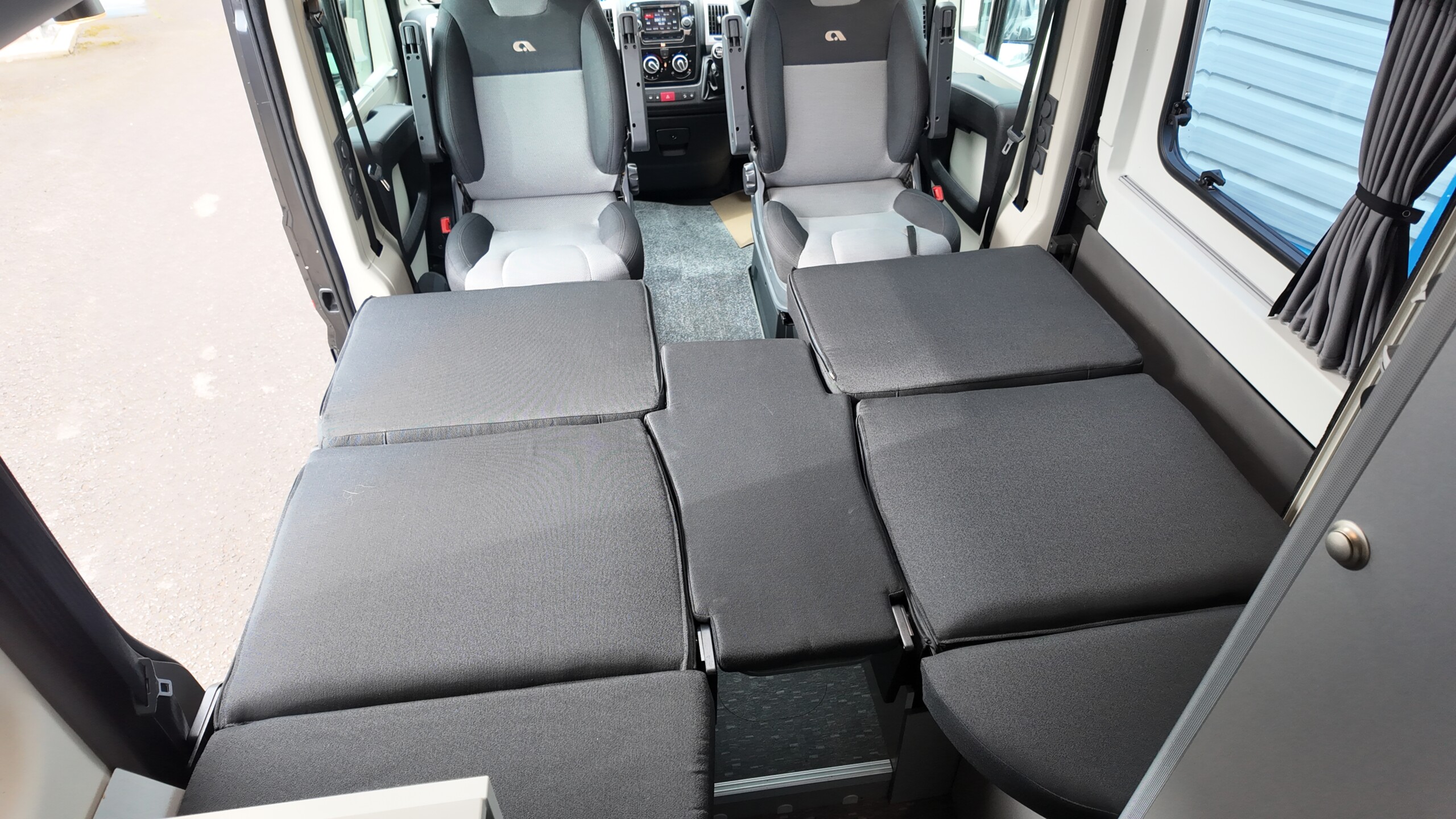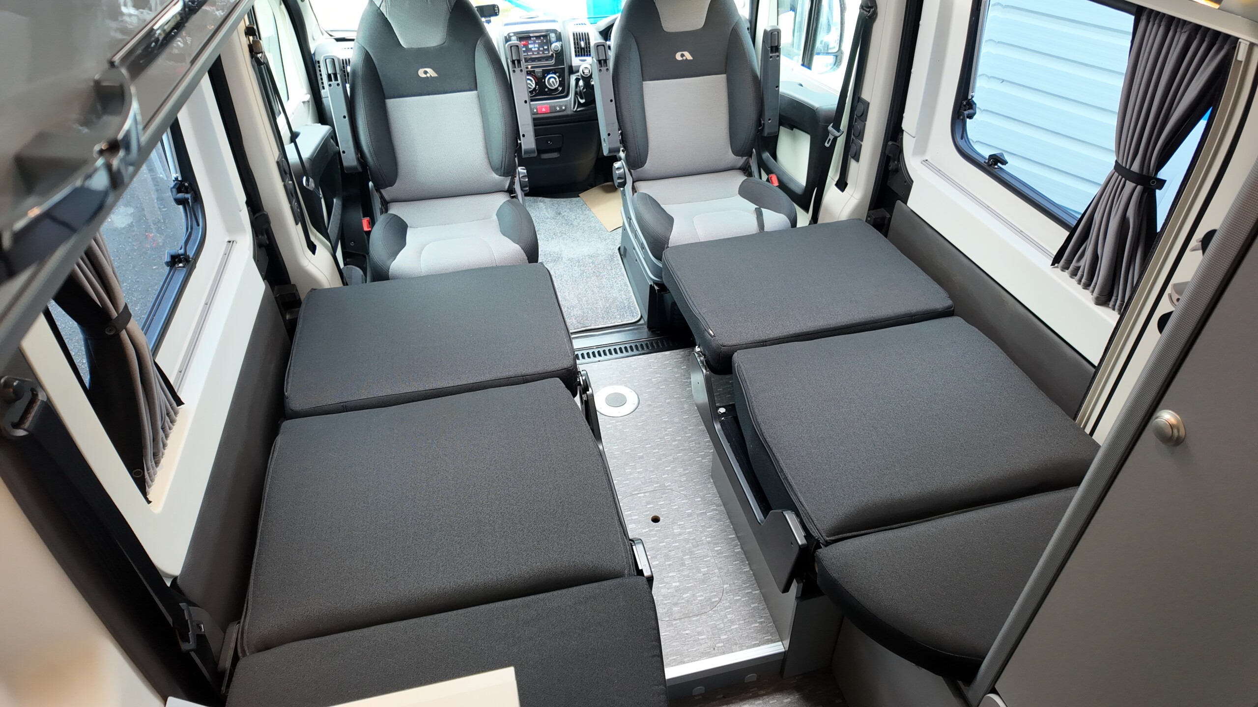 The lounge seats effortlessly transform into two longitudinal single beds 1.95m x 0.70m (approx. 6’4″ x 2’3″). The two forward-facing rear travel seats feature a “slide and drop” mechanism. You pull the seat base forward towards the swivelled front cab seats and fold the backrest flat to bridge the gap.