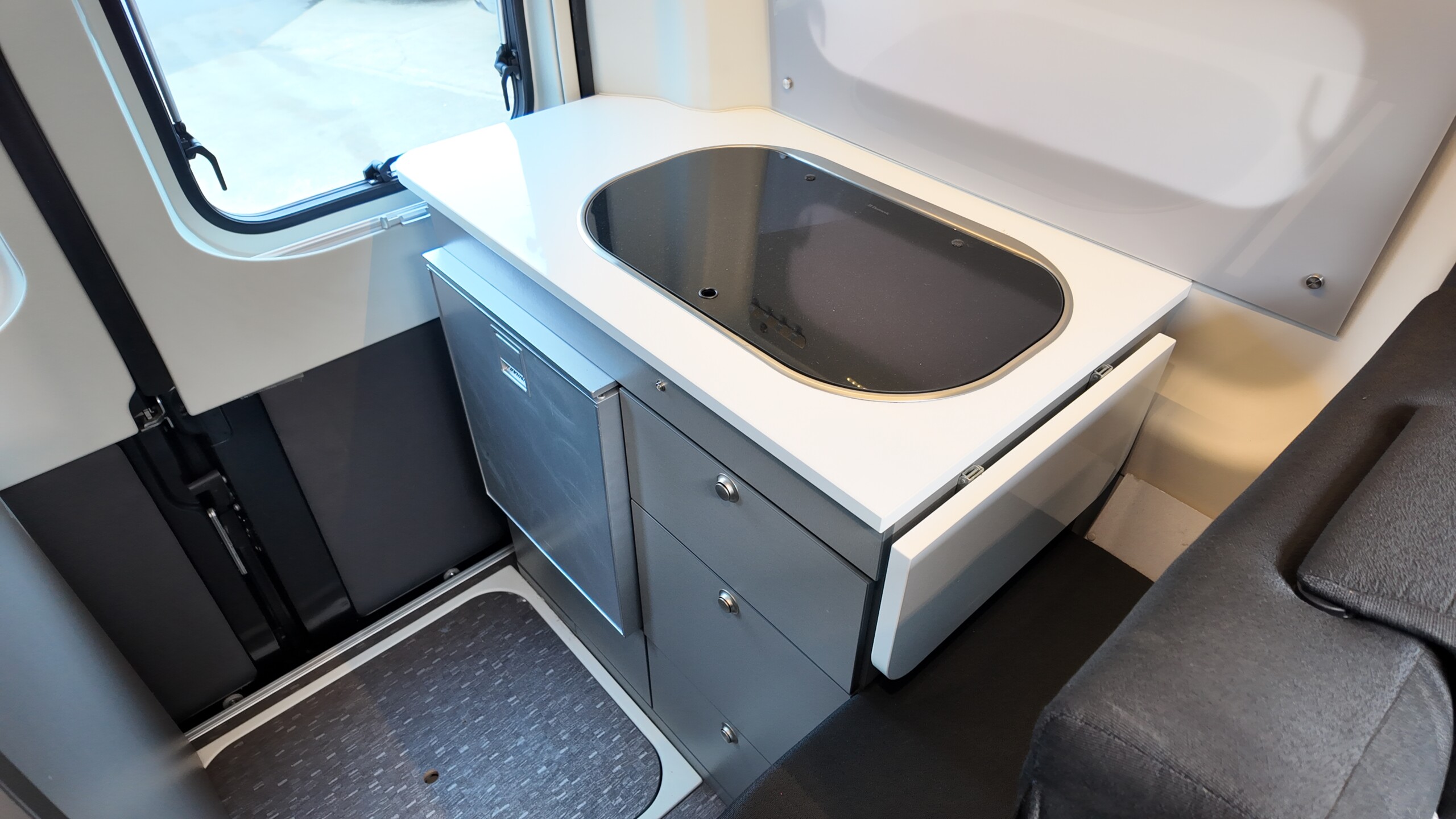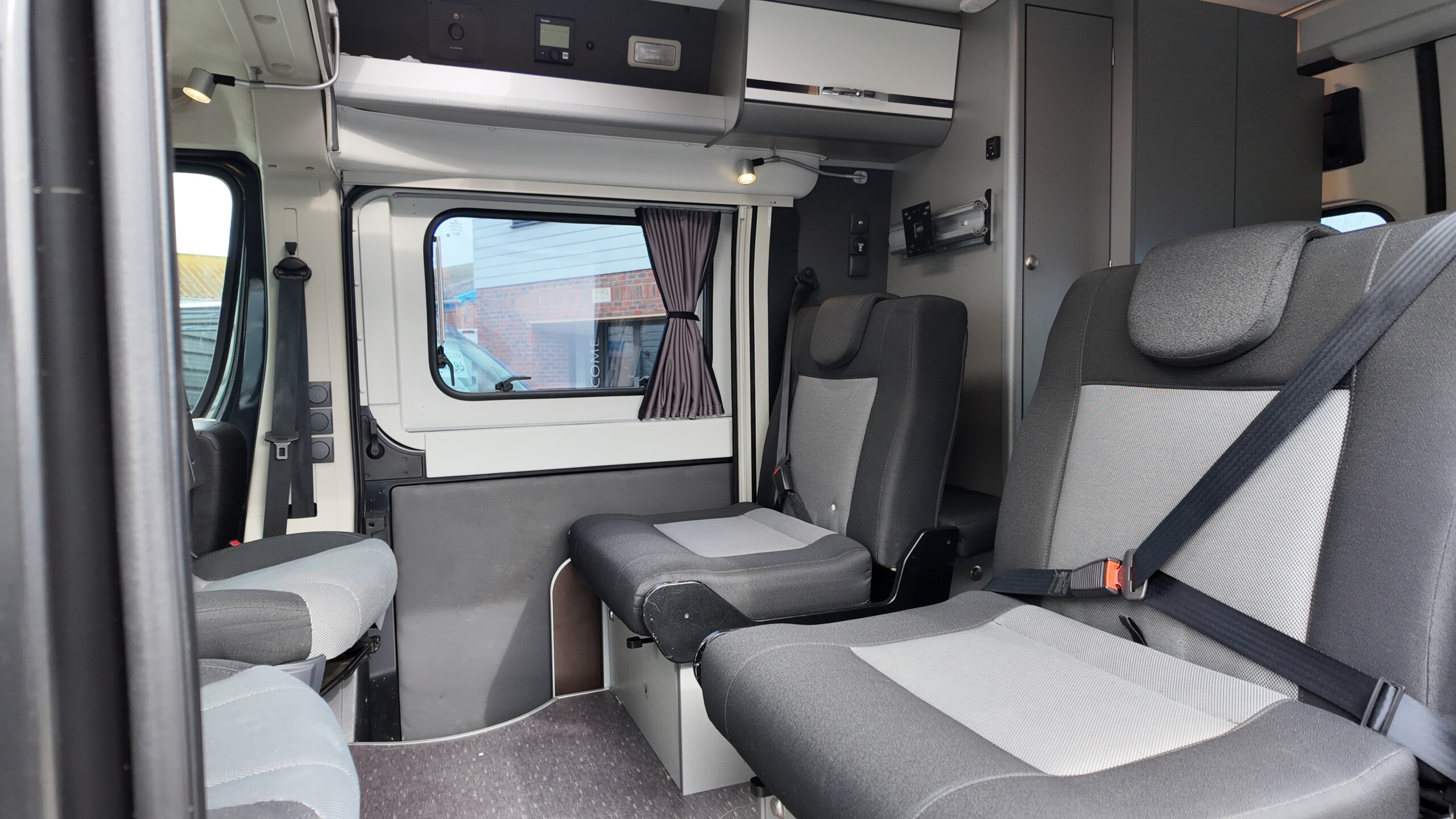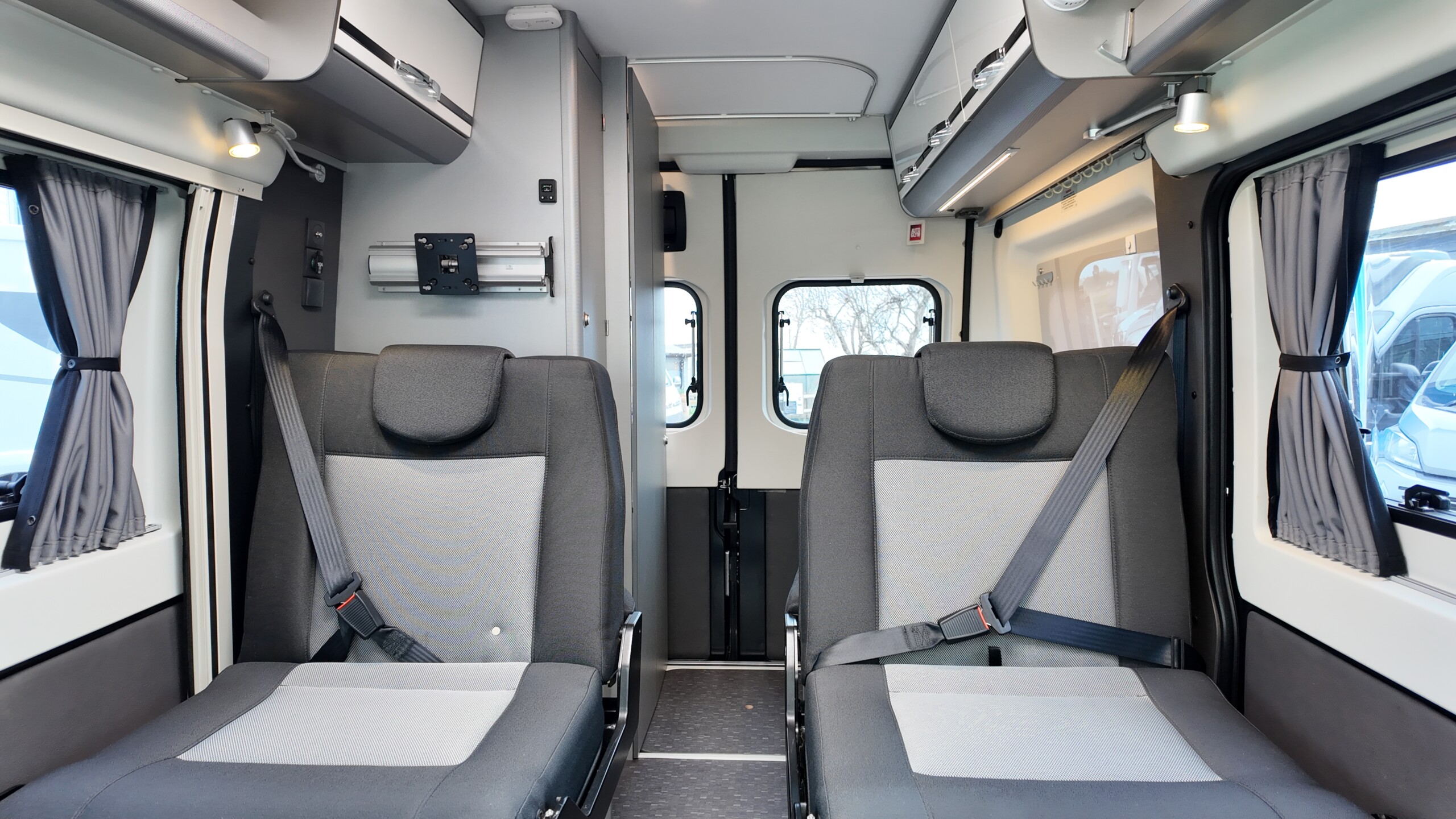 The lounge seats effortlessly transform into two longitudinal single beds 1.95m x 0.70m (approx. 6’4″ x 2’3″). The two forward-facing rear travel seats feature a “slide and drop” mechanism. You pull the seat base forward towards the swivelled front cab seats and fold the backrest flat to bridge the gap.