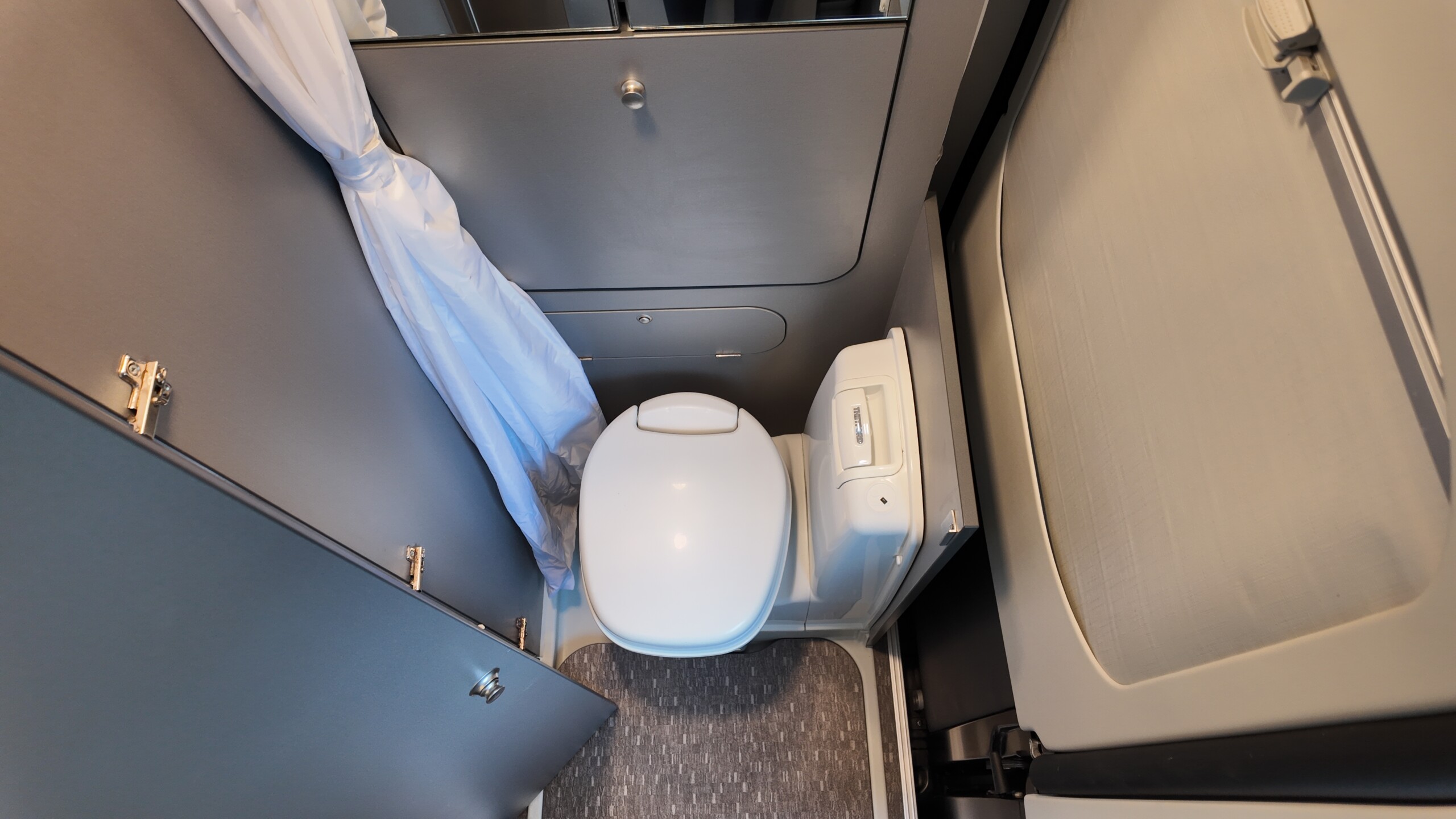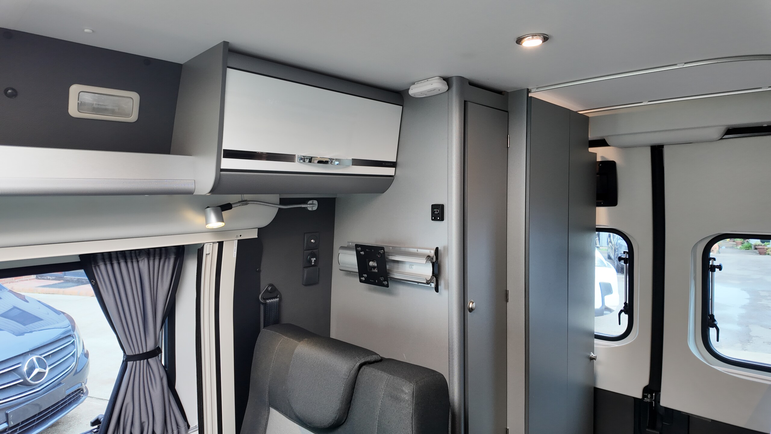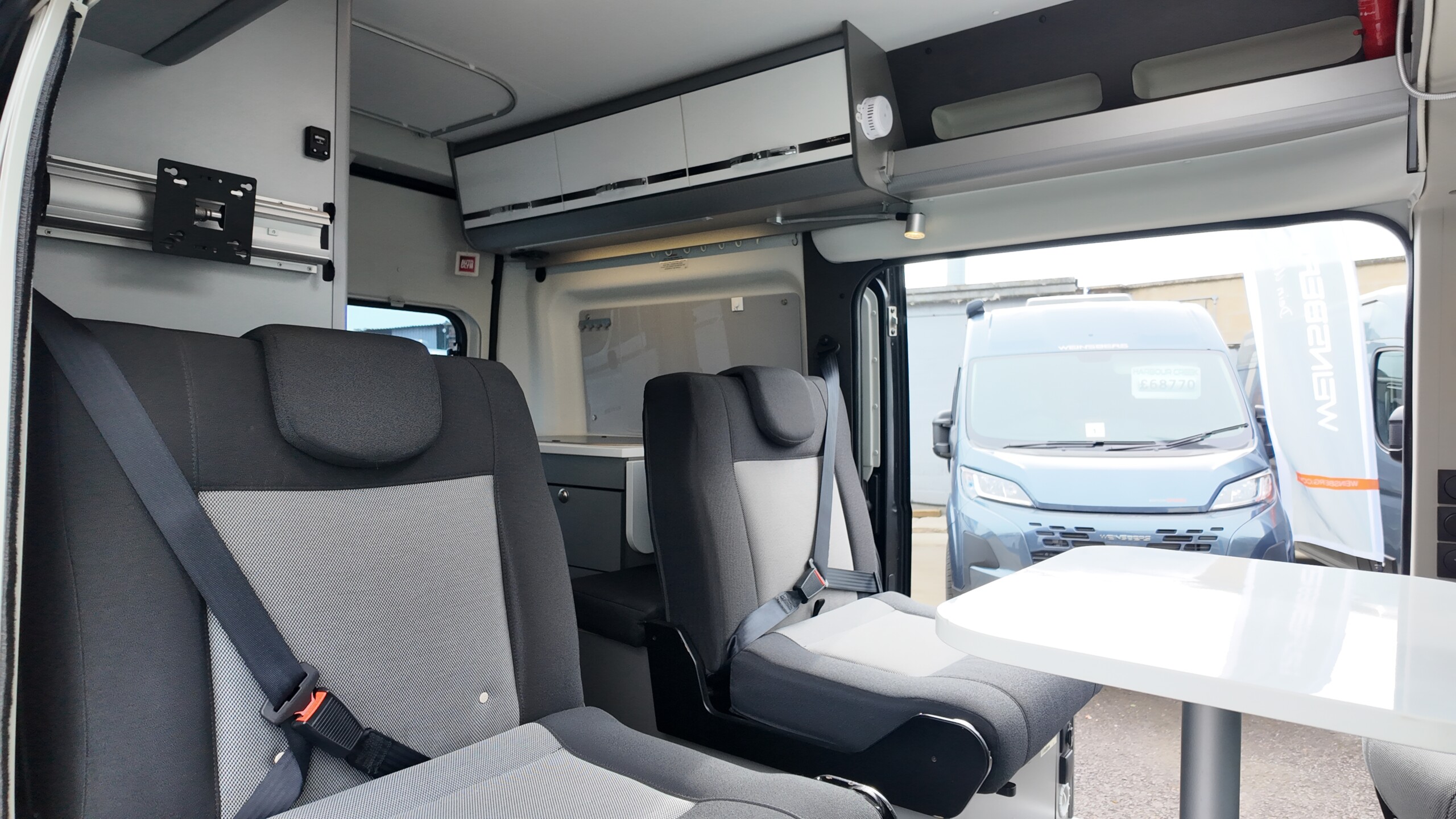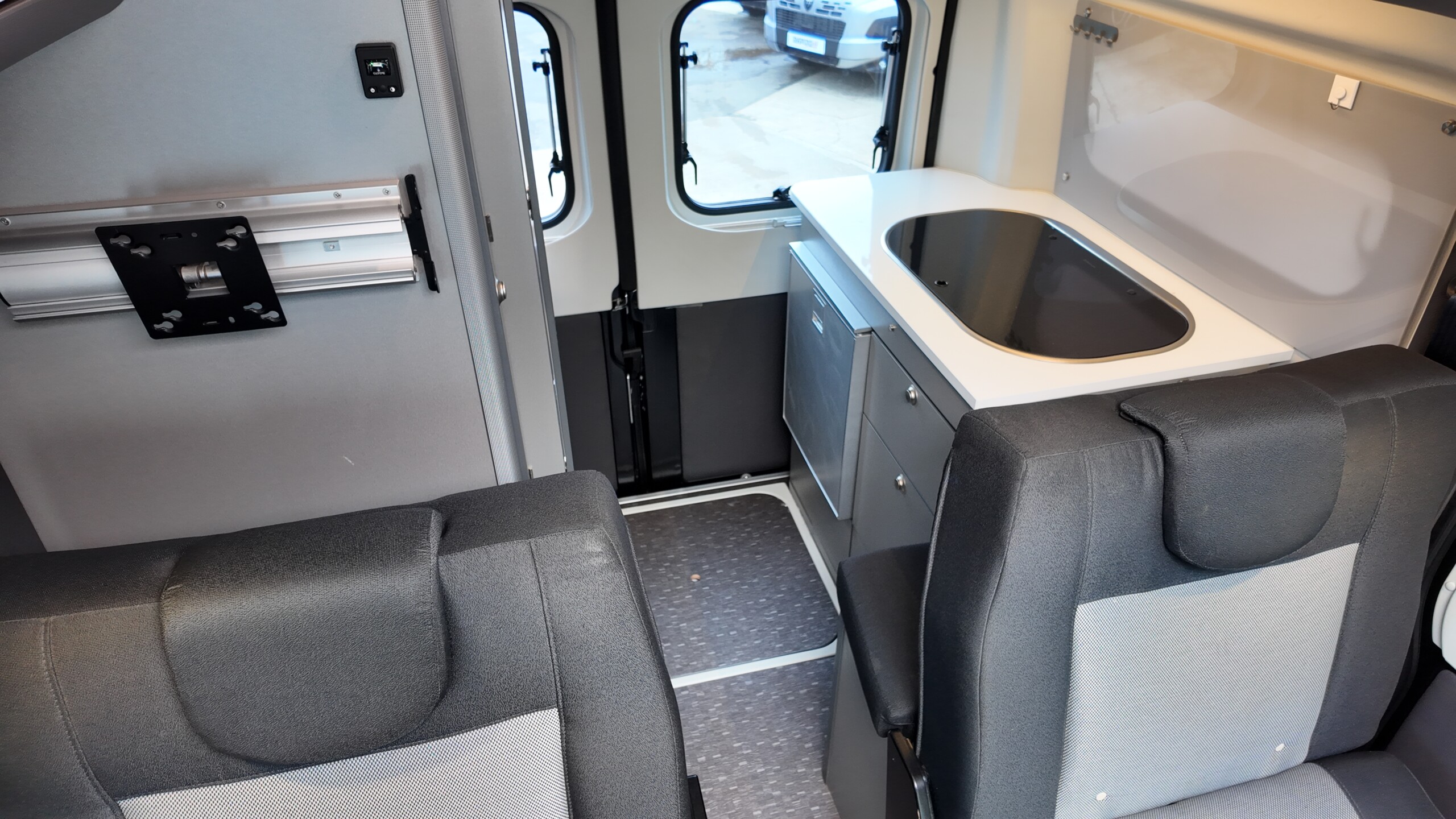 The lounge seats effortlessly transform into two longitudinal single beds 1.95m x 0.70m (approx. 6’4″ x 2’3″). The two forward-facing rear travel seats feature a “slide and drop” mechanism. You pull the seat base forward towards the swivelled front cab seats and fold the backrest flat to bridge the gap.