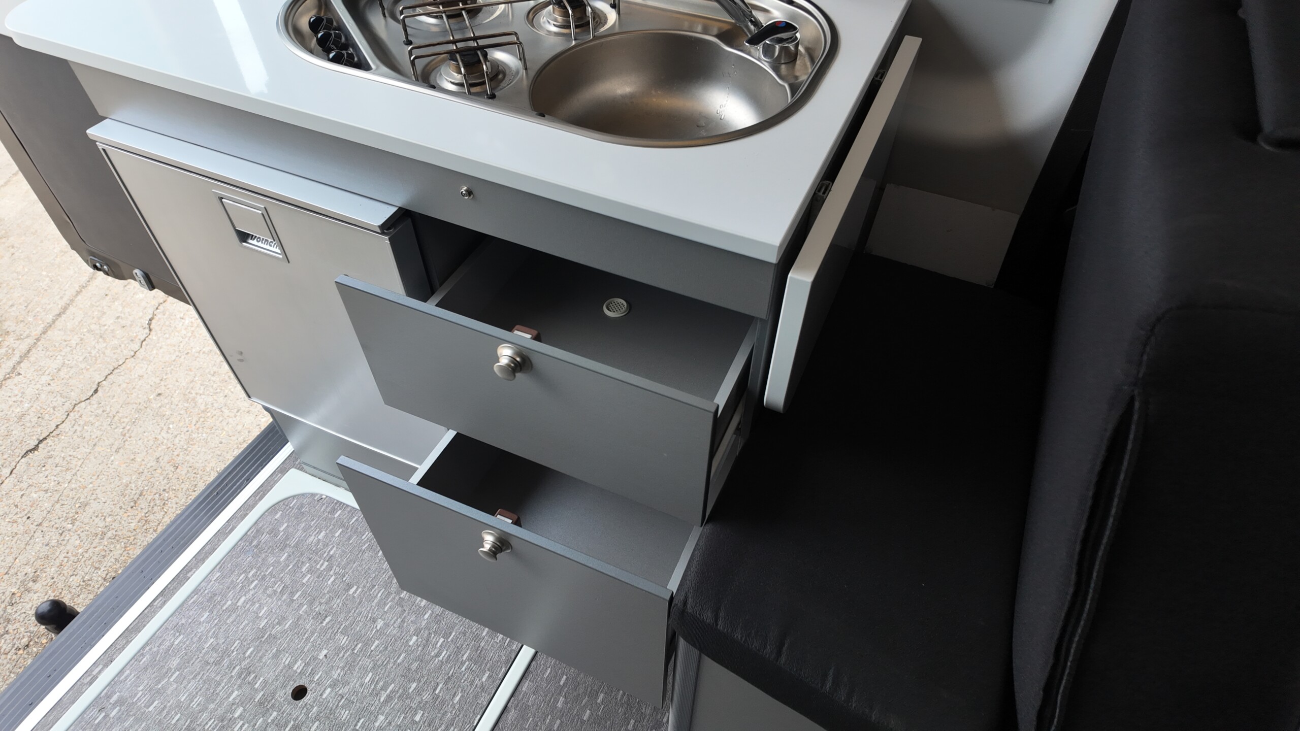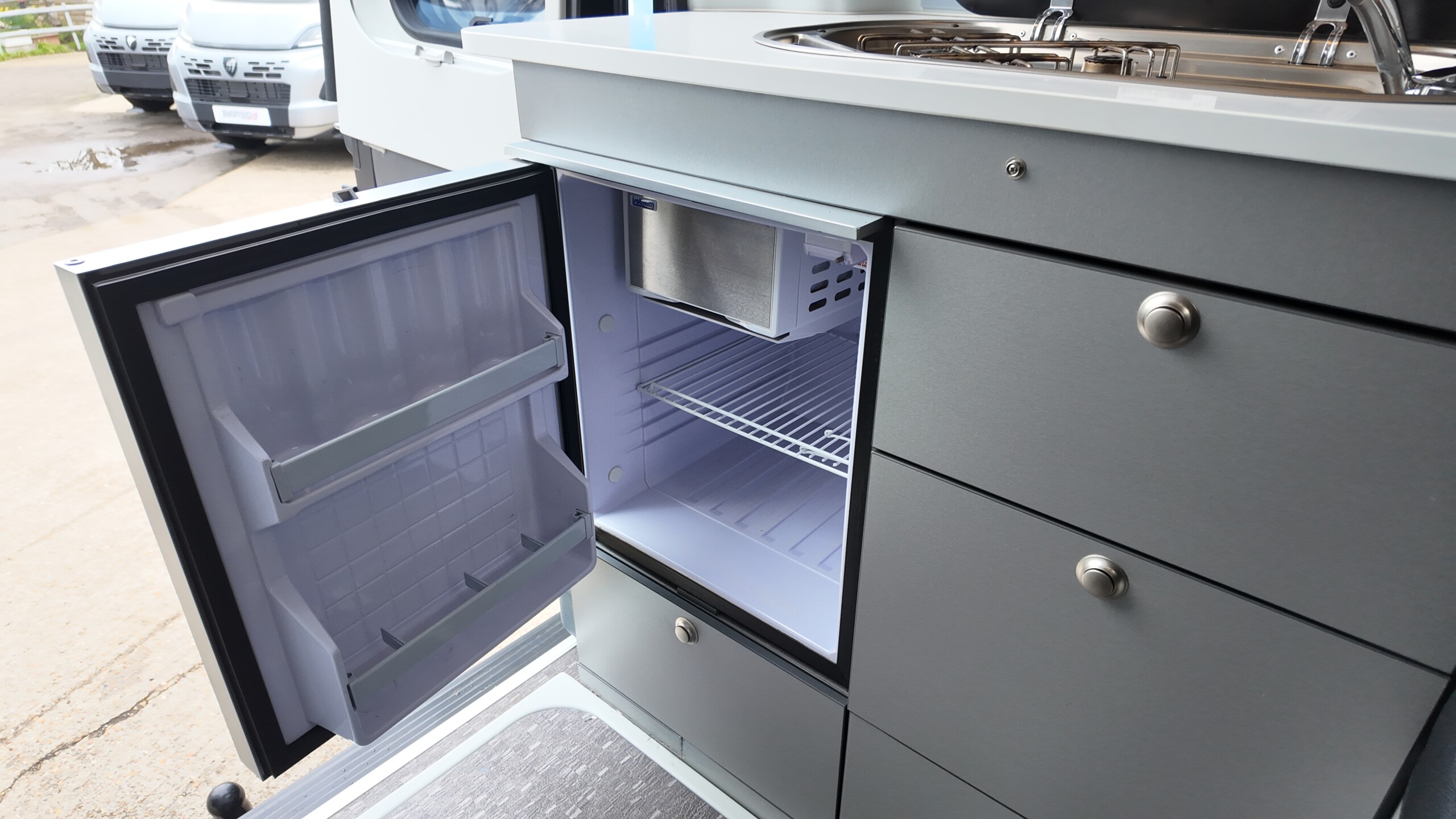 The rear kitchen is located on the nearside, the galley includes a three-burner gas hob, a circular sink, and a 65-litre compressor fridge with a freezer compartment. It also features a flip-up worktop extension for extra preparation space.