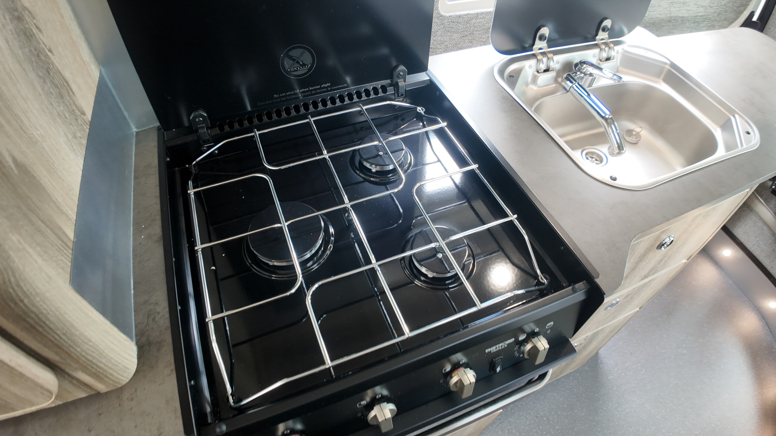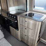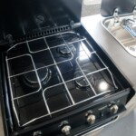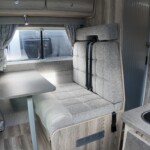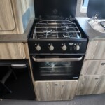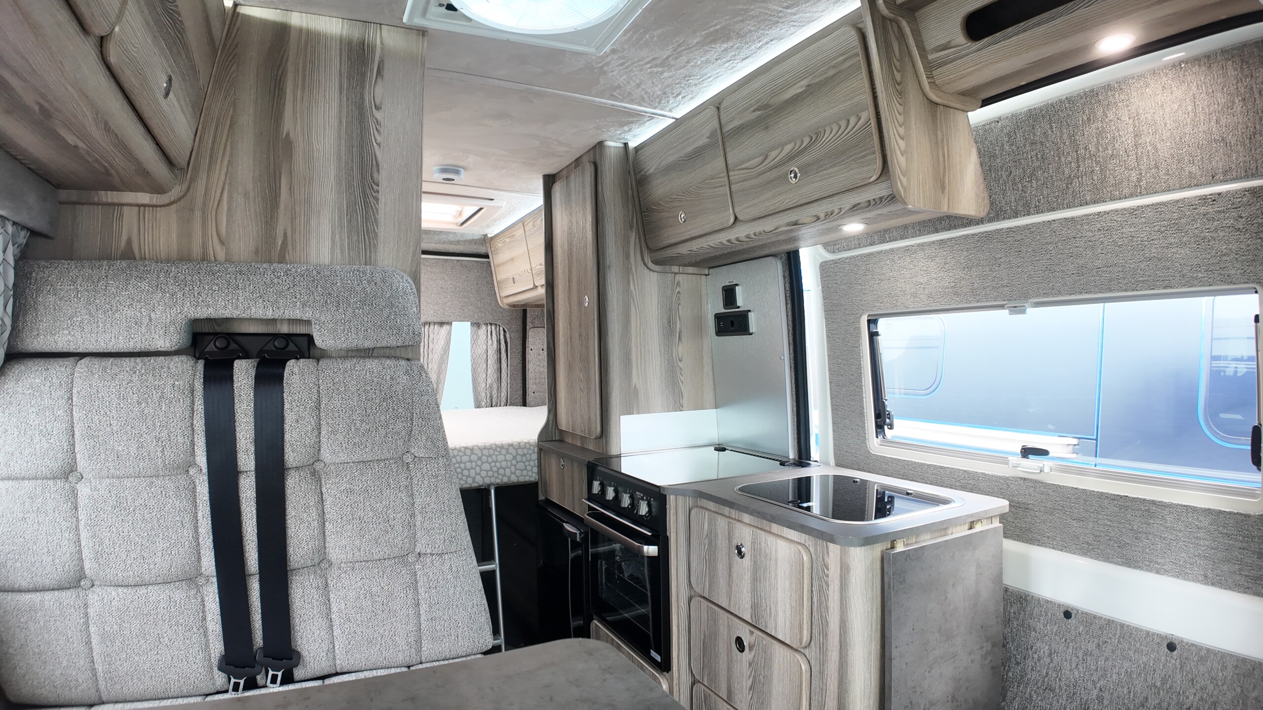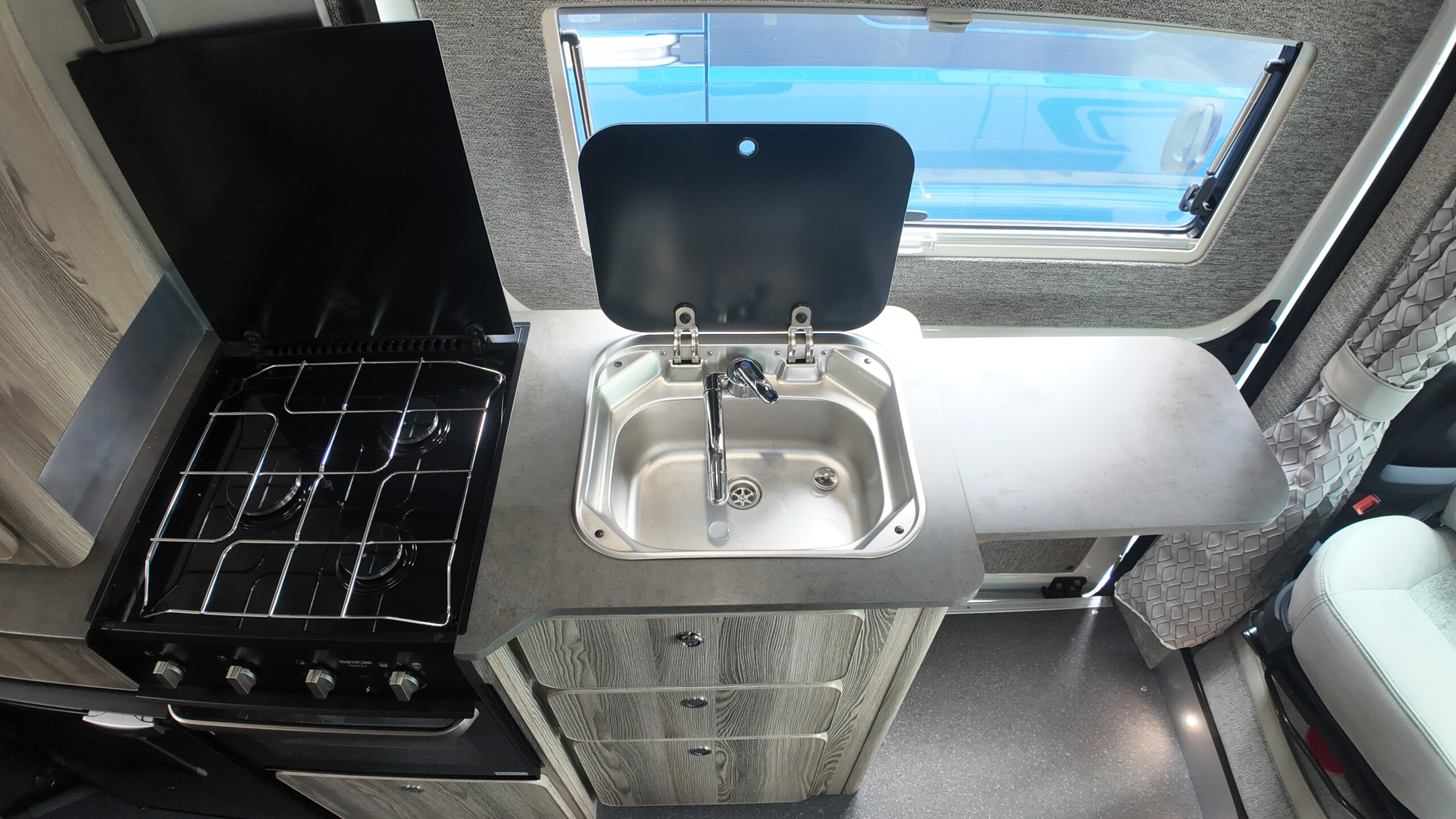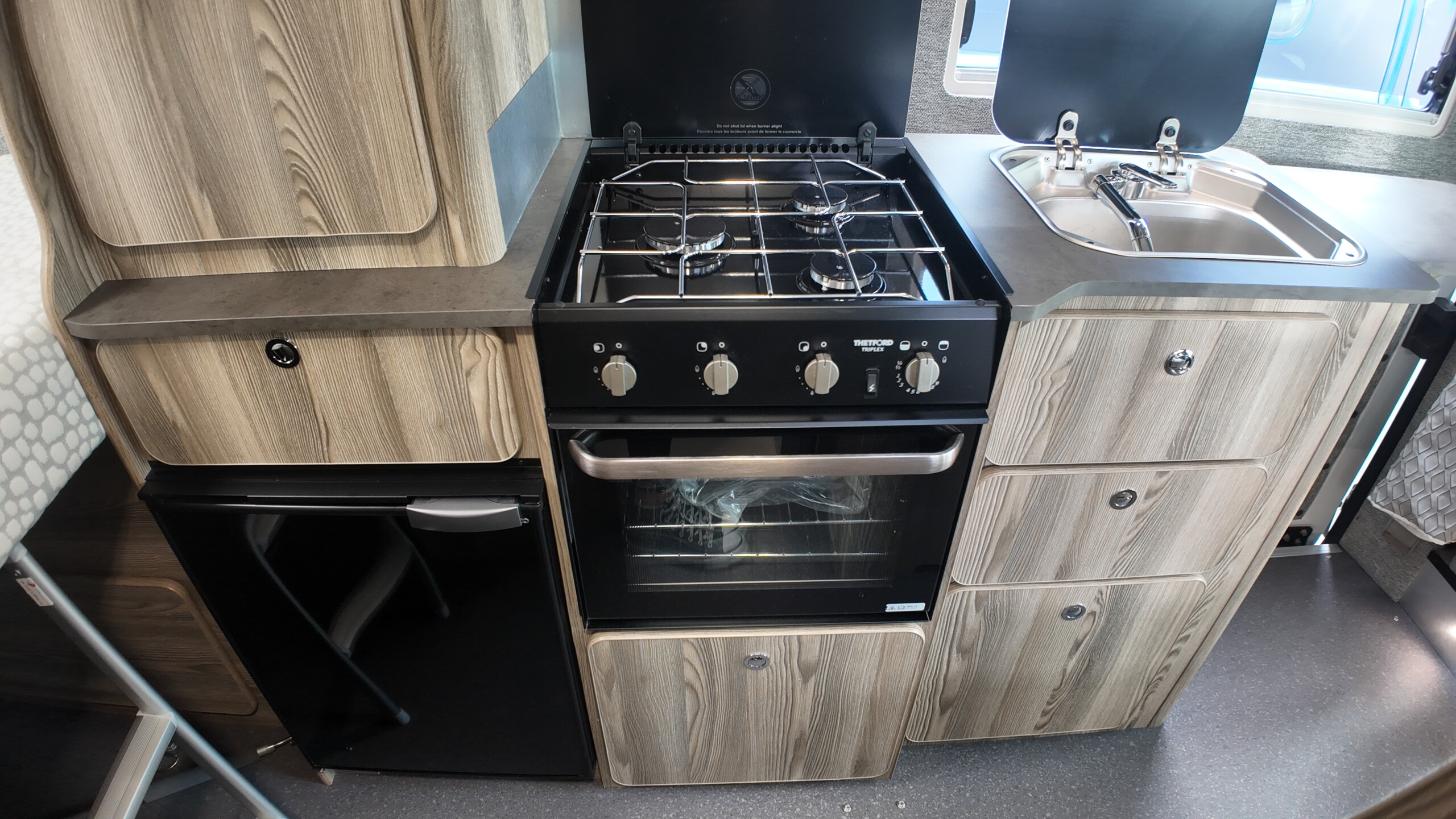 Two captains chairs swivel round to create the lounge at the front, leaving no wasted space. The kitchen is fitted with a Thetford Triple X oven that also has a grill feature. In both the kitchen & washroom, the sink offers hot & cold water courtesy of the Truma Combi boiler that is powered by either gas or mains electric.