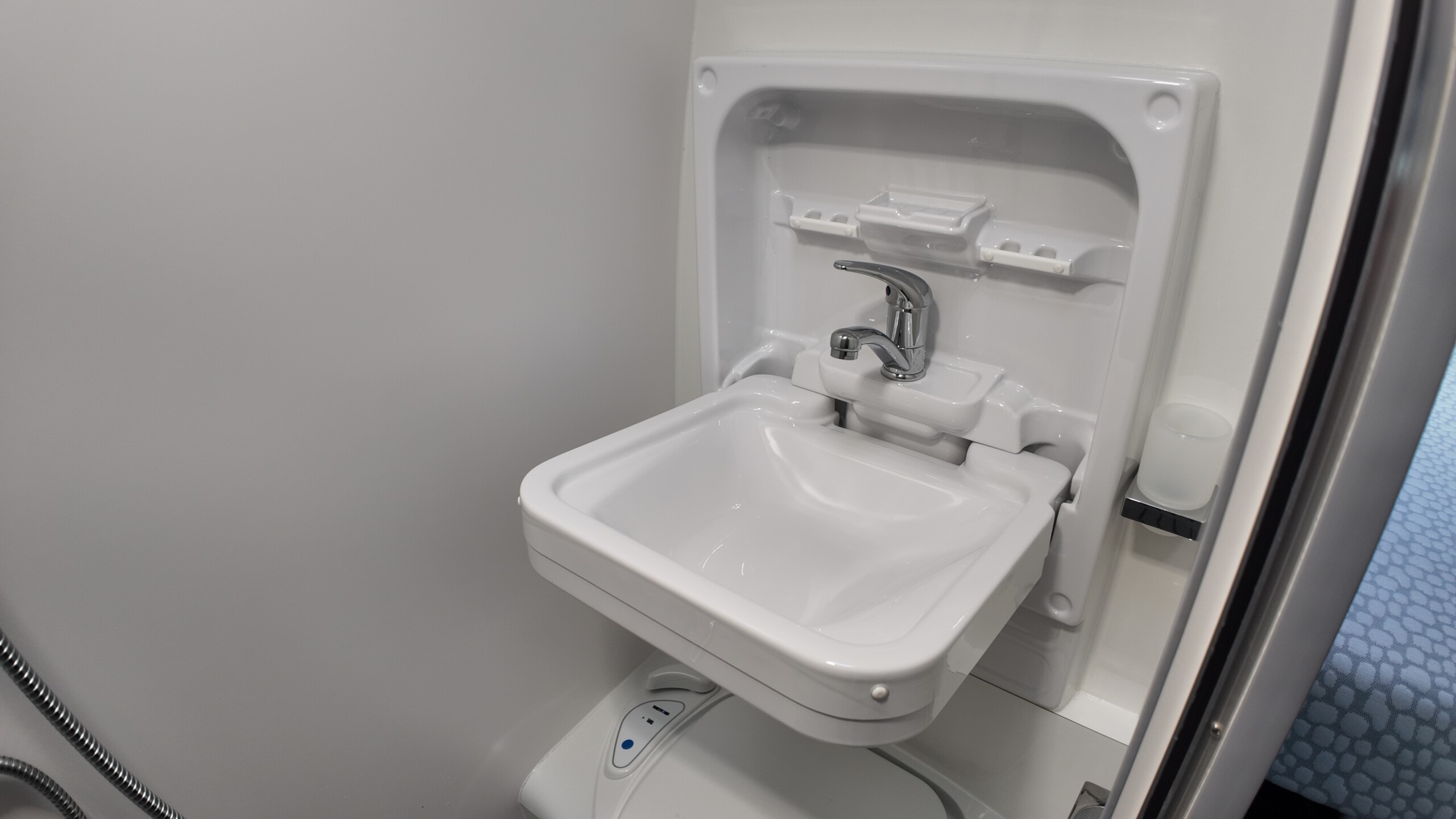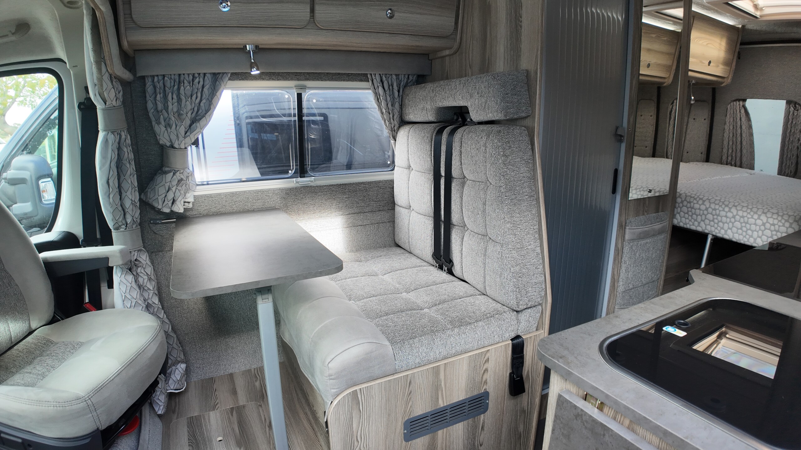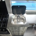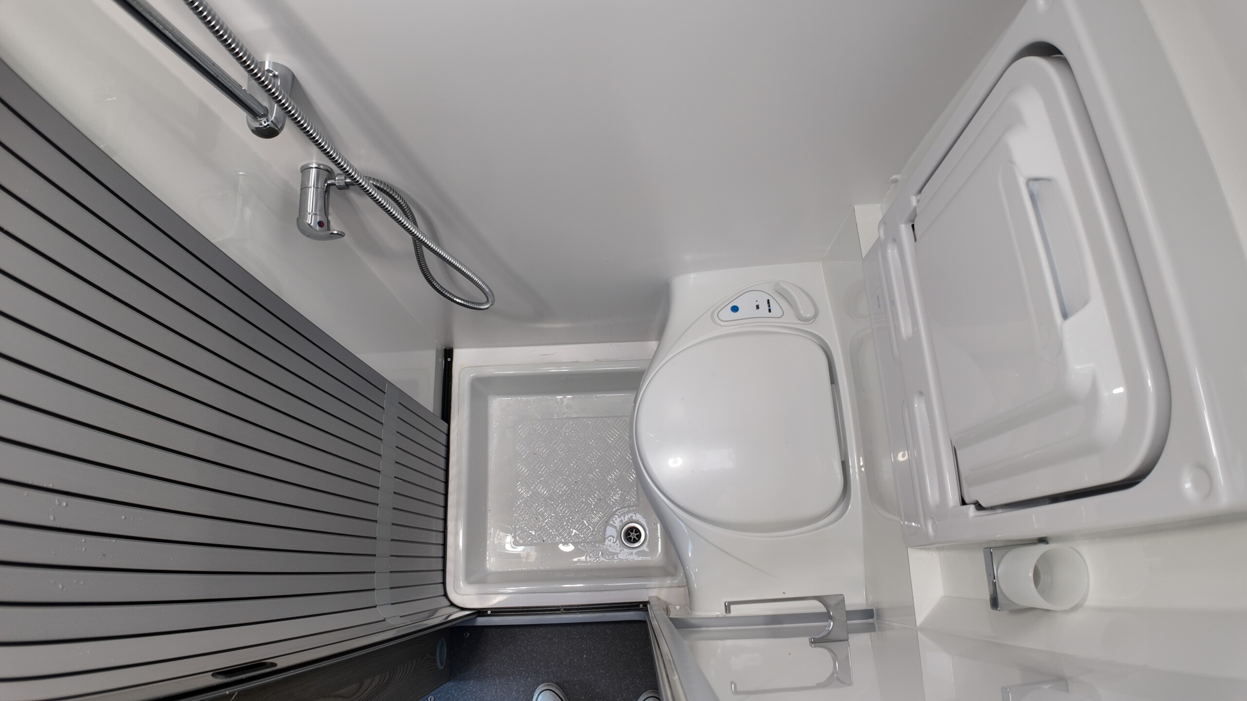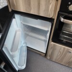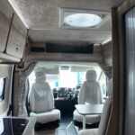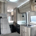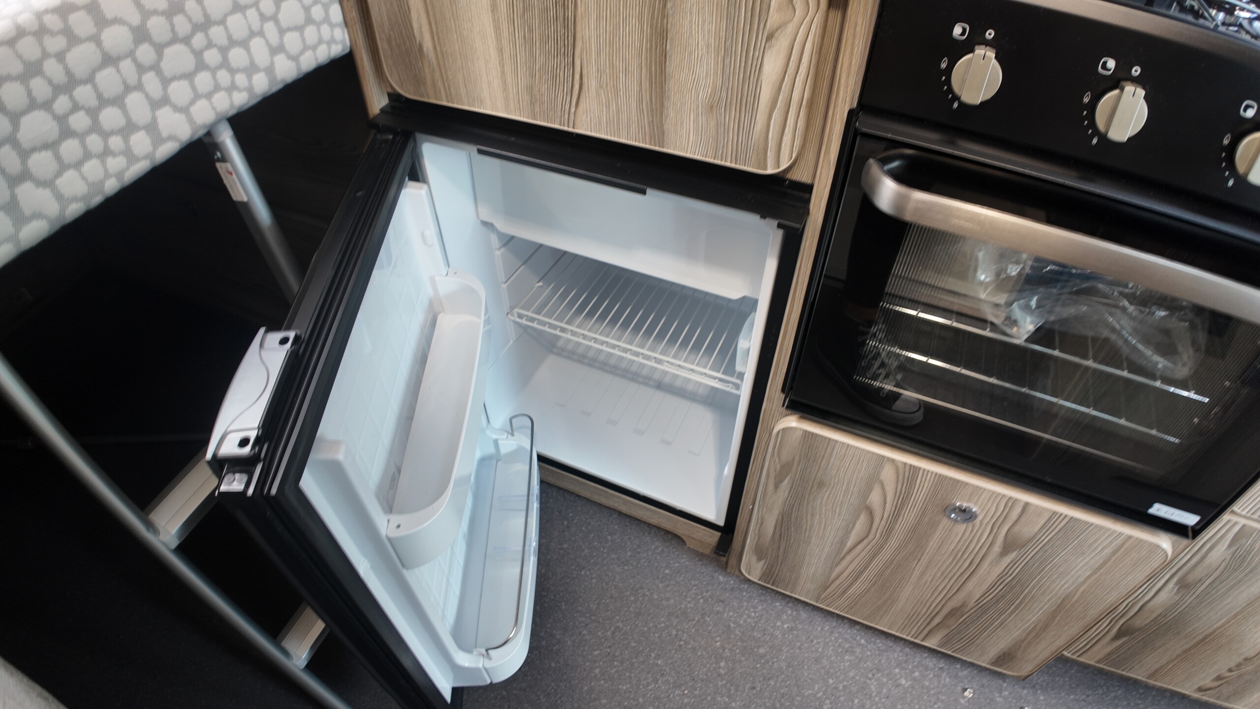Two captains chairs swivel round to create the lounge at the front, leaving no wasted space. The kitchen is fitted with a Thetford Triple X oven that also has a grill feature. In both the kitchen & washroom, the sink offers hot & cold water courtesy of the Truma Combi boiler that is powered by either gas or mains electric.