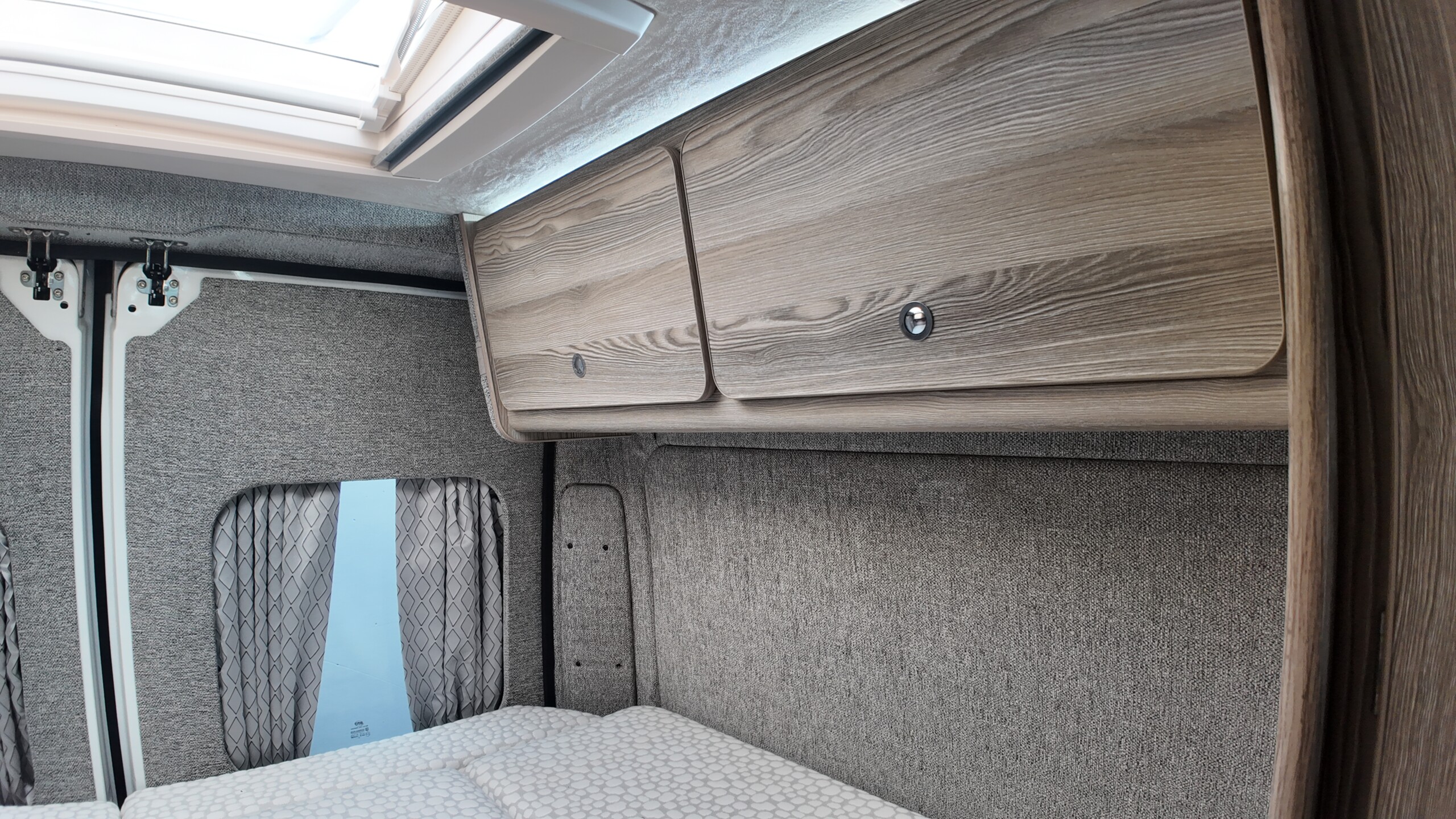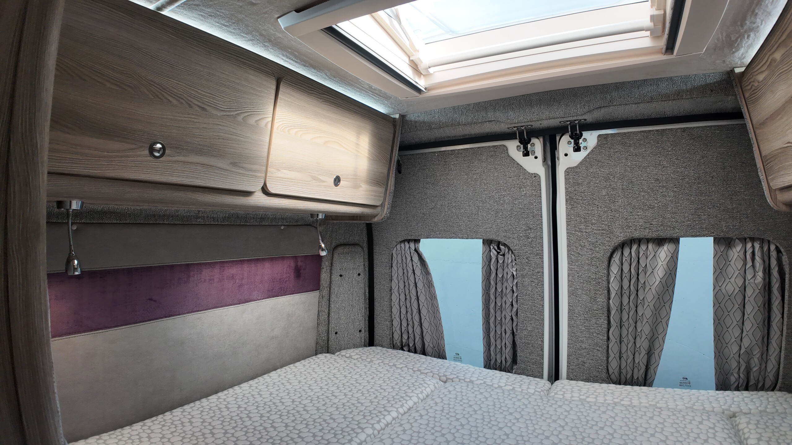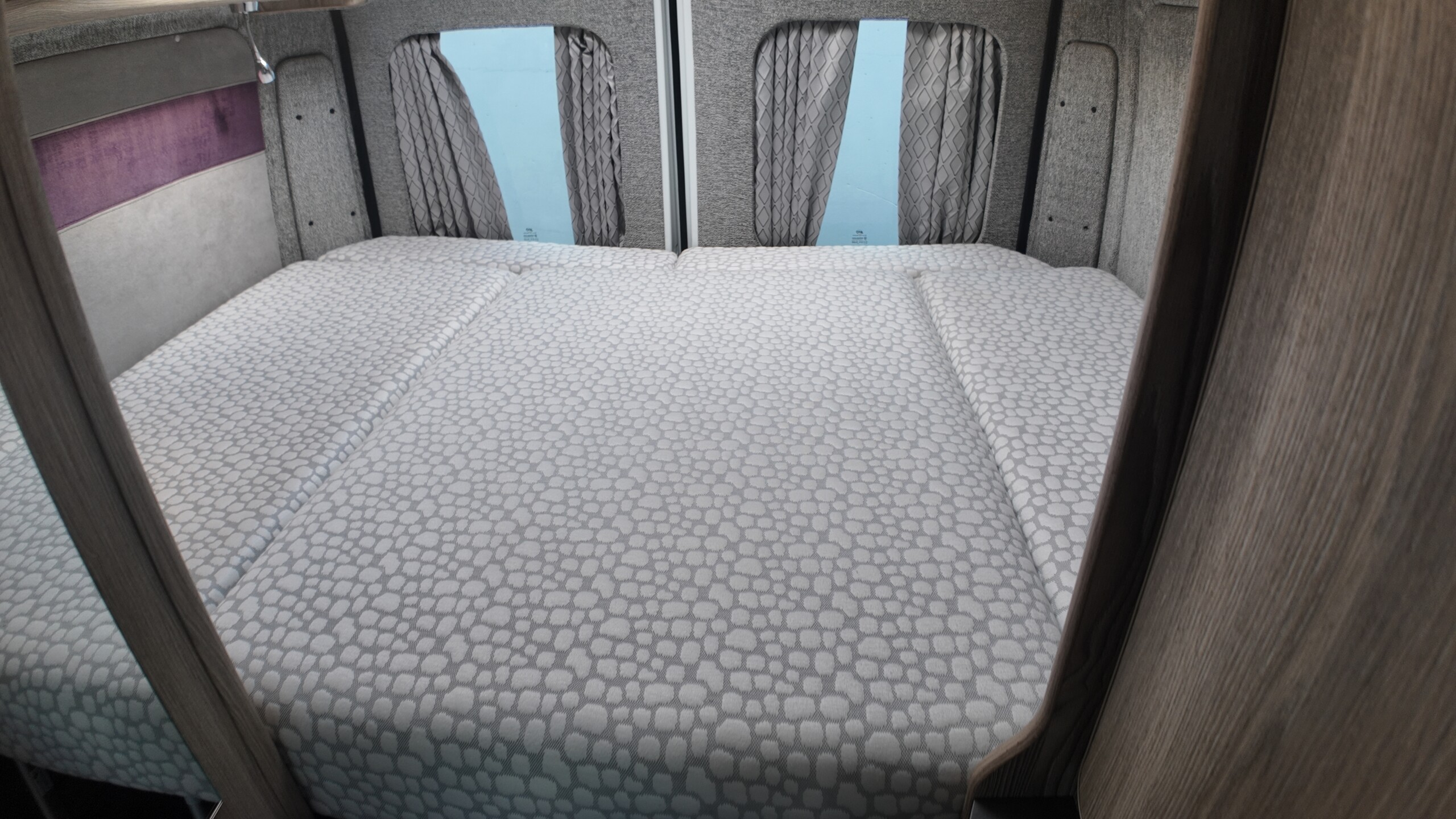 The RB (Rear bed) features an exceptionally comfy fixed transverse bed across the rear with garage space underneath, overall sleeping 2 with 4 travelling seats.