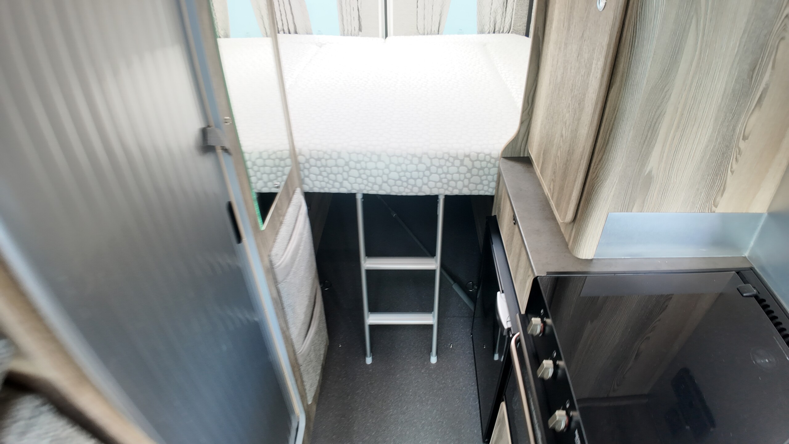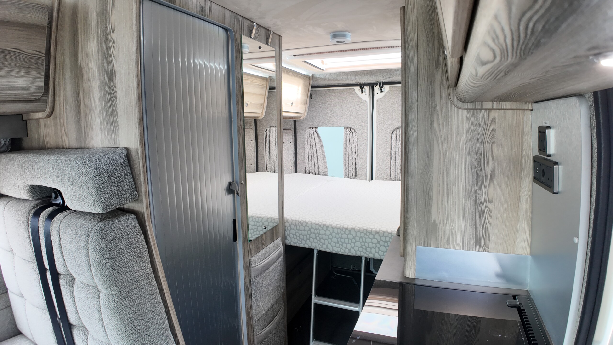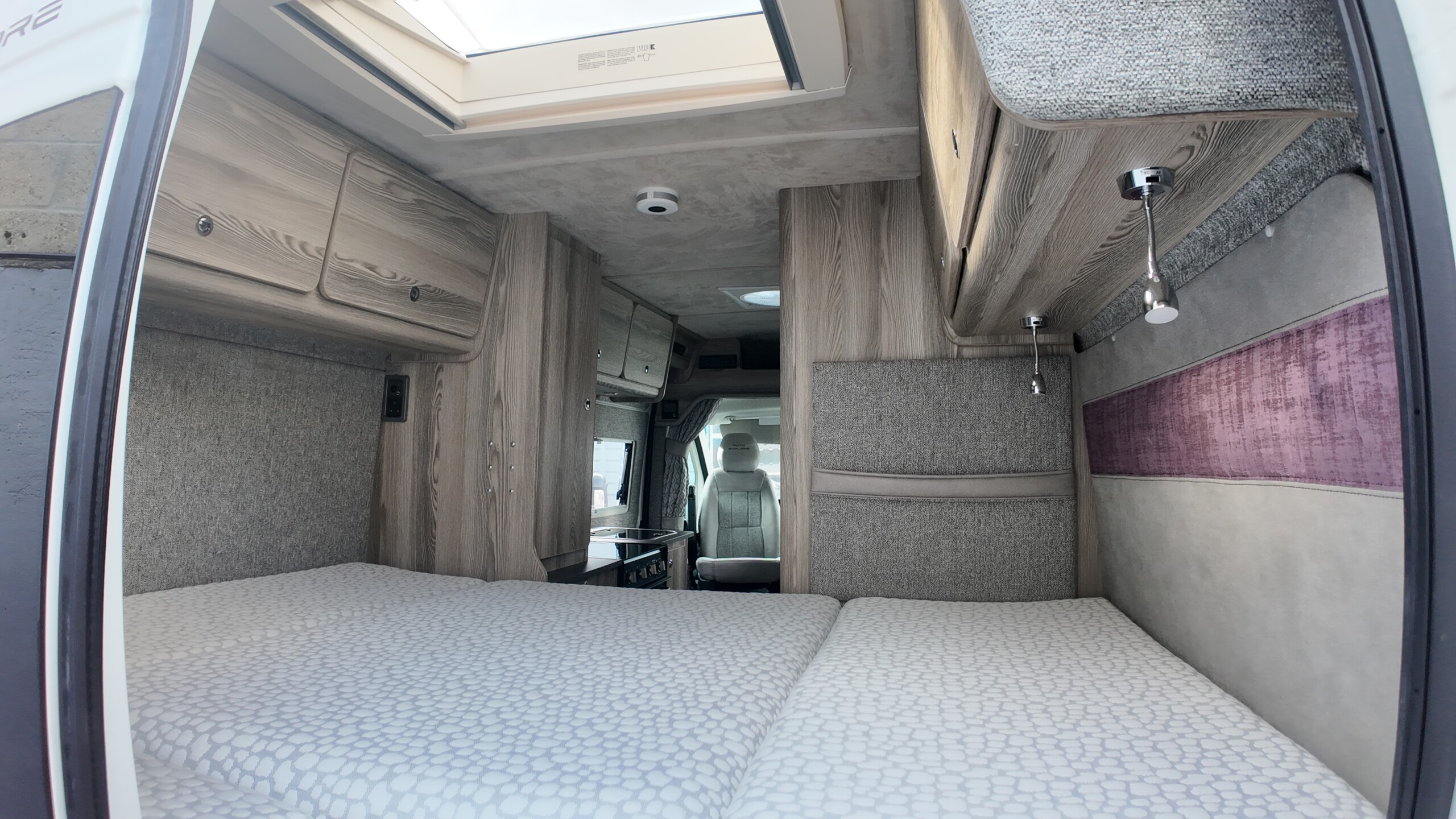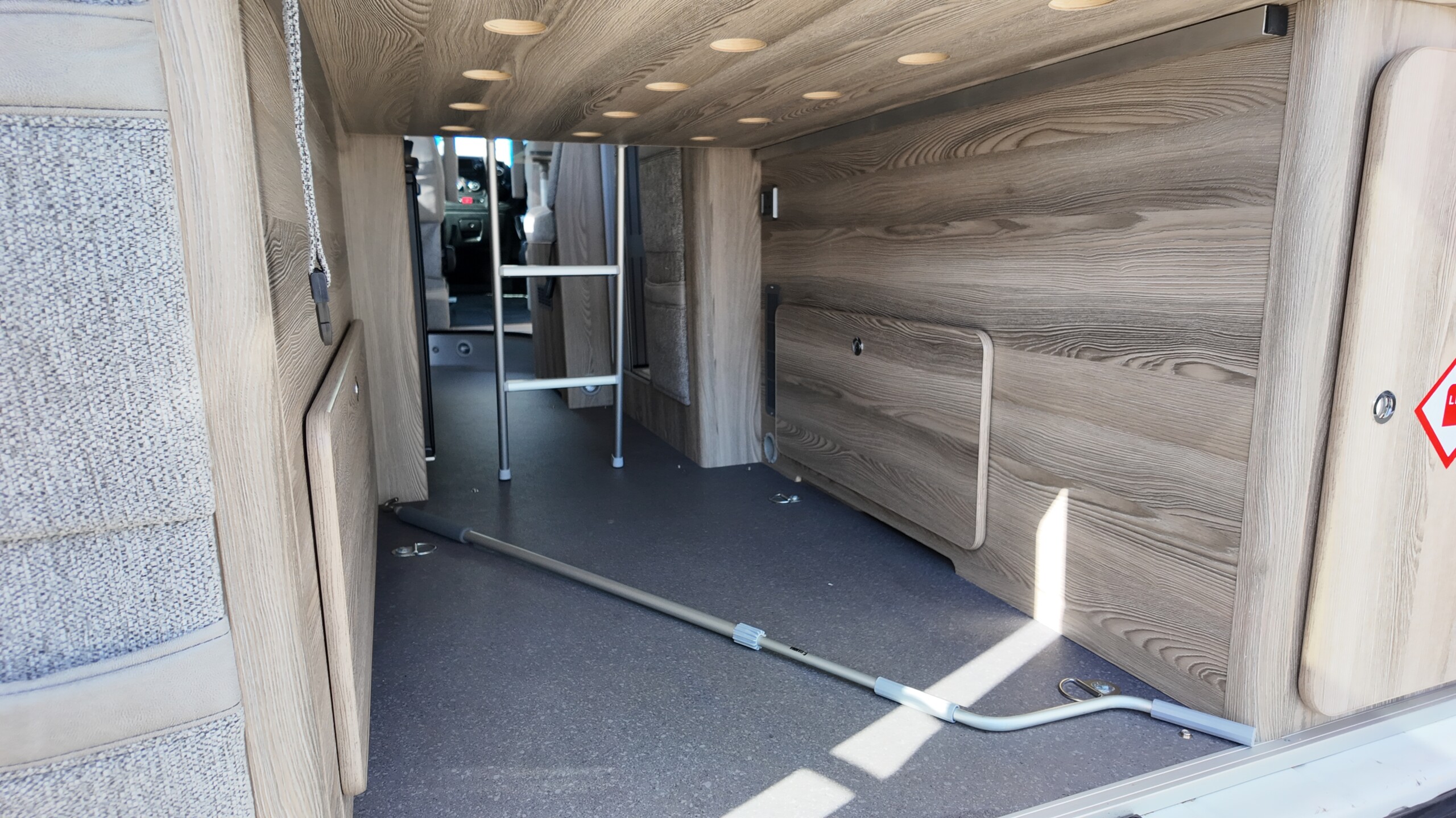 The RB (Rear bed) features an exceptionally comfy fixed transverse bed across the rear with garage space underneath, overall sleeping 2 with 4 travelling seats.