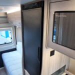 To the nearside alongside the hab door is a fully equipped kitchen with 3-gas hob, sink with hot and cold running water, combination oven/grill and fridge freezer set at eye level. A wardrobe is below the fridge freezer.