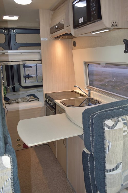 The Front Lounge and Dining area easily Converts to a Large DOUBLE BED.. The Rear BUNK BEDS are Full Adult Size, so Sleeps 4 x Adults very Comfortably. This Bunks have Privacy Curtains, and they each have a Storage Cabinet. The Lower Bunk has lots of Storage under it as well. We have 2 removable Dining Tables which simply store away. We also have a Large OverCab Storage Cupboard with LED lighting. There are a Total of 4 x 3 point Seat Belts, so you can take your Friends or Family with you.. There is also an Electric Entrance Step.