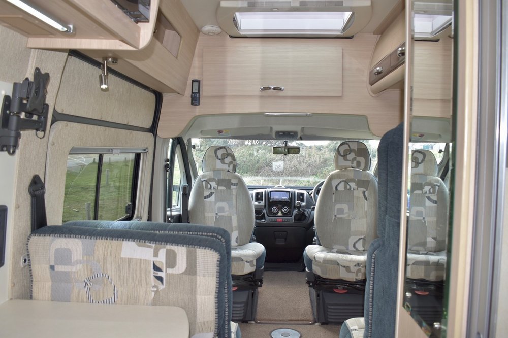 The very comfortable Cab gives you a commanding driving position and has All Round Sliding Cabin Blinds, Air Conditioning plus the Pioneer Multi Media System with built in Sat Nav etc. Plus we have the Separate Large Screen Reversing Camera Monitor, Cruise Control, Electric Windows and Door Mirrors and Central Locking etc.. The Two Cab Seats Swivel to become part of the Lounge and Dining area.