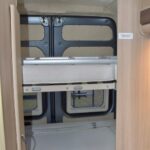 The Shower Room has a flushing TOILET with a Thetford cassette, a Sliding Washbasin and a Shower and a roof vent, plus a sliding Tambour Door.