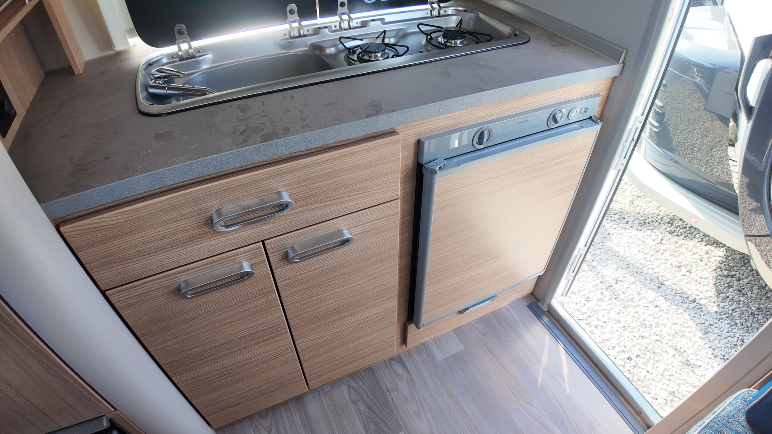 The kitchen is fully equipped for all of your culinary needs with a high-quality 2-burner cooker-sink combination and plenty of storage space for all of your supplies and equipment. There’s also the option to switch one of the storage cabinets for a 60 litre fridge with a freezer compartment. A glass cover for the hob and sink creates some extra surface space for food preparation.