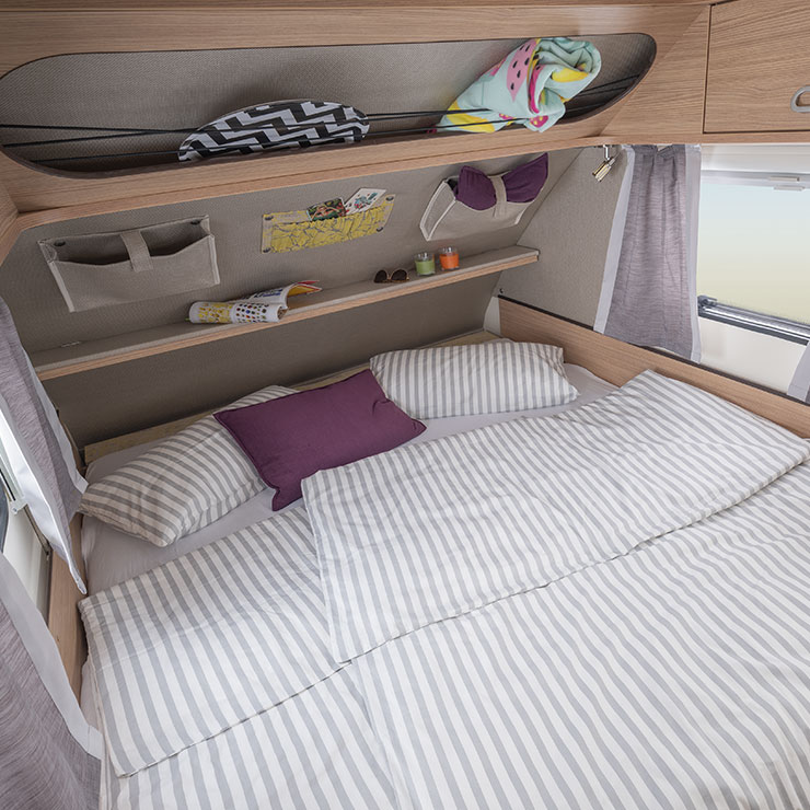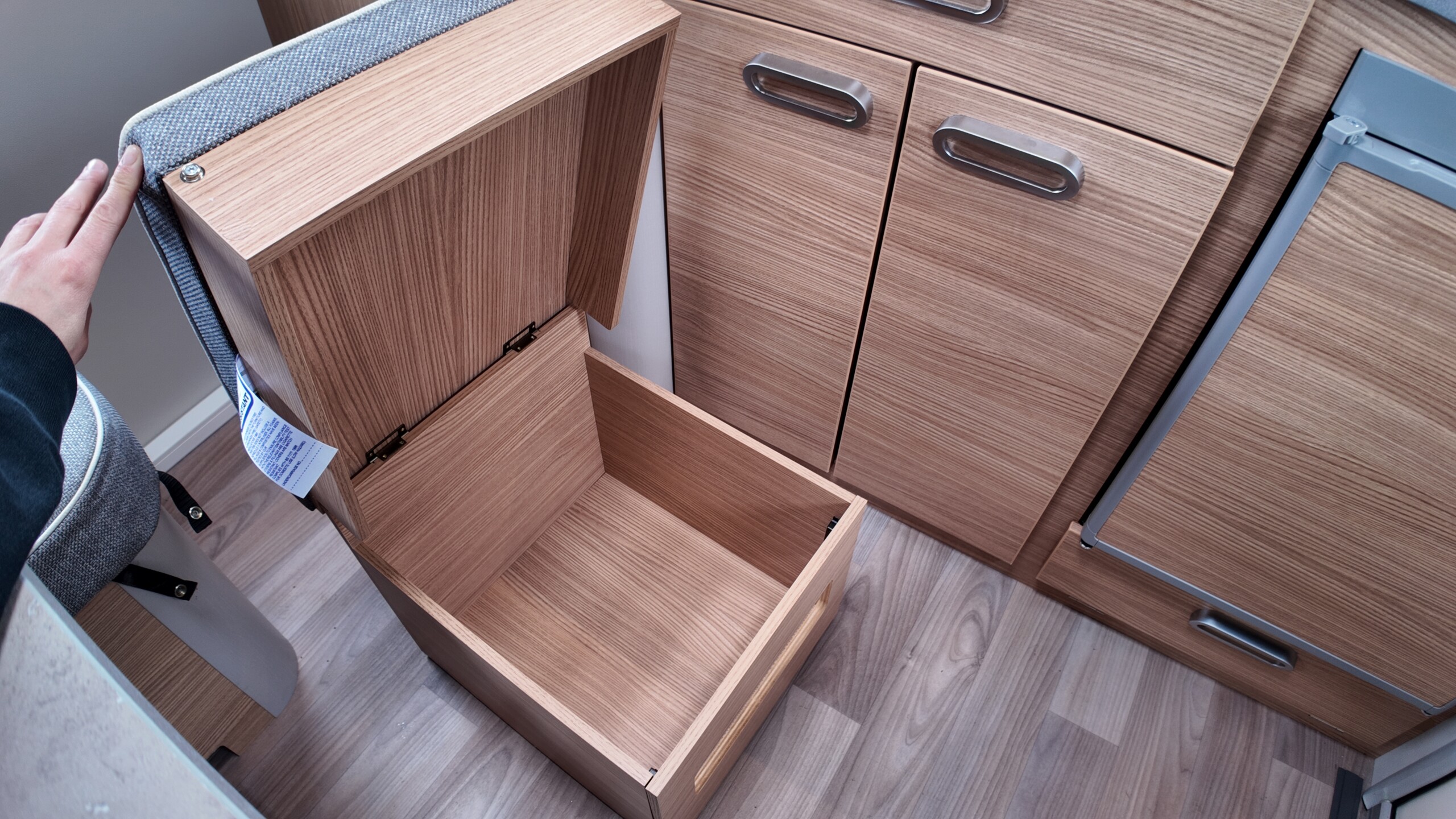 The kitchen is fully equipped for all of your culinary needs with a high-quality 2-burner cooker-sink combination and plenty of storage space for all of your supplies and equipment. There’s also the option to switch one of the storage cabinets for a 60 litre fridge with a freezer compartment. A glass cover for the hob and sink creates some extra surface space for food preparation.