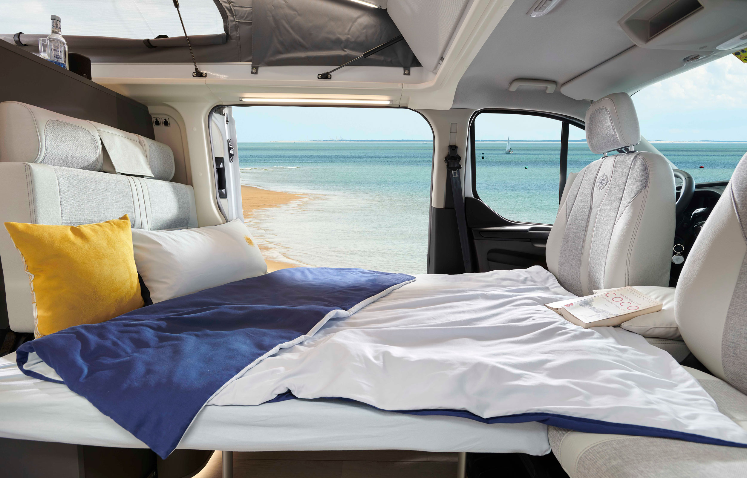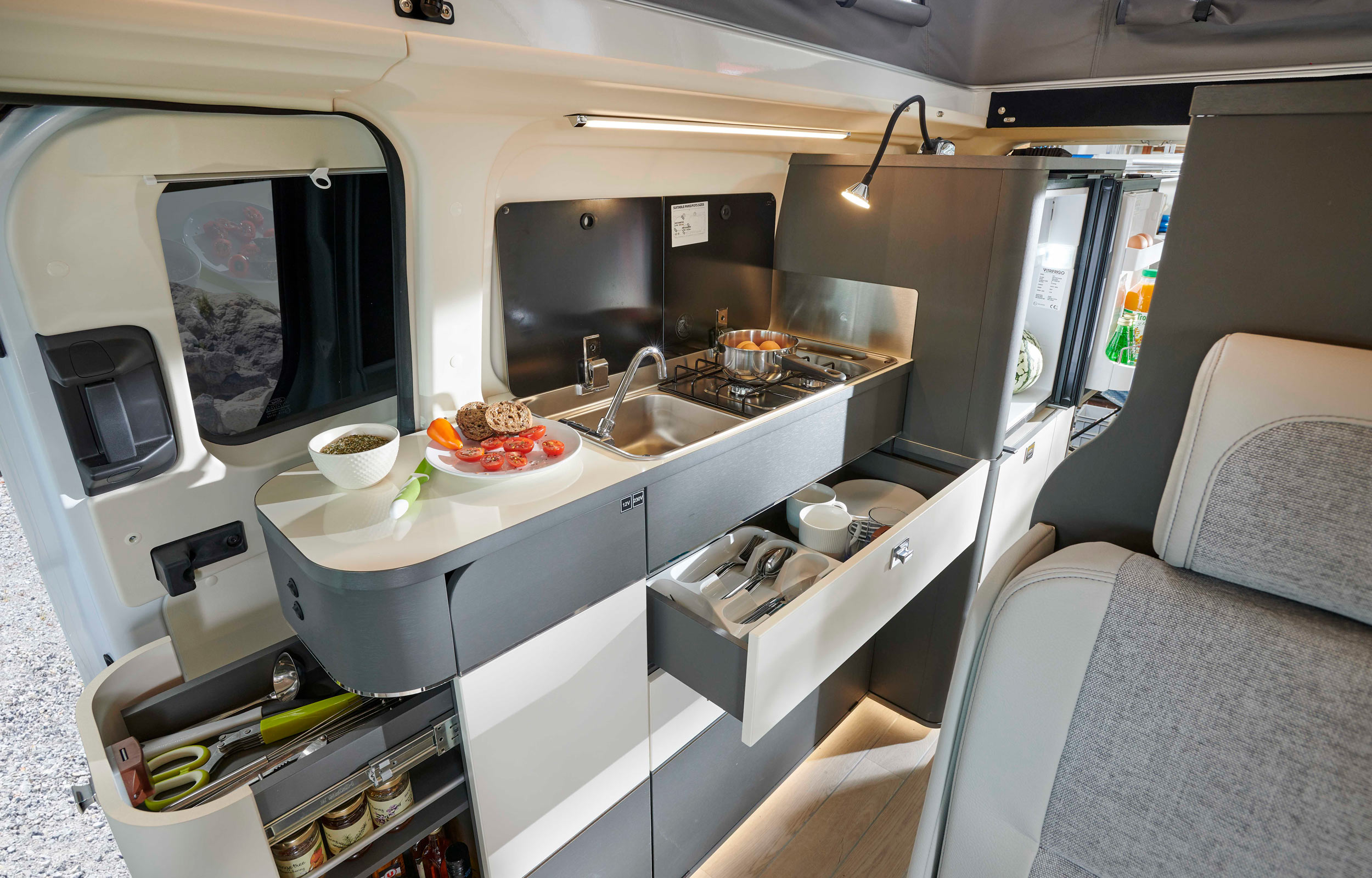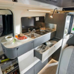 Keeping a similar concept to the Westfalia Kepler One and Jules Verne. The Westfalia Kelsey boats a sleek and stylish interior with four travelling seats and up to four berths.