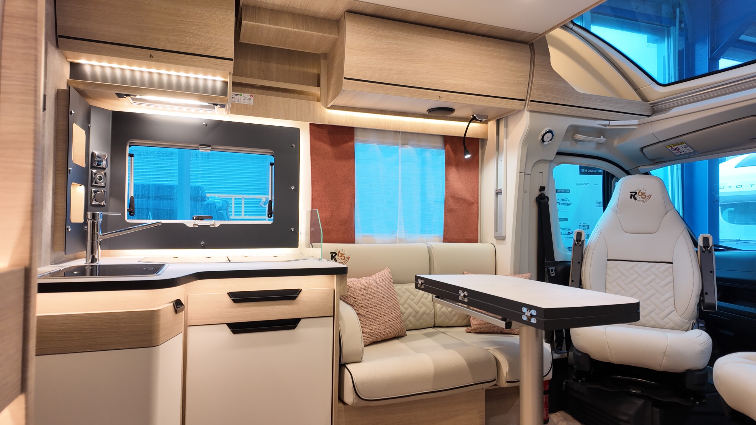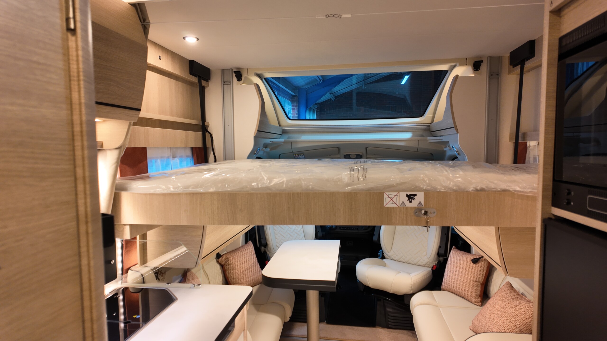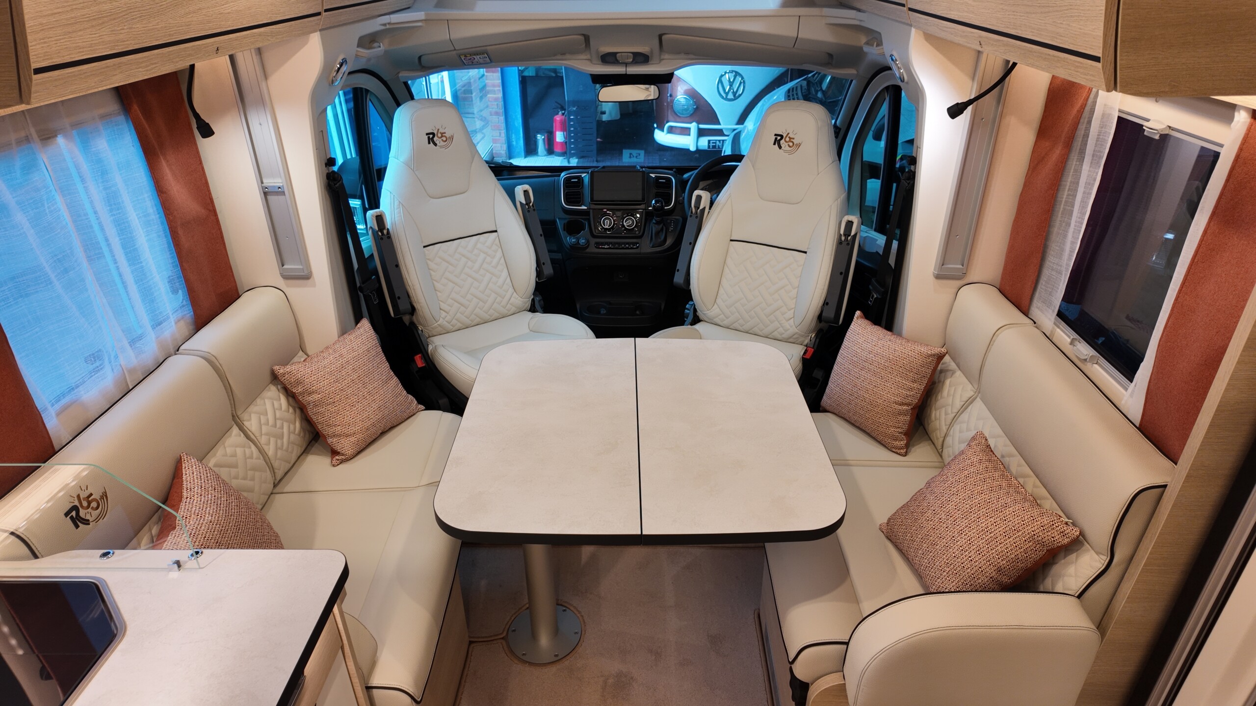 Immediately behind the cab is a large, open-plan living room with face-to-face (side-facing) bench seats and armrests. This design creates a spacious, social environment around a folding table and can be converted into forward-facing travel seats when on the move. An optional electric drop-down double bed is available above this area.