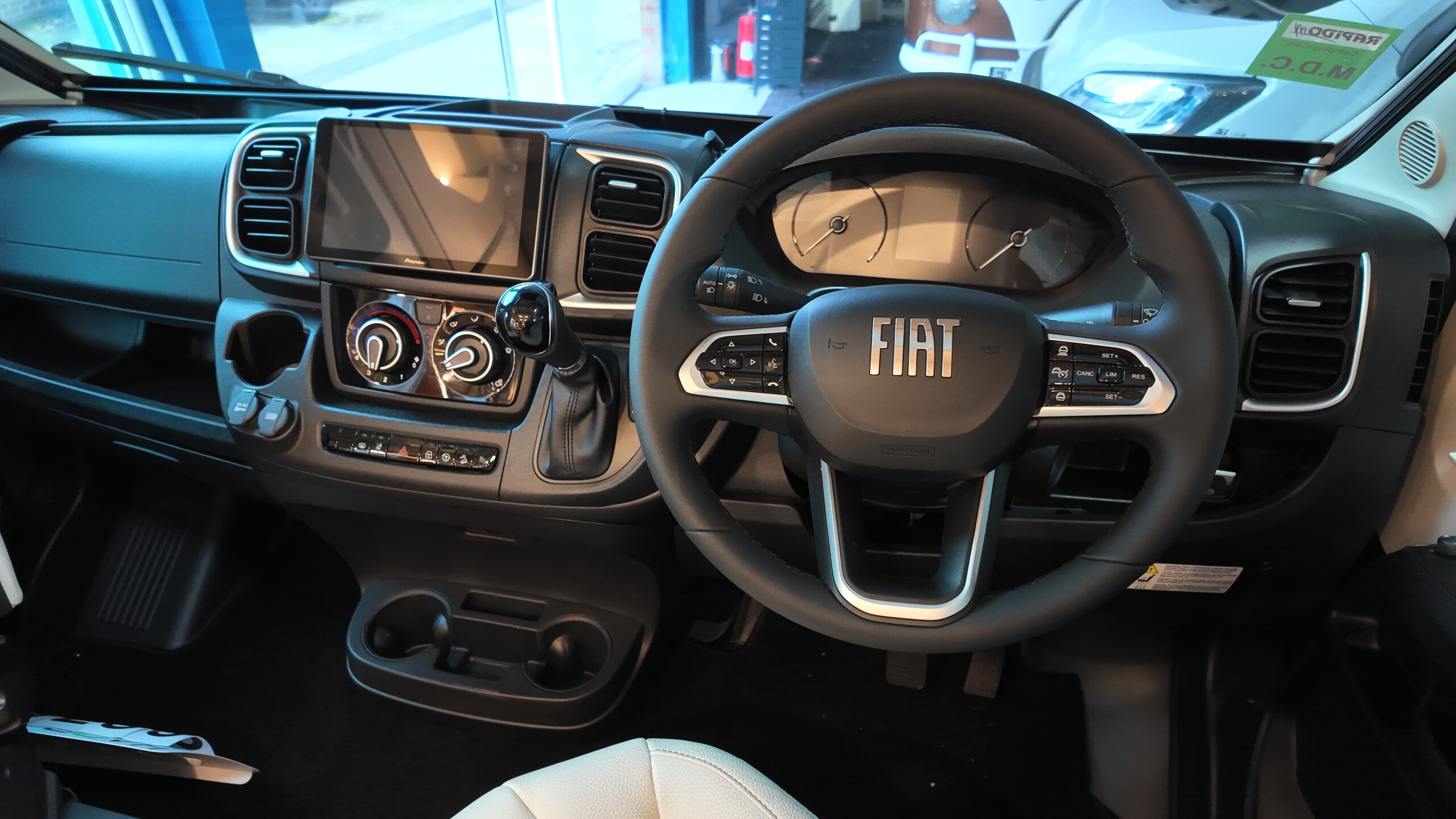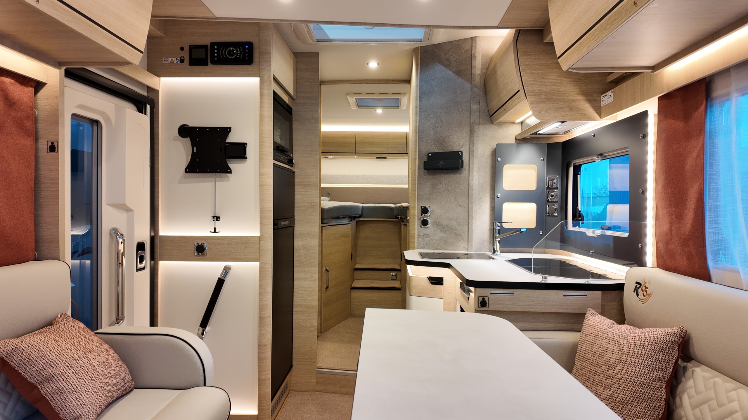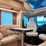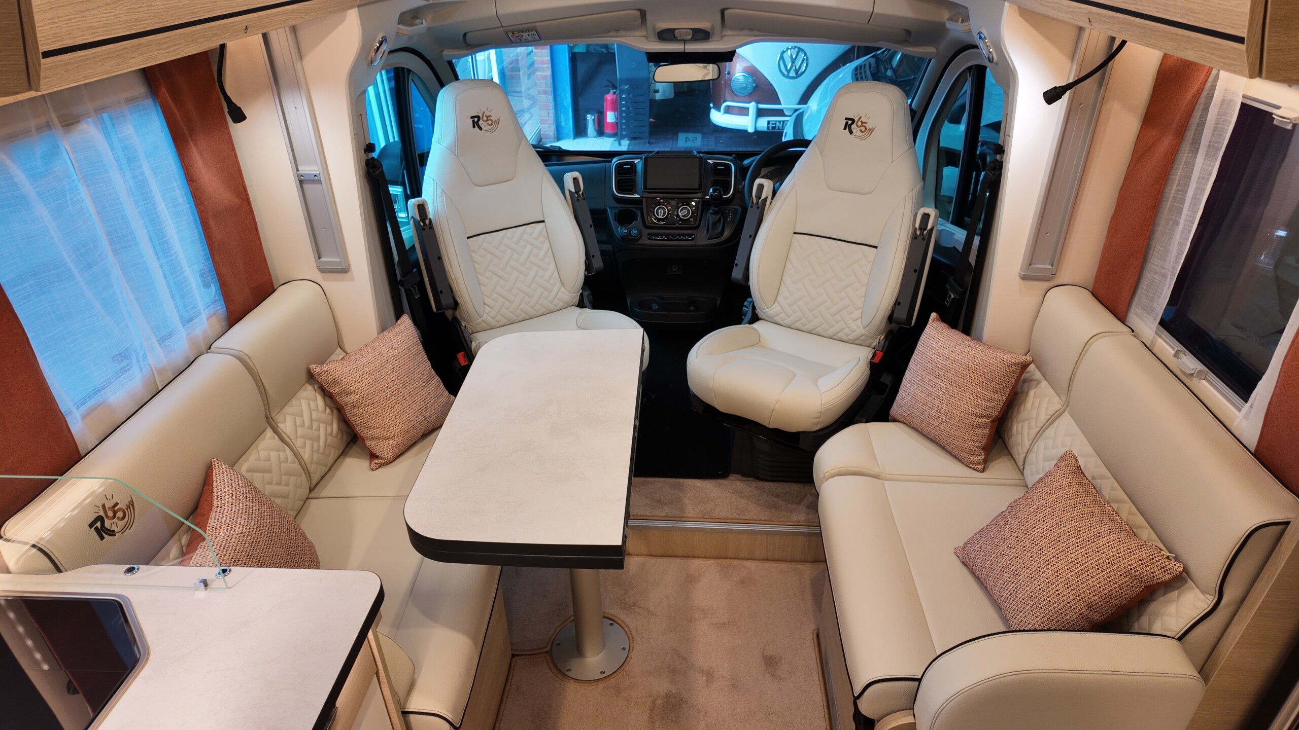 Immediately behind the cab is a large, open-plan living room with face-to-face (side-facing) bench seats and armrests. This design creates a spacious, social environment around a folding table and can be converted into forward-facing travel seats when on the move. An optional electric drop-down double bed is available above this area.