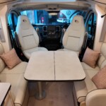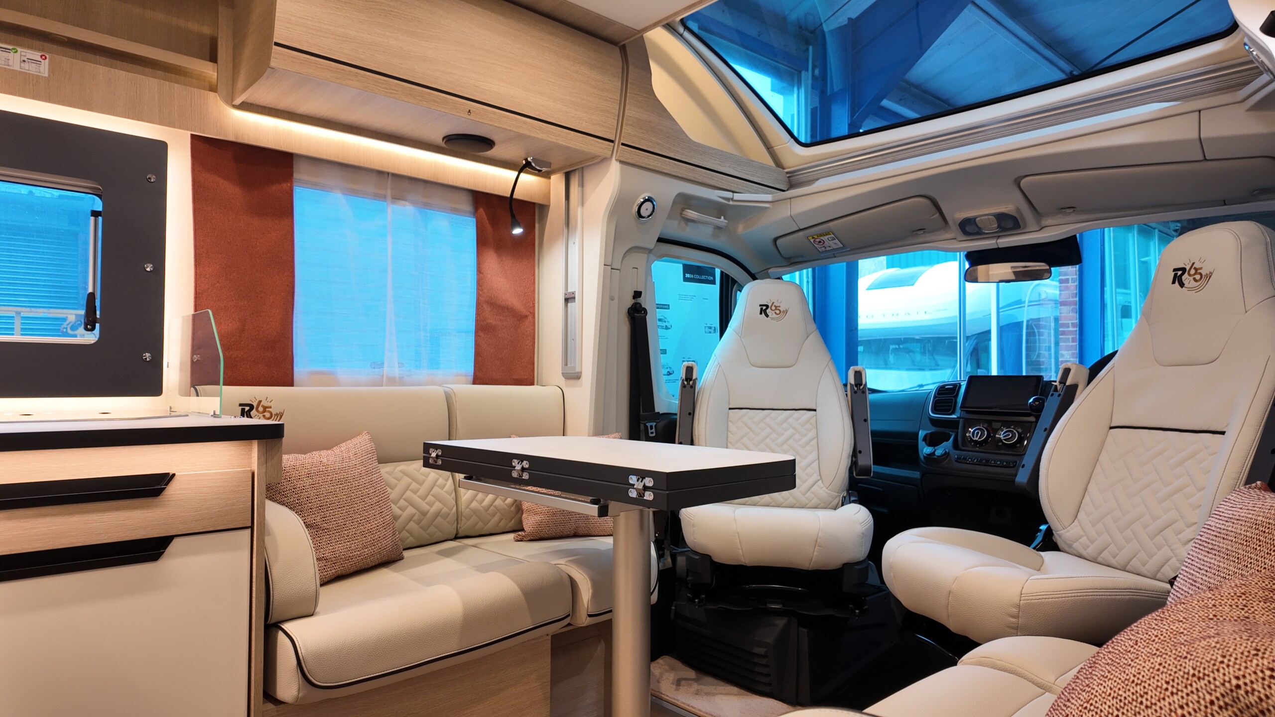 The driver and passenger seats are fully integrated into the living space, swiveling around to face the main lounge area. The cab features an “Iron Grey Metallic” finish on the exterior and embroidered headrest covers inside as part of the special edition features.