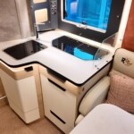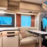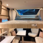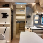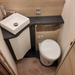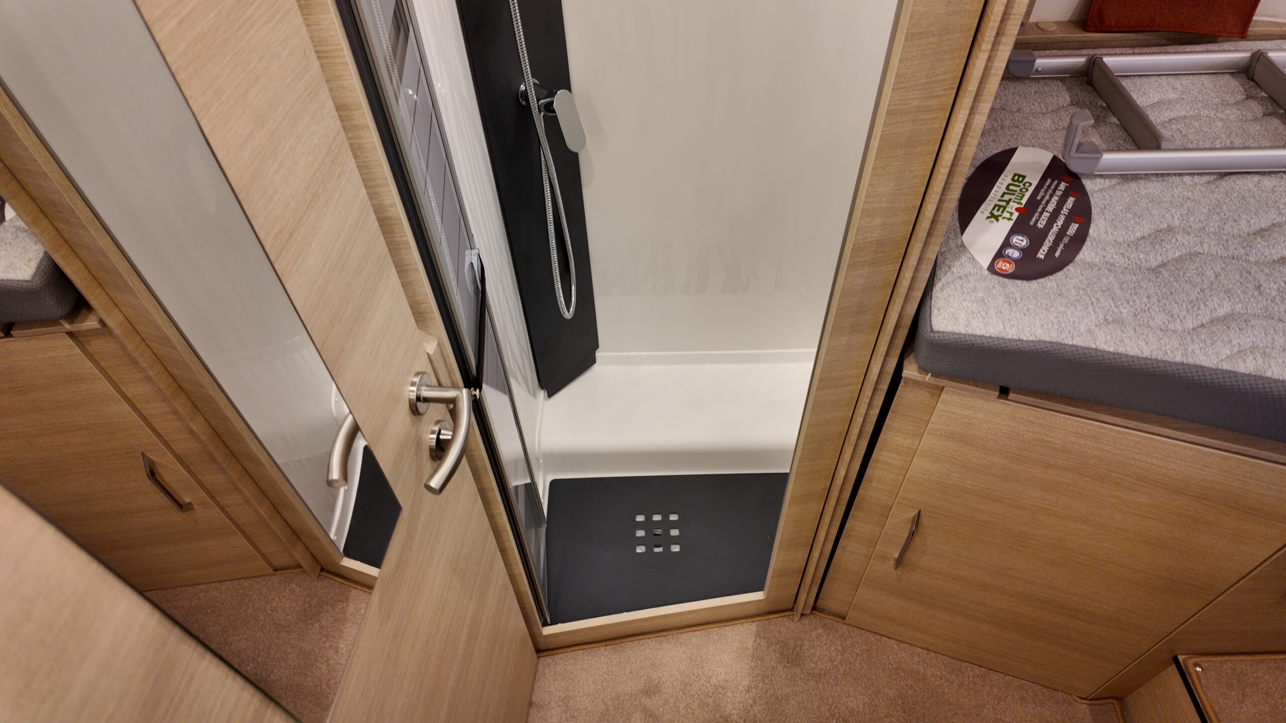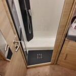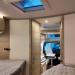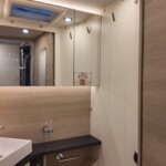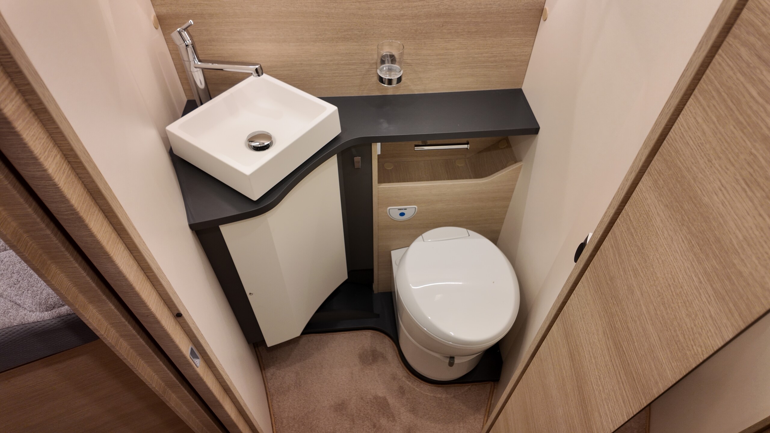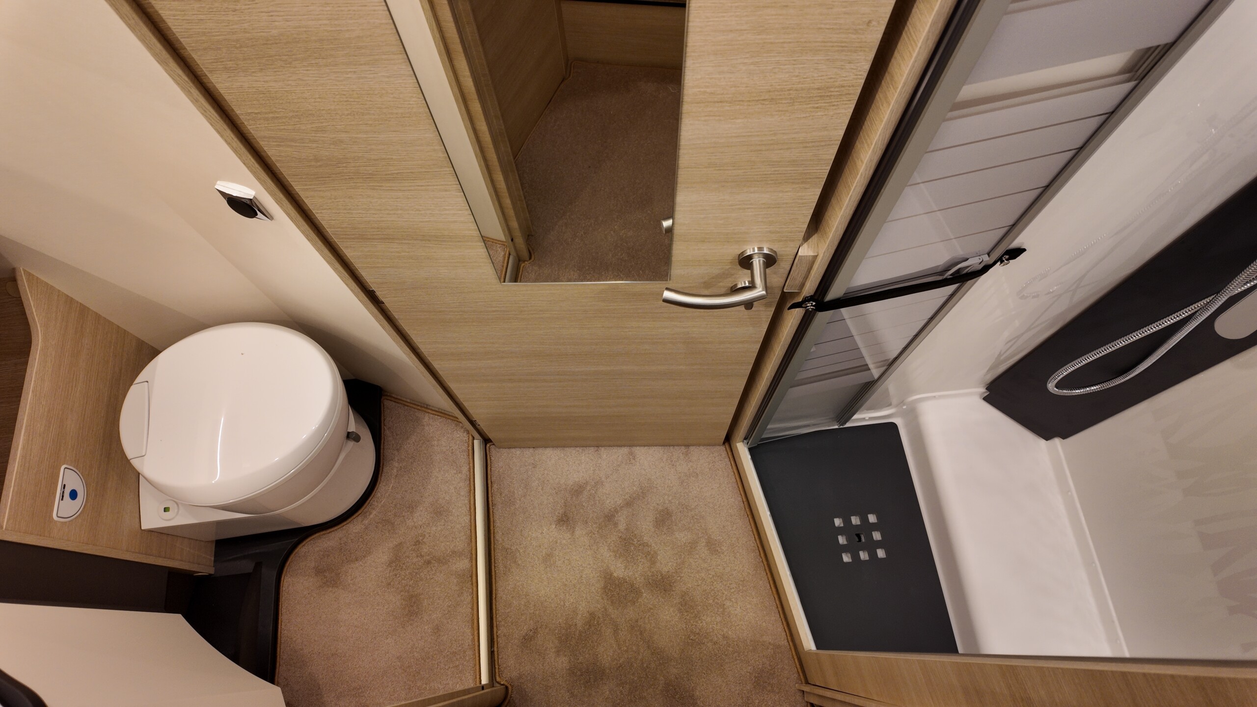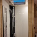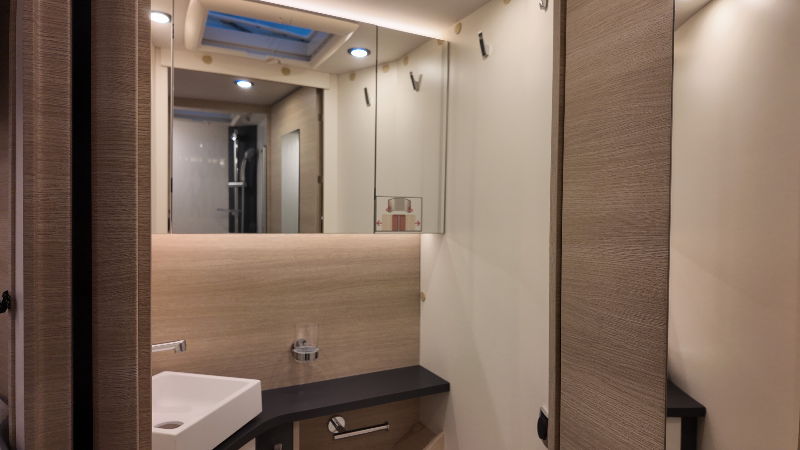 A fully private washroom and a separate, dedicated shower cubicle are situated mid-motorhome, opposite the kitchen area. This design allows for simultaneous use of the toilet and shower areas, or the entire space can be used as a large “comfort” bathroom.