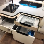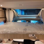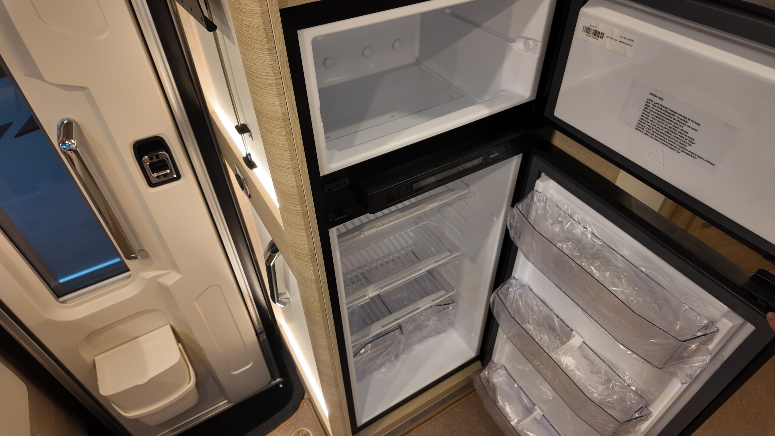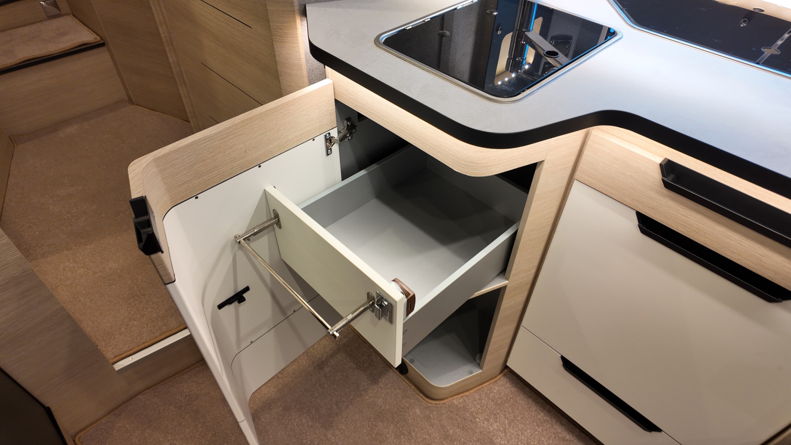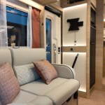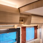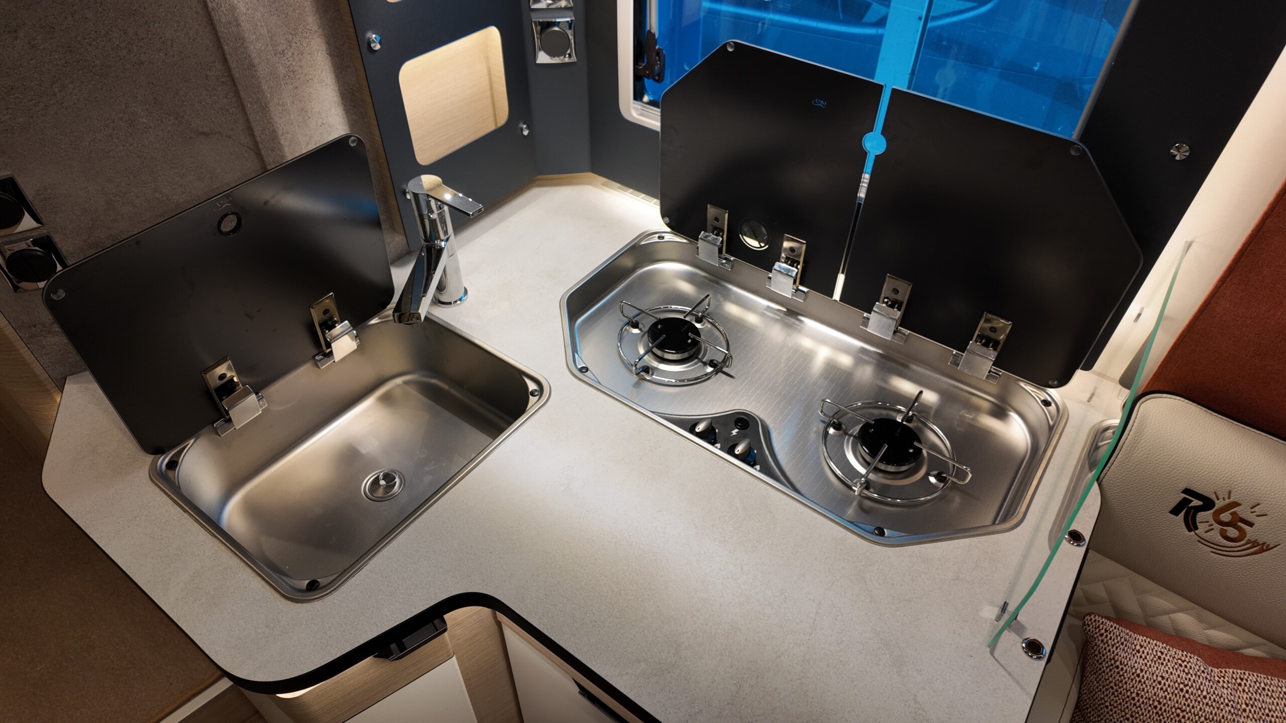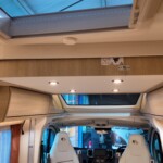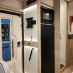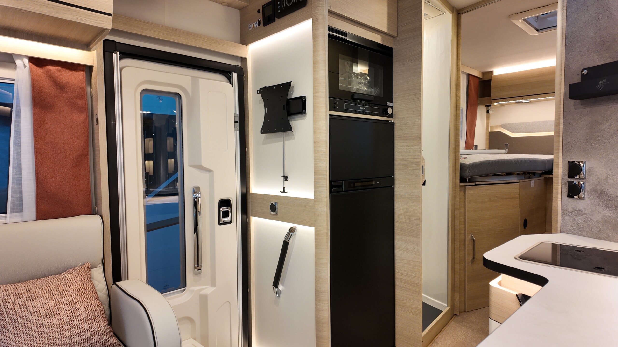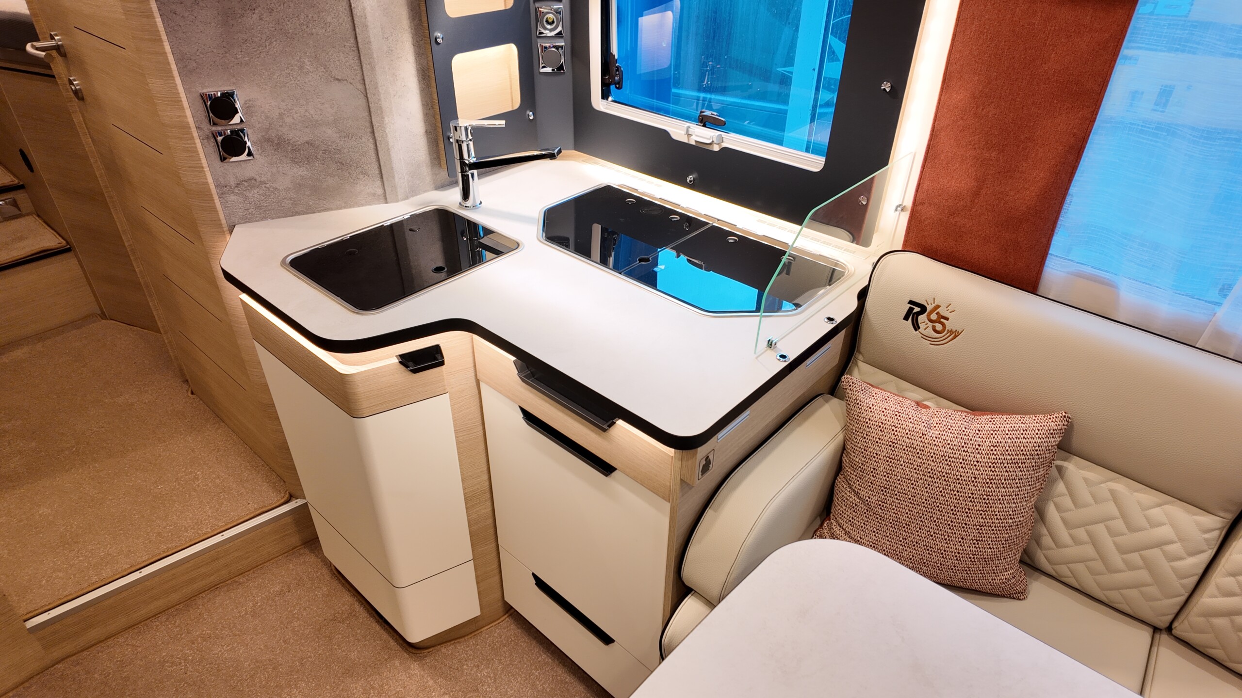 A fully private washroom and a separate, dedicated shower cubicle are situated mid-motorhome, opposite the kitchen area. This design allows for simultaneous use of the toilet and shower areas, or the entire space can be used as a large “comfort” bathroom.