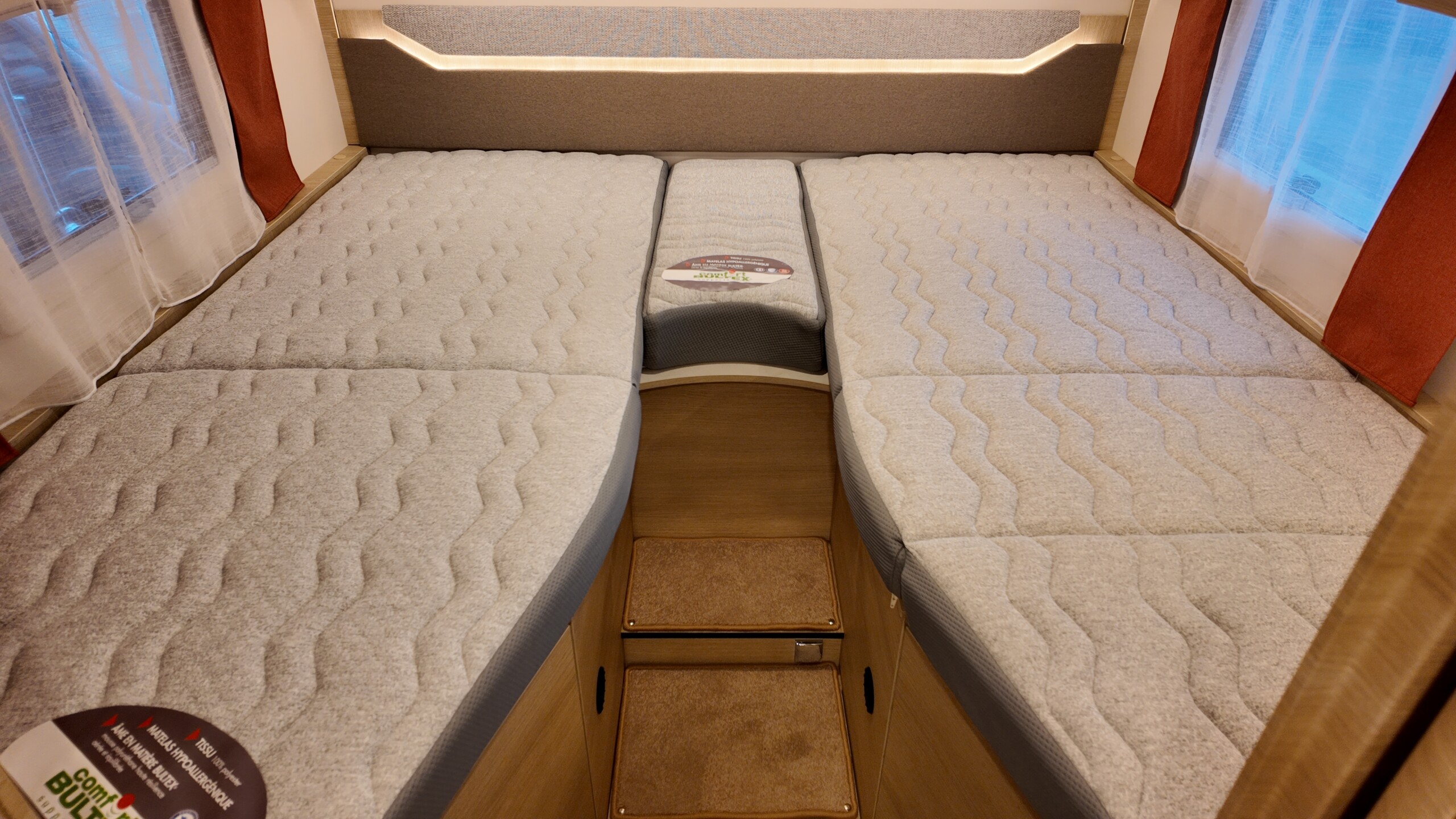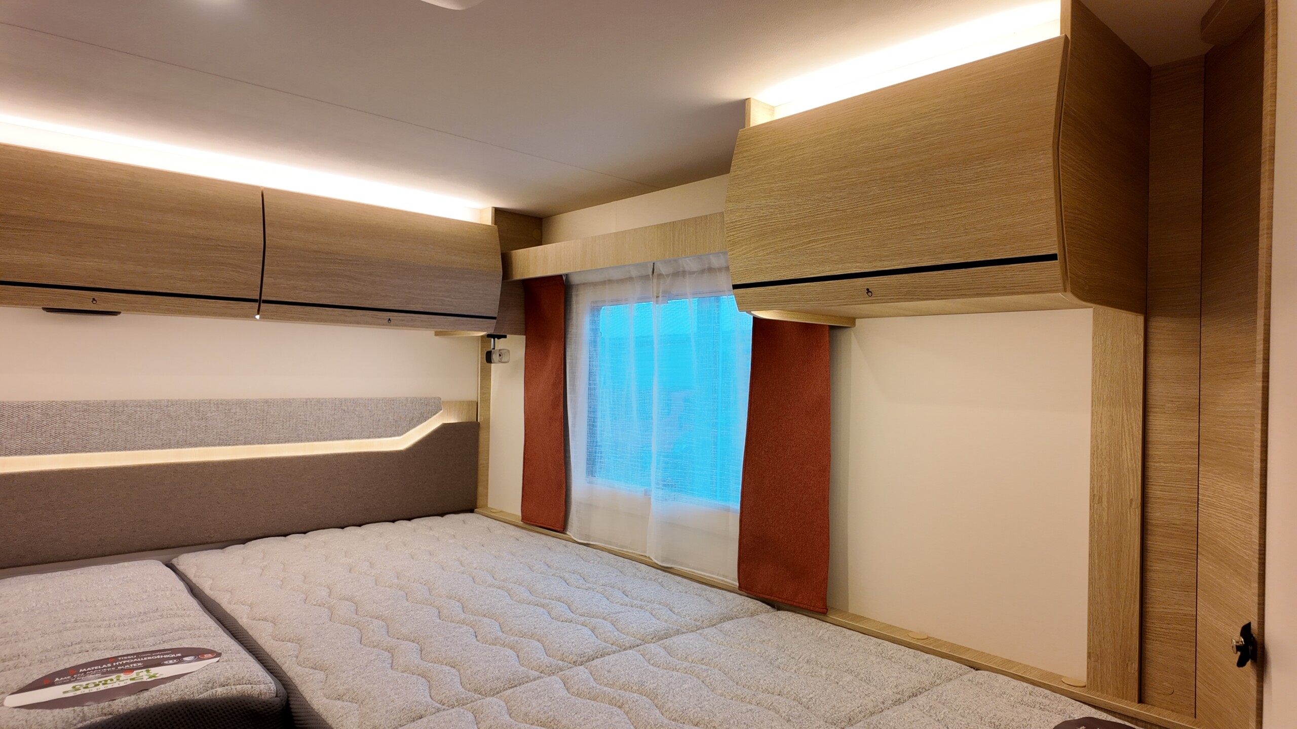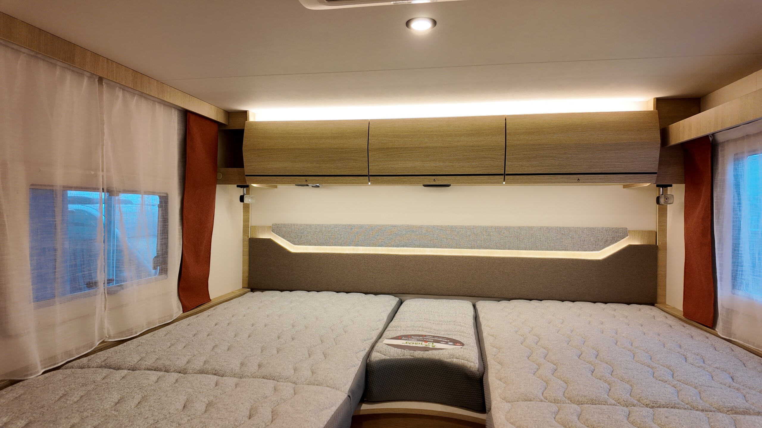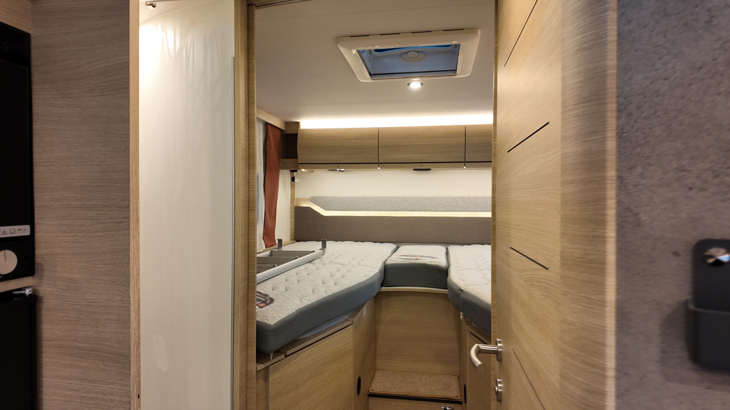 At the rear of the motorhome are two permanent twin single beds, each measuring 85 cm x 205 cm. These can be converted into a large, transverse double bed (137 cm x 206 cm) using a central infill cushion. Wardrobes are conveniently located at the foot of the beds. The bedroom has a backlit headboard and dedicated USB ports for charging devices.