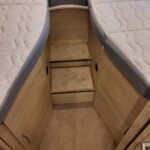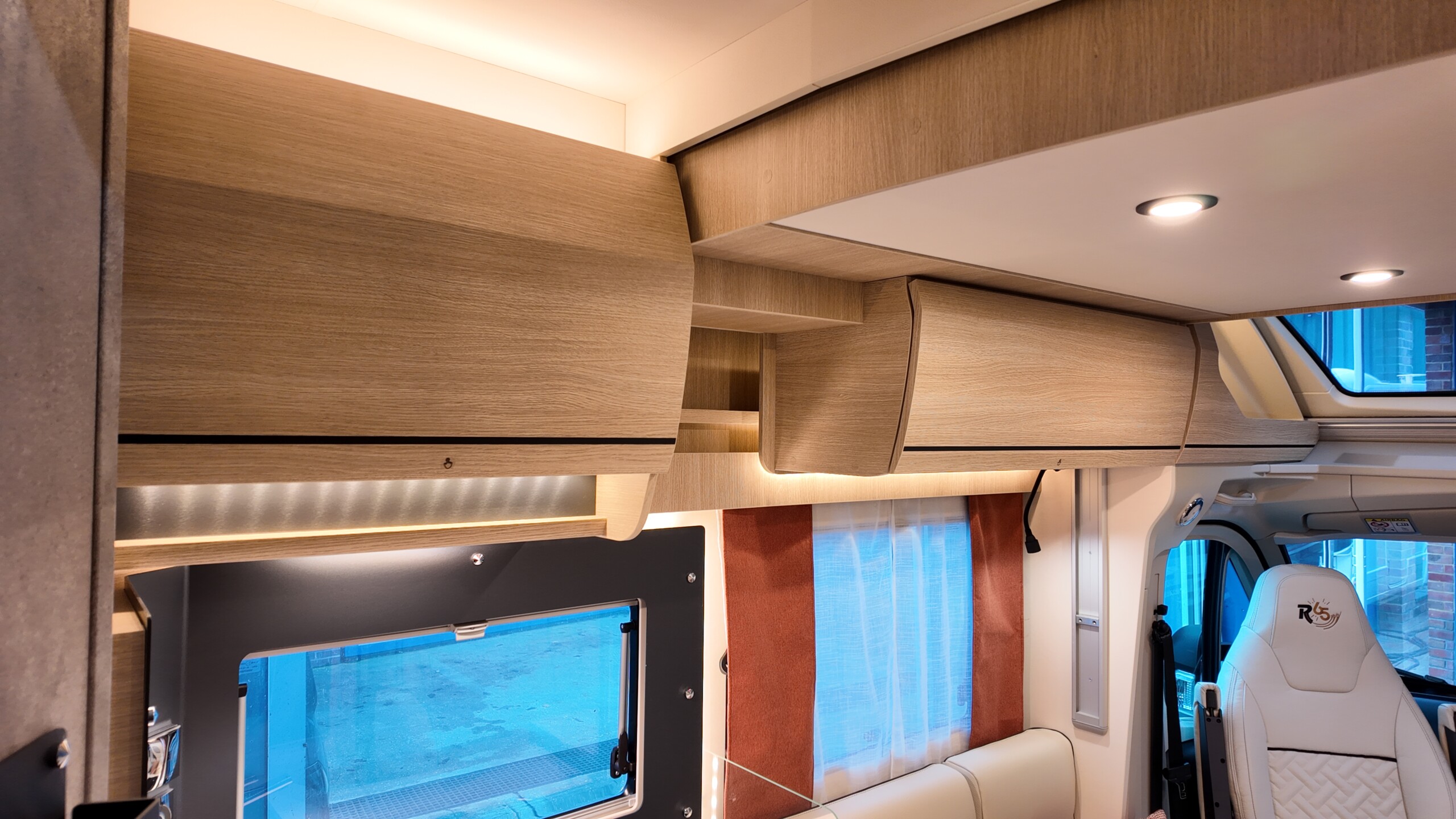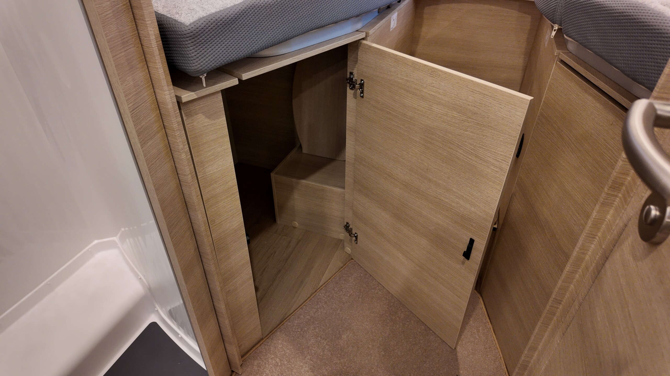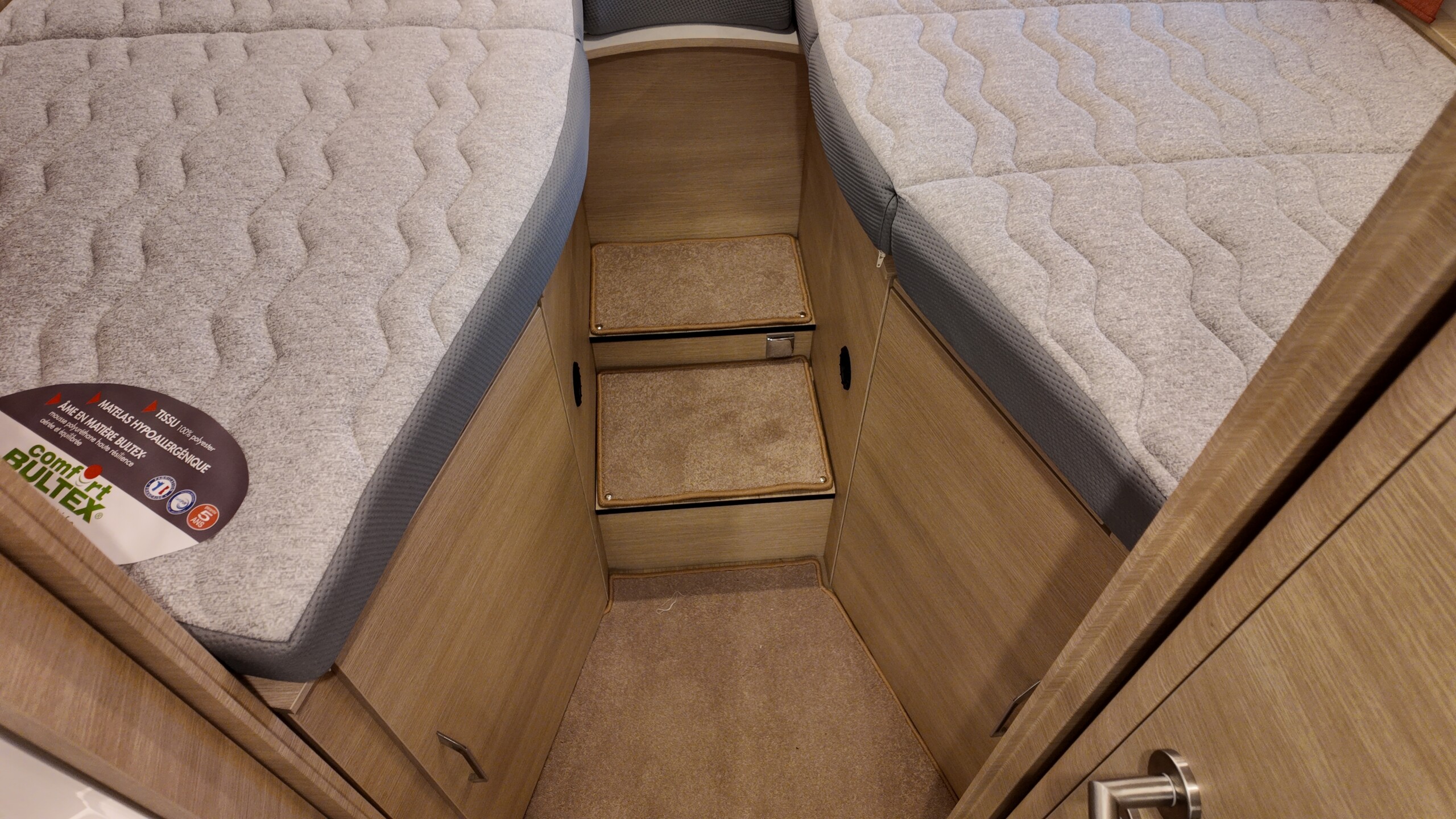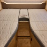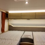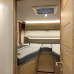 At the rear of the motorhome are two permanent twin single beds, each measuring 85 cm x 205 cm. These can be converted into a large, transverse double bed (137 cm x 206 cm) using a central infill cushion. Wardrobes are conveniently located at the foot of the beds. The bedroom has a backlit headboard and dedicated USB ports for charging devices.