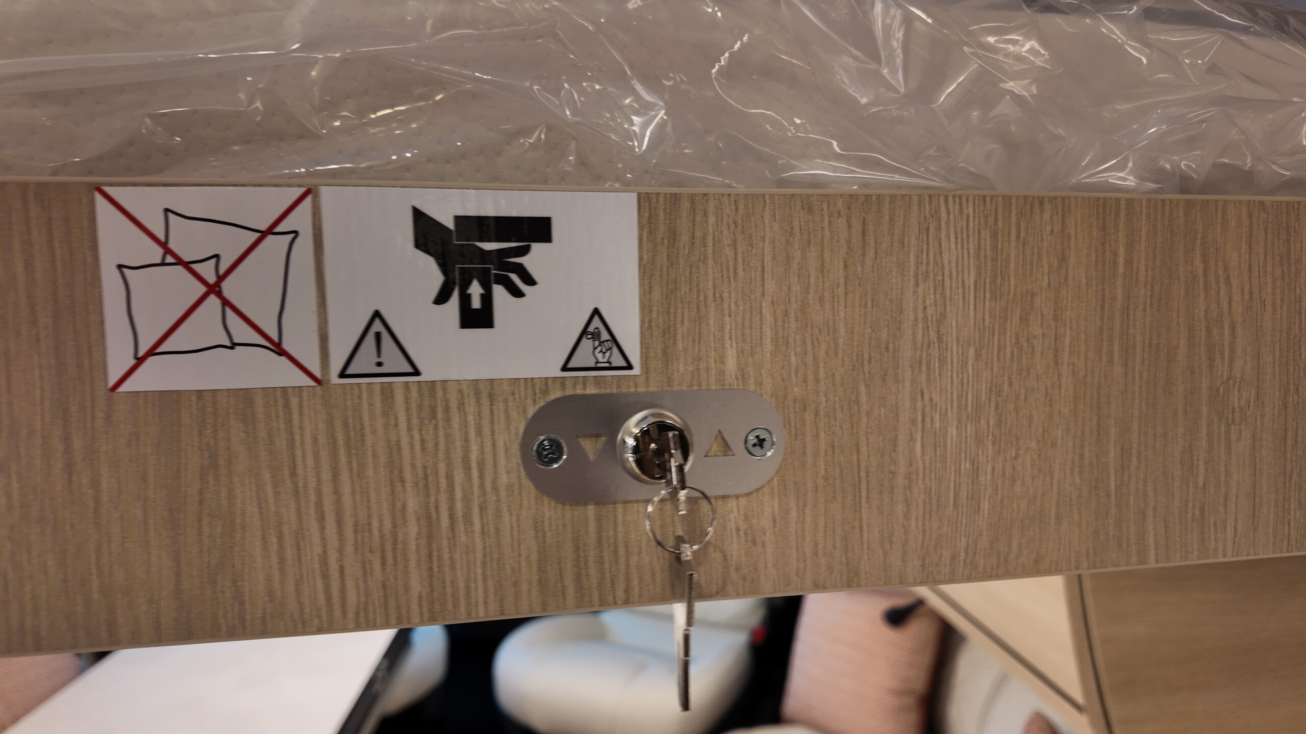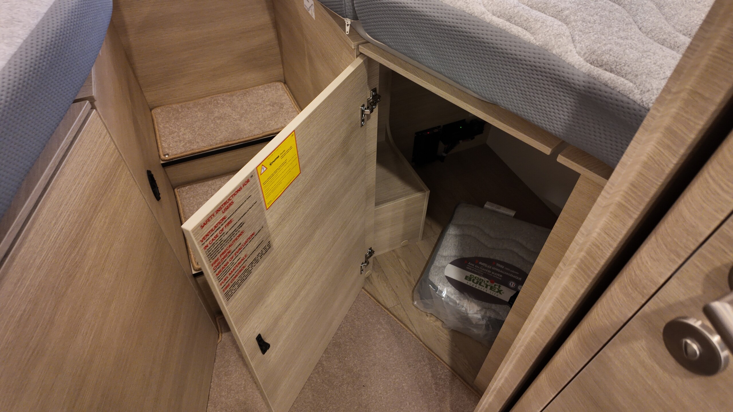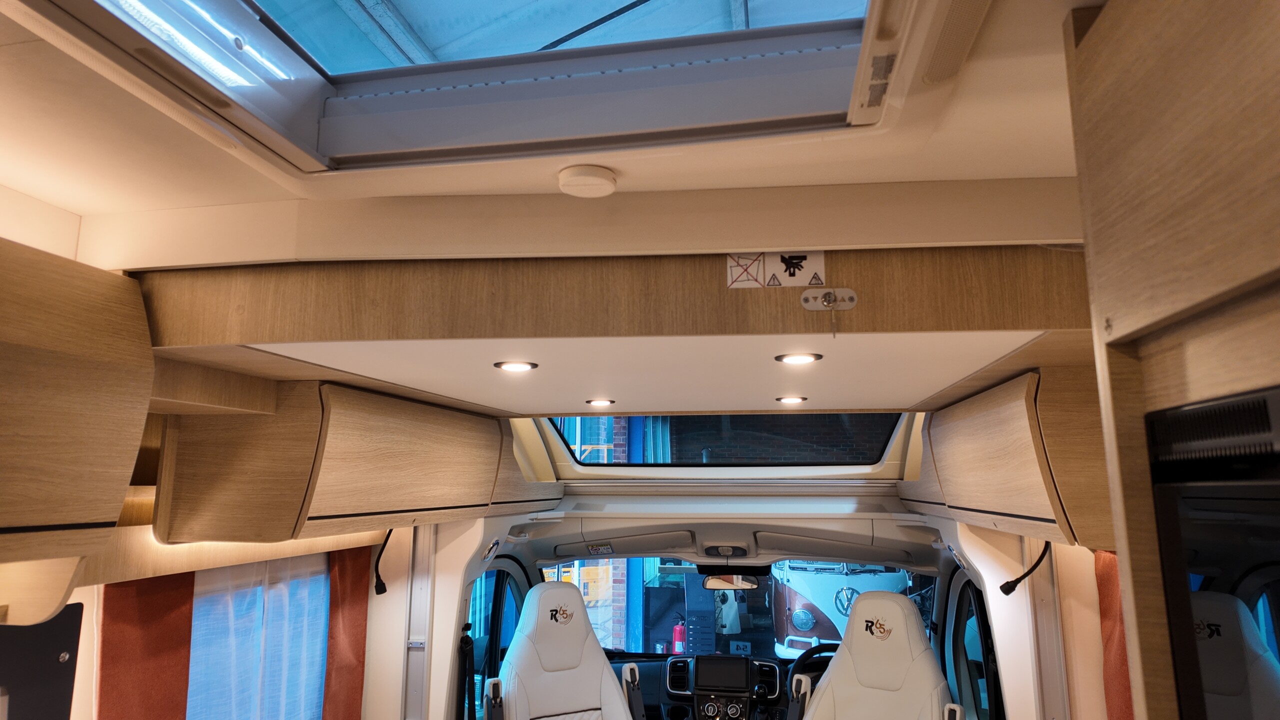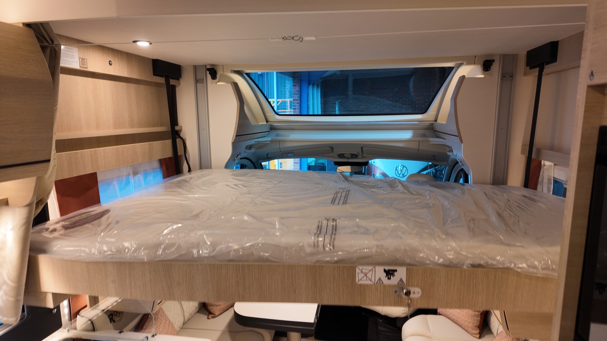 At the rear of the motorhome are two permanent twin single beds, each measuring 85 cm x 205 cm. These can be converted into a large, transverse double bed (137 cm x 206 cm) using a central infill cushion. Wardrobes are conveniently located at the foot of the beds. The bedroom has a backlit headboard and dedicated USB ports for charging devices.