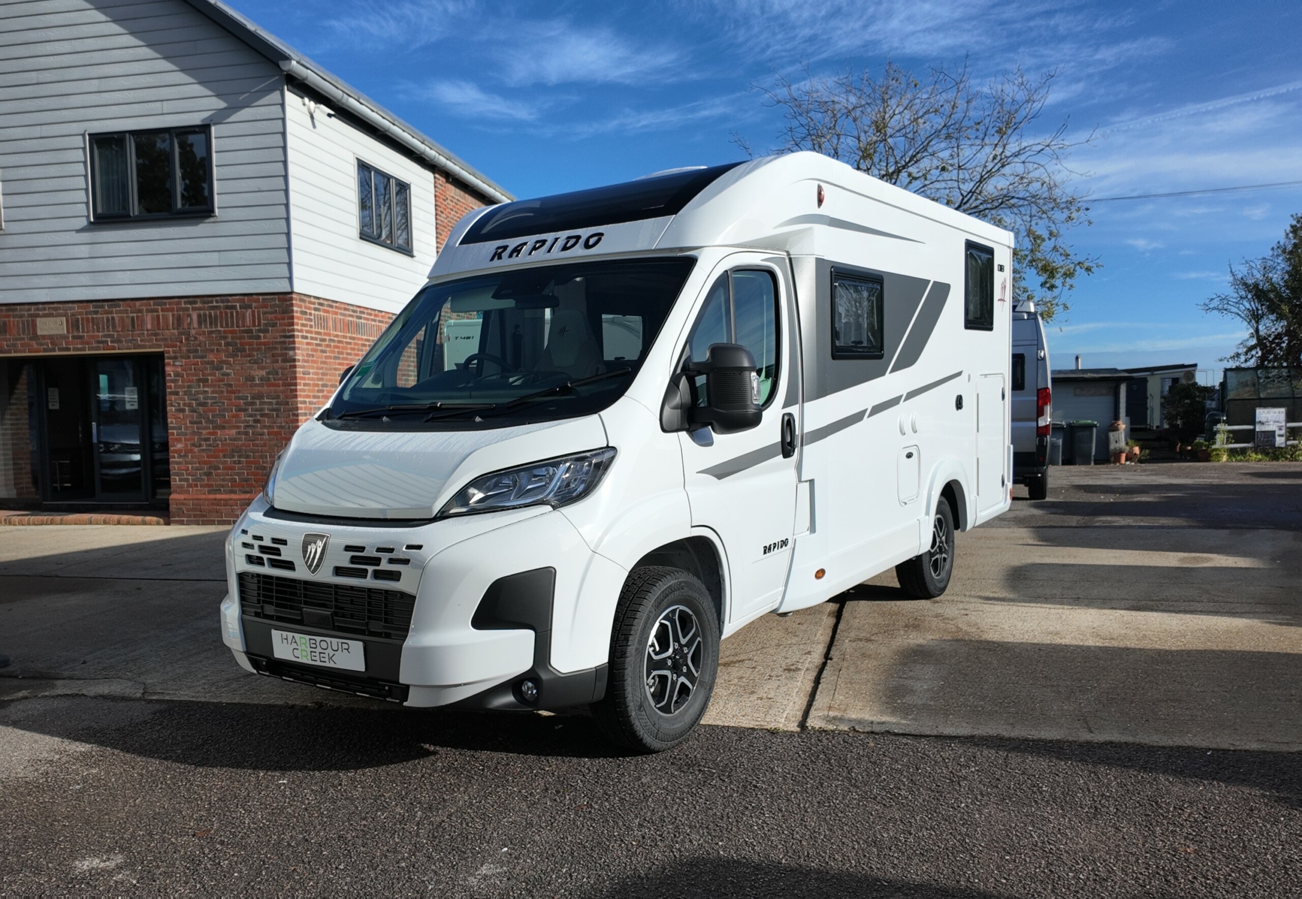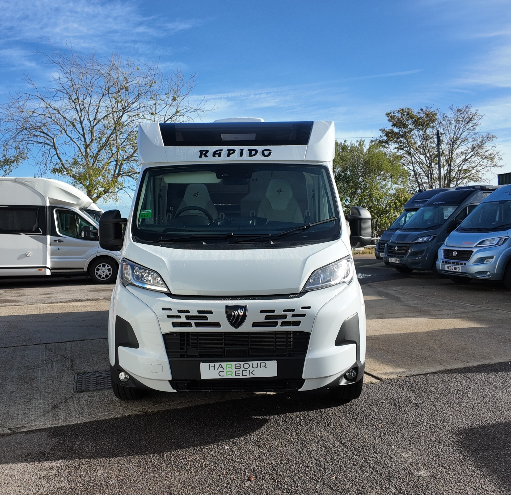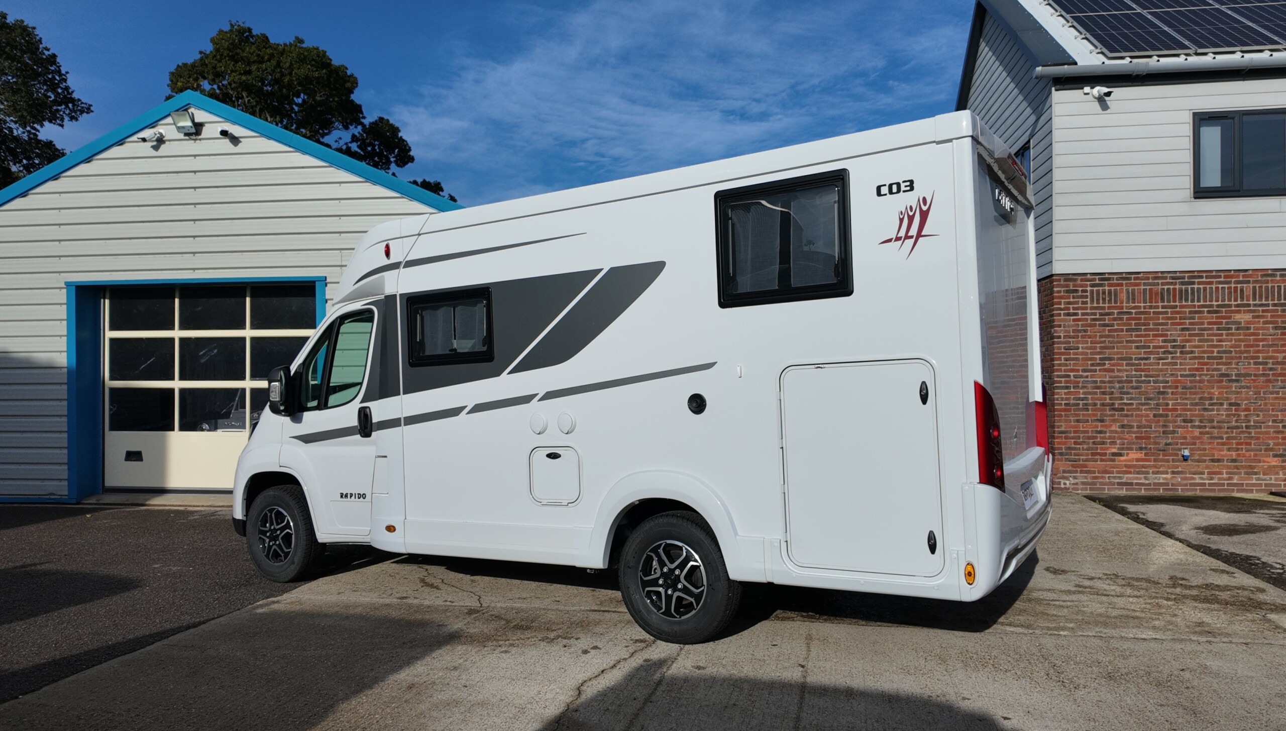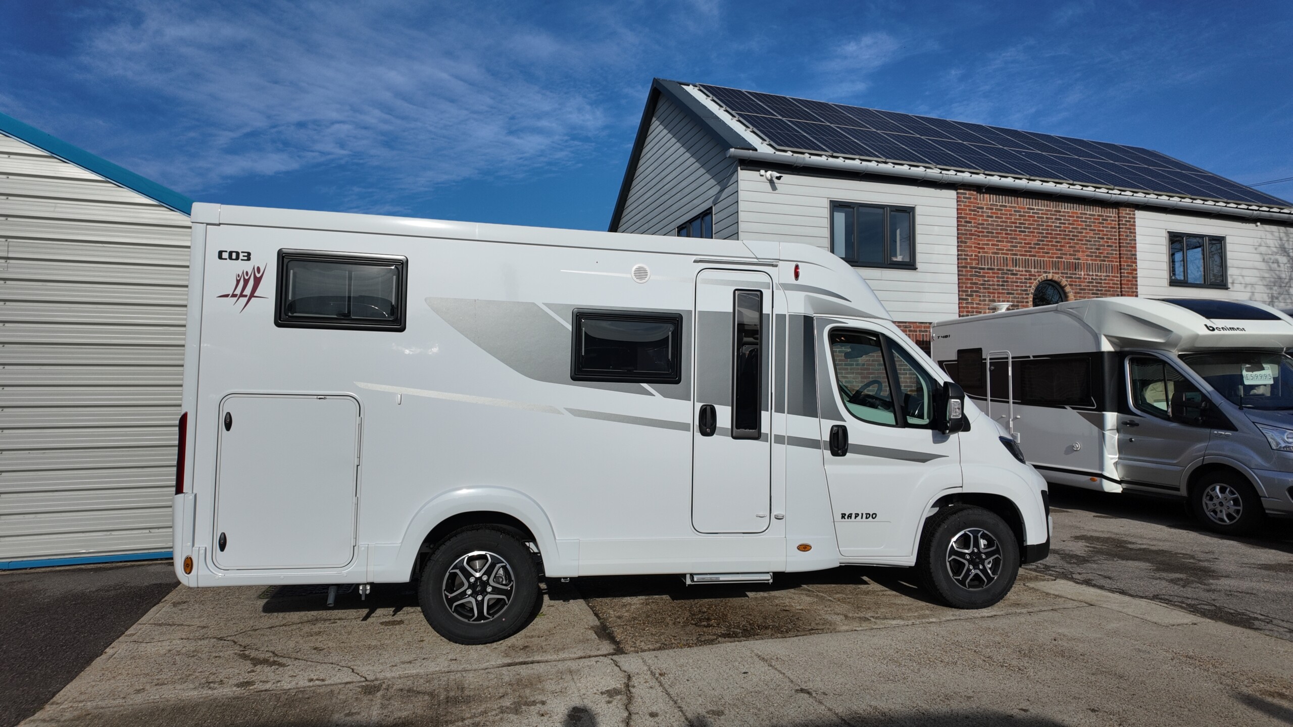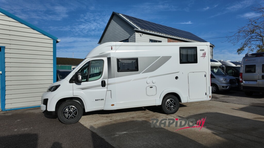 NEW 2026 Rapido C03 Low-profile Motorhome. Based on a Fiat Ducato 3500kg, with an Automatic Gearbox, 2,2L, 140Hp. 3x Berth & 4x Belted travelling seats. Front L-shaped lounge with a rear transverse double bed over garage.