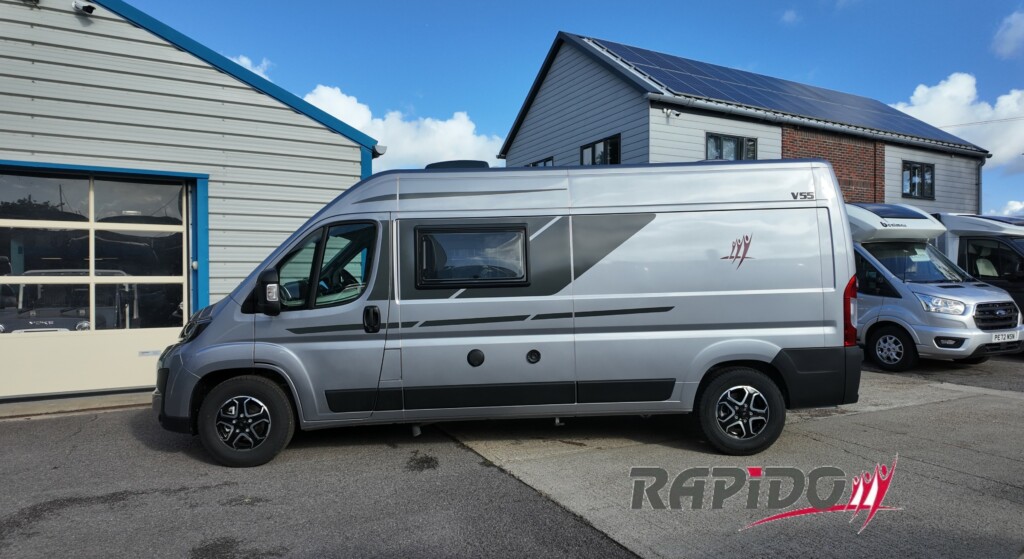 NEW 2026 Rapido V55 Campervan. Finished in stunning Artense Grey Metallic, Fiat Ducato chassis. 2.2l, 140Hp, with an Automatic gearbox. 3.5 t. Belted travelling seats for up to four people and sleeps 3.