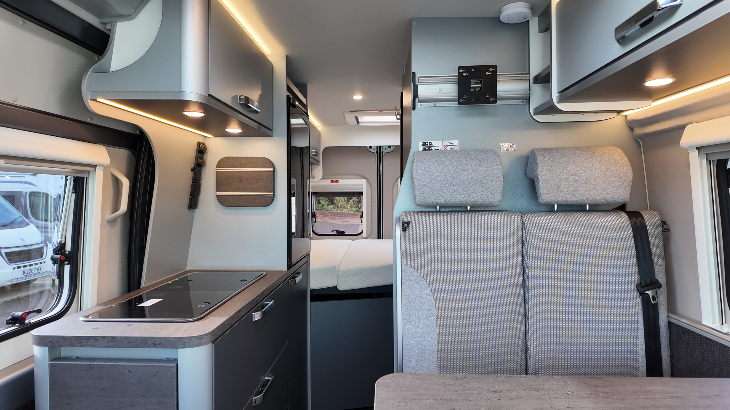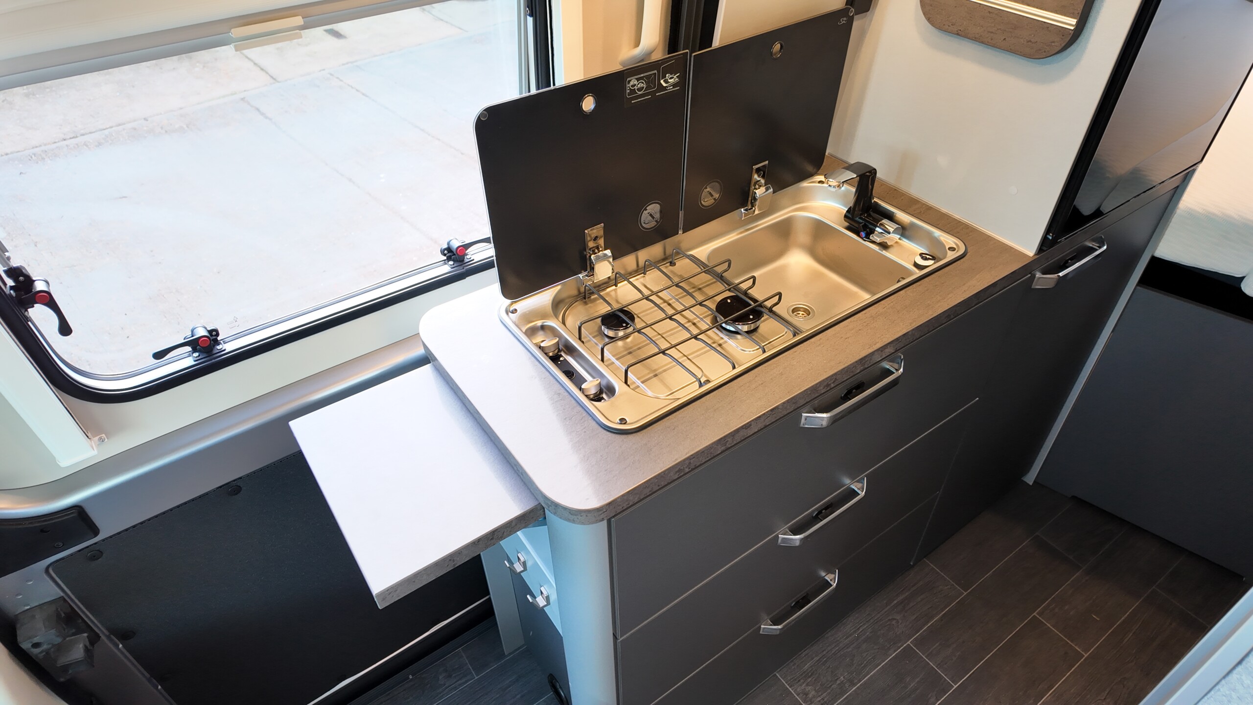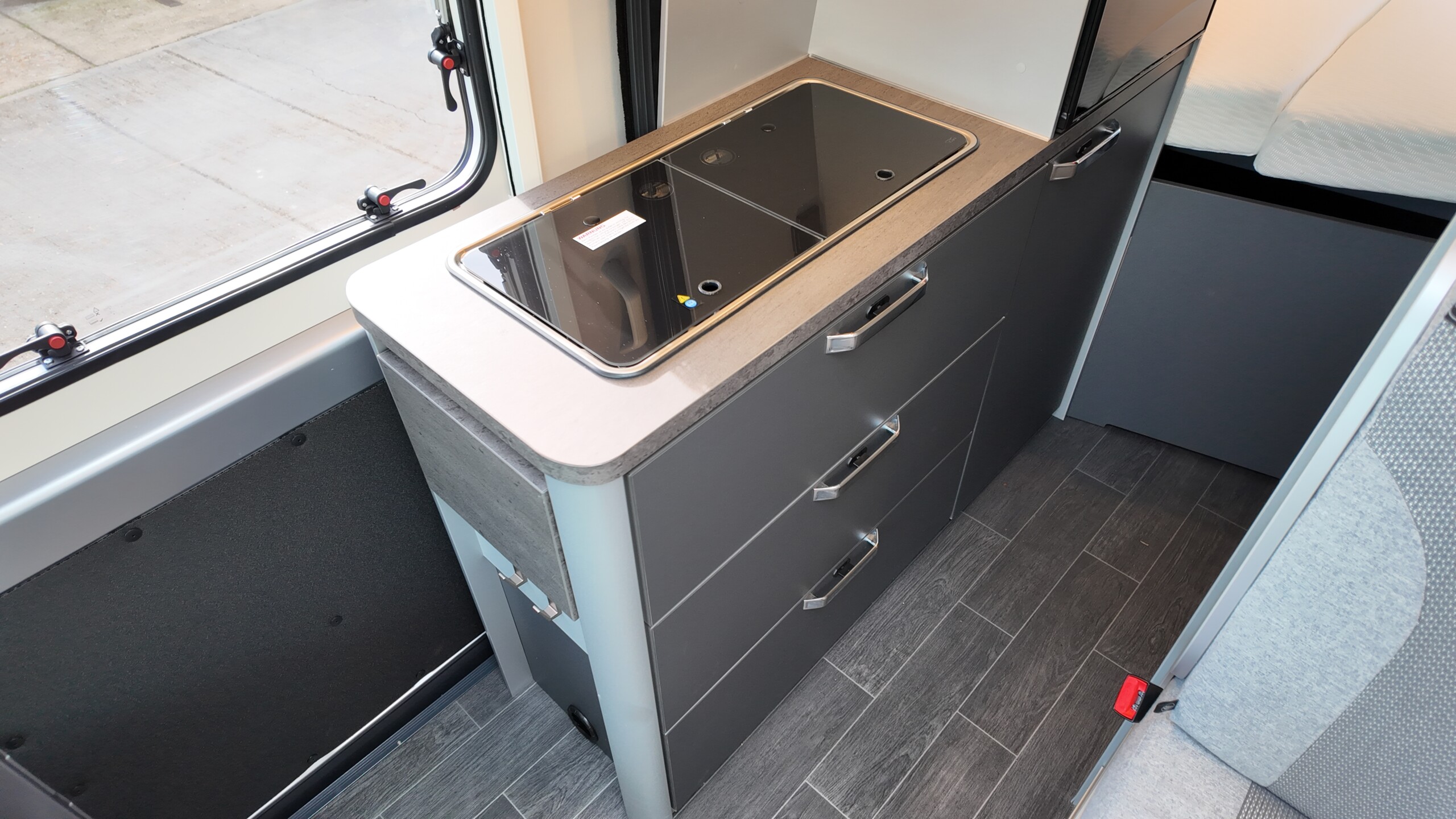 The interior boasts a contemporary grey design – with high‐quality, durable CPL surfaces. Compact, well thought‐out, ready to travel – all at a price as convincing as the equipment: The CaraBus GREY EDITION [FIRE] has everything you need for your next adventure!