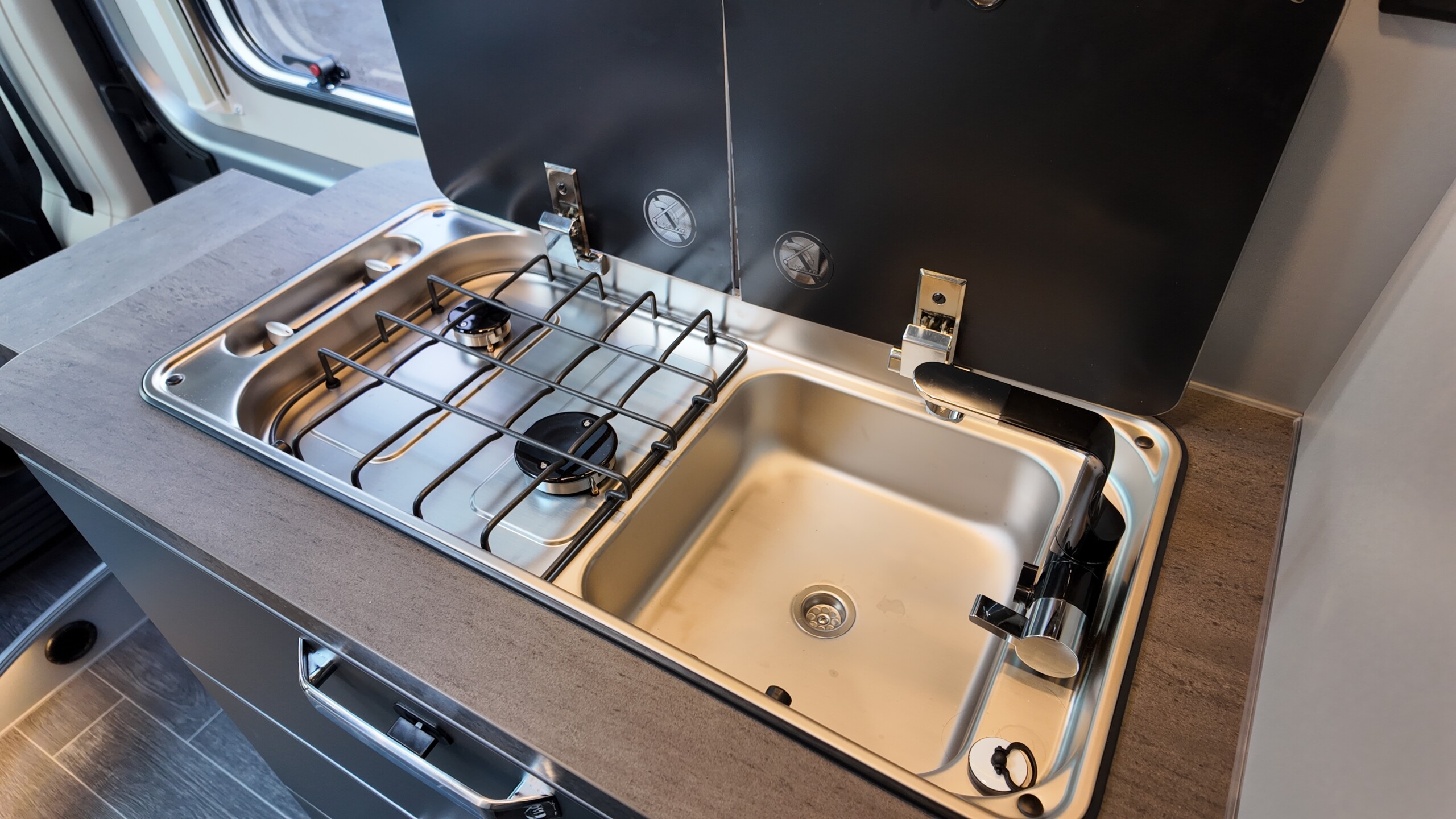 - Cooker-sink combination incl. 2-burner cooker with electric ignition and divided glass cover