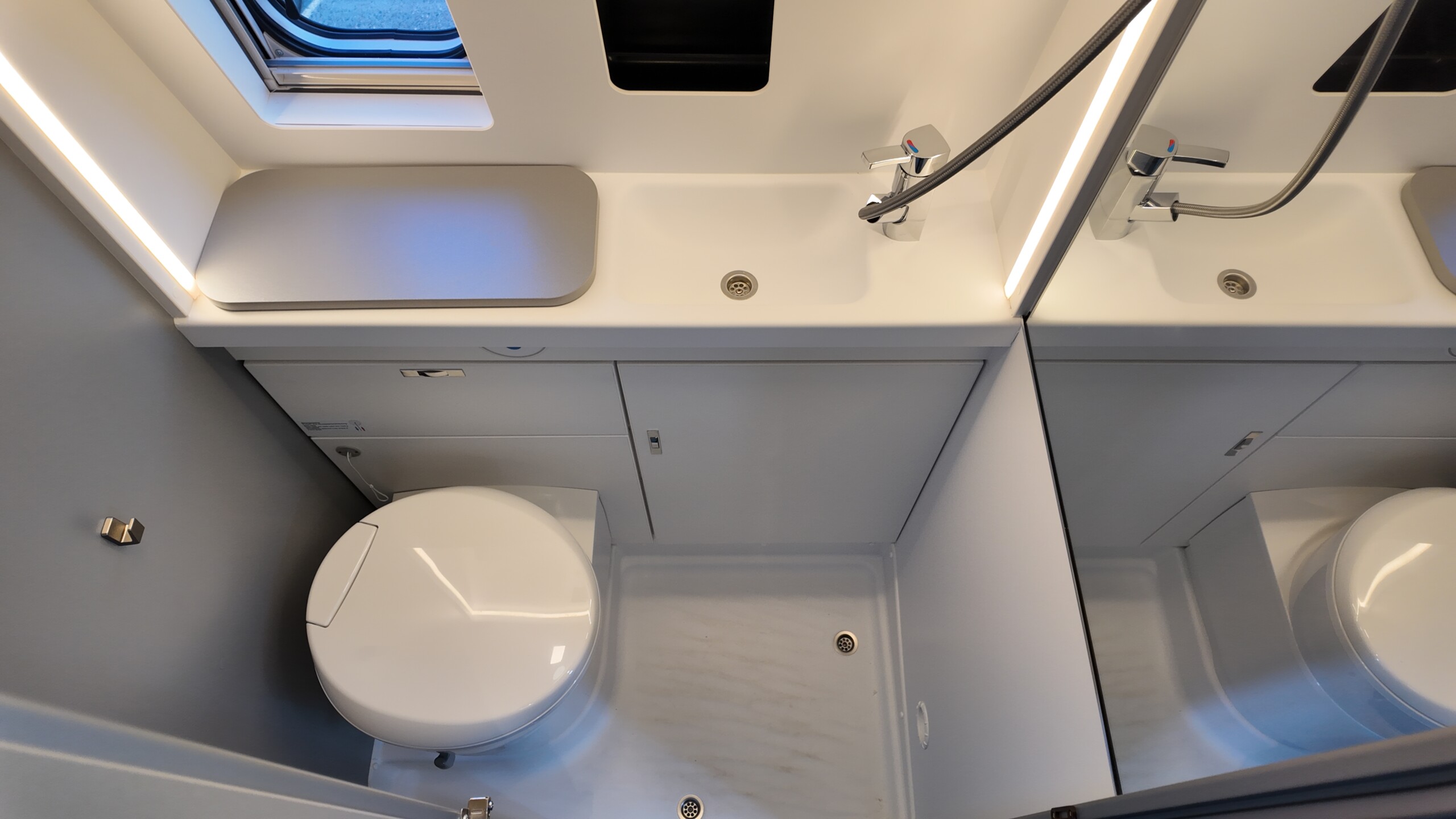 soundproofed compressor unit - Ergonomic toilet room with generous storage compartments, integrated shower and removable shower