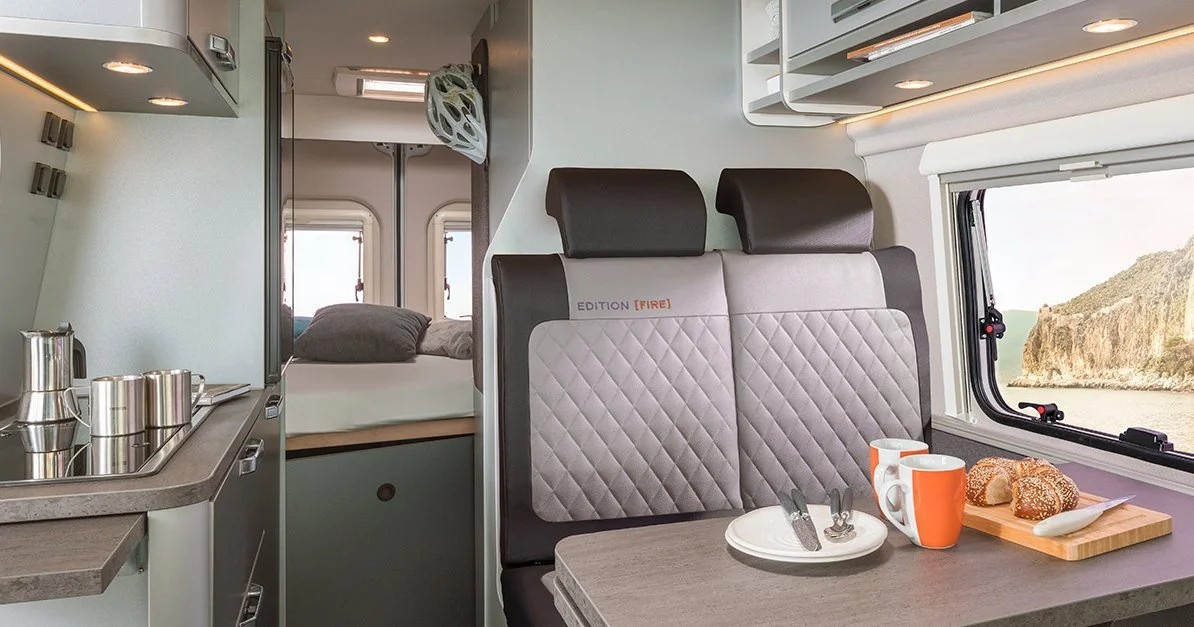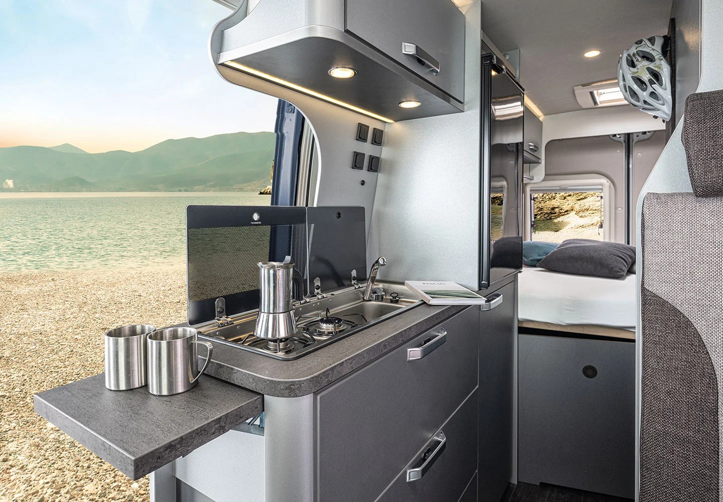 The interior boasts a contemporary grey design – with high‐quality, durable CPL surfaces. Compact, well thought‐out, ready to travel – all at a price as convincing as the equipment: The CaraBus GREY EDITION [FIRE] has everything you need for your next adventure!