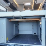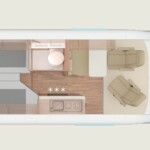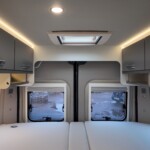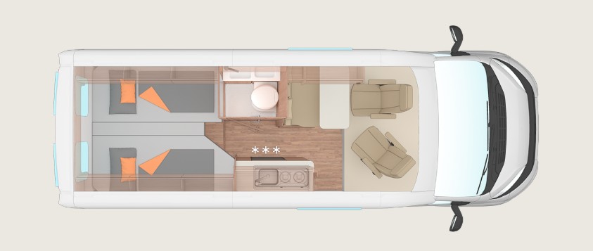An incomparable feeling of space, high quality, ingenious functionality and cool style combined with a length of only 599 cm and a width of 205 cm. There is easy access longitudinal beds are to the rear over a large storage area. This is a superb and eye-catching campervan