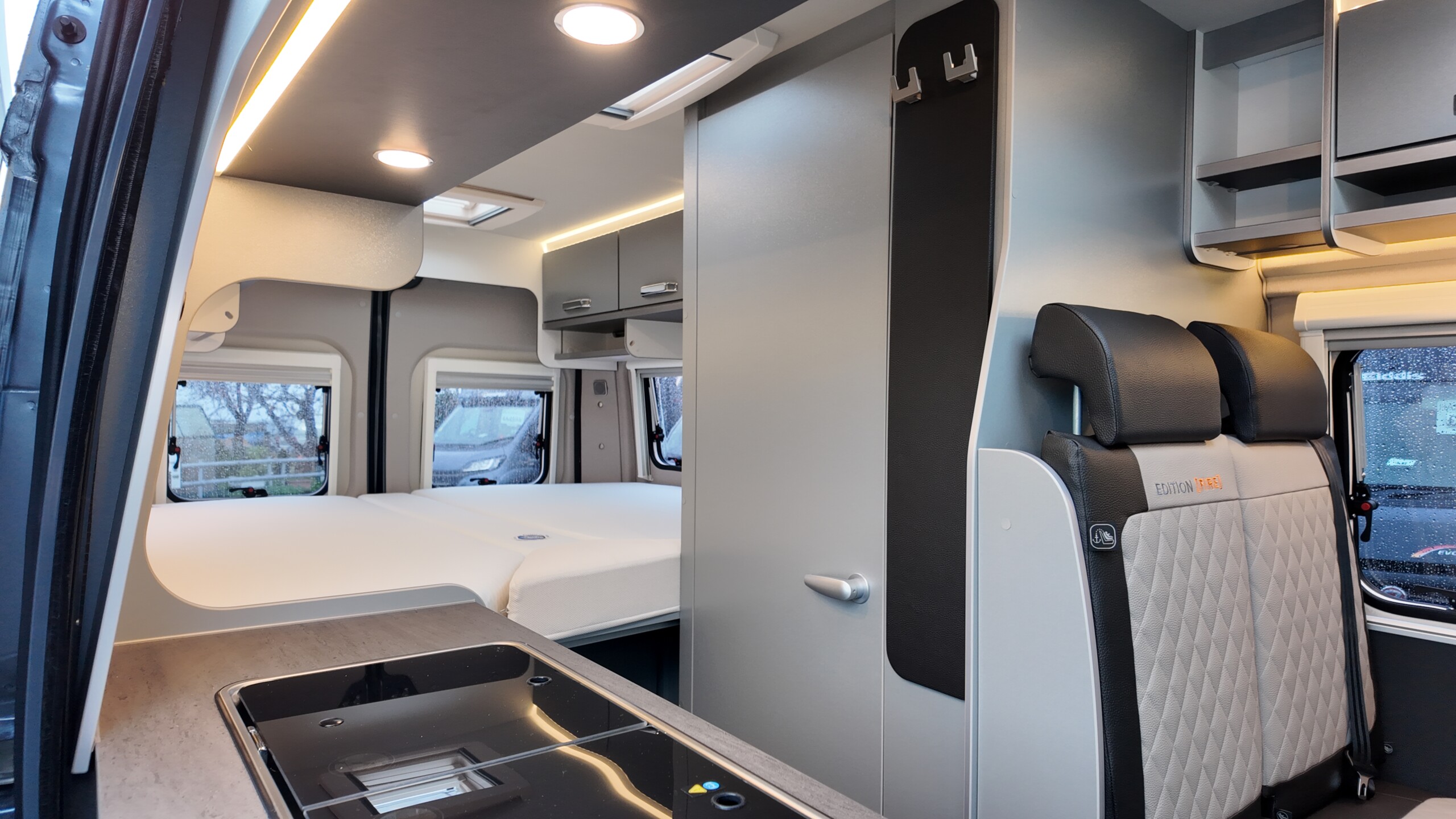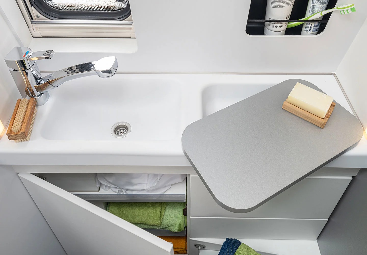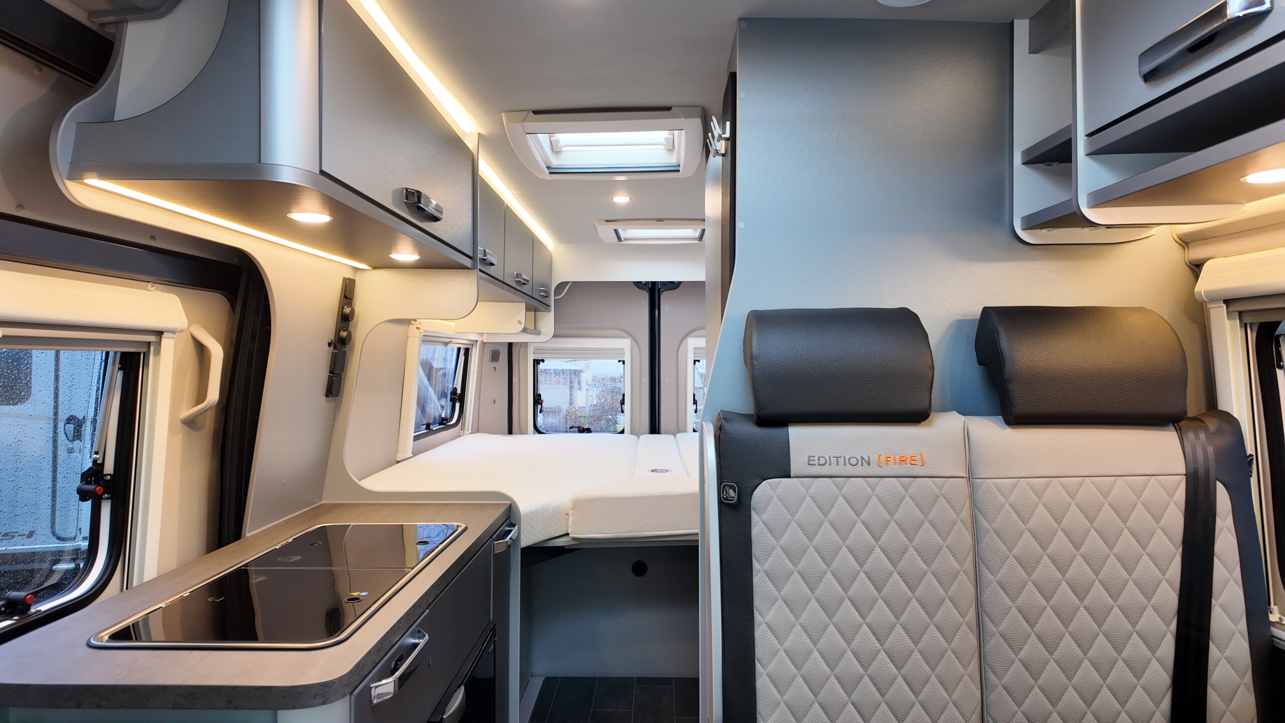 The interior boasts a contemporary grey design – with high‐quality, durable CPL surfaces. Compact, well thought‐out, ready to travel – all at a price as convincing as the equipment: The CaraBus GREY EDITION [FIRE] has everything you need for your next adventure!