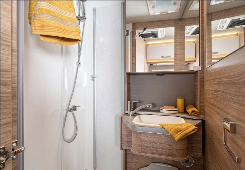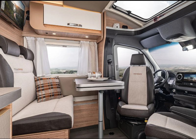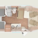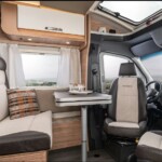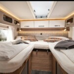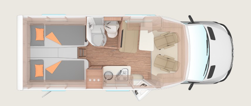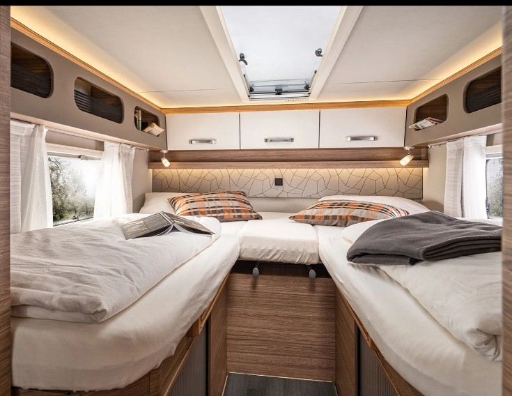 A luxurious top-of-the-range motorhome with a spacious interior featuring rear single beds. 2x Berth & 4x Travelling seats.