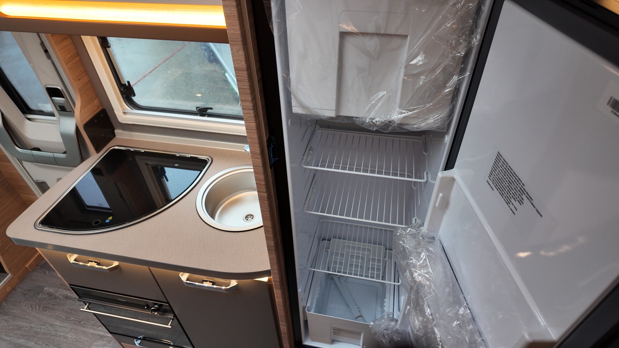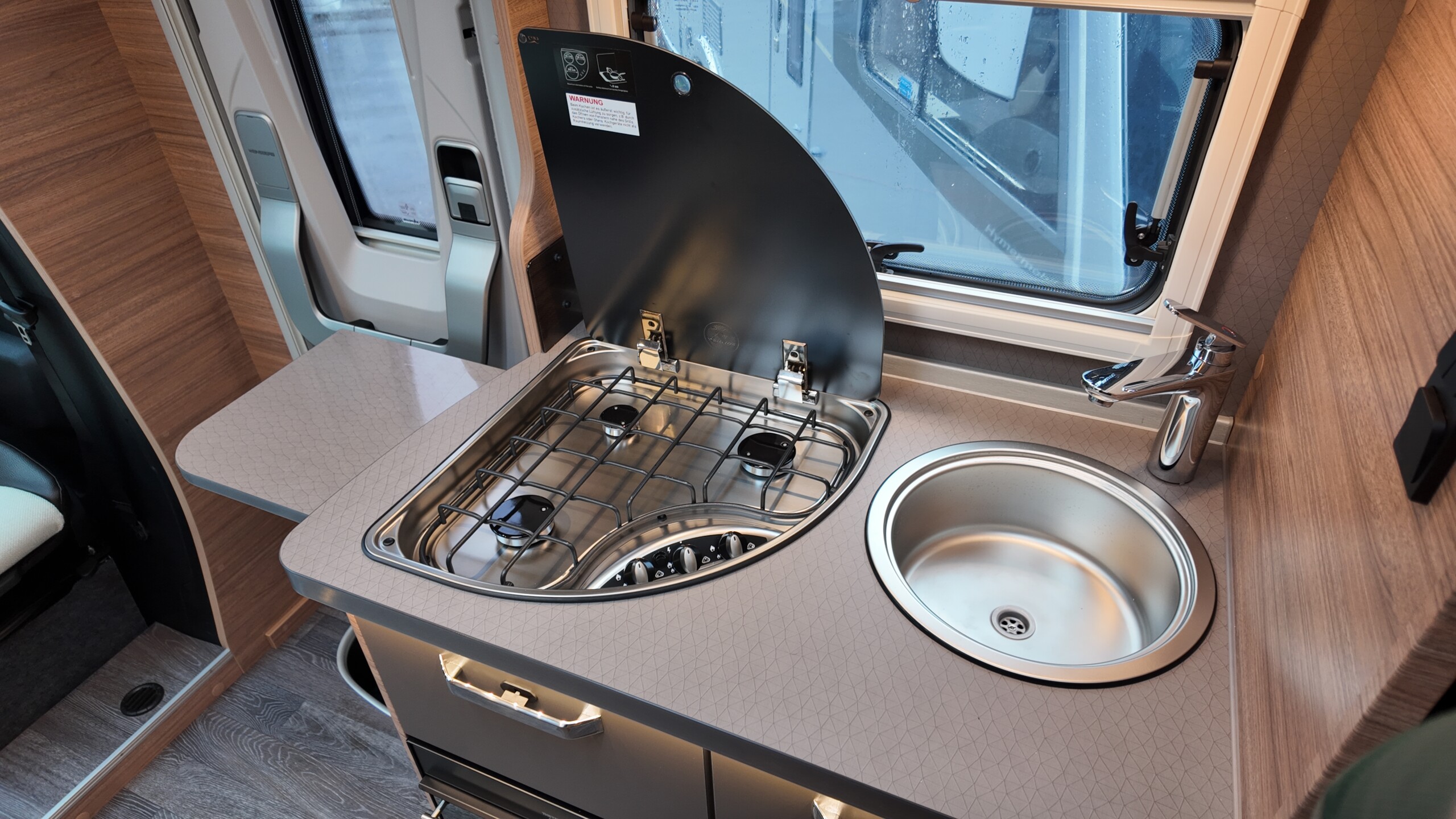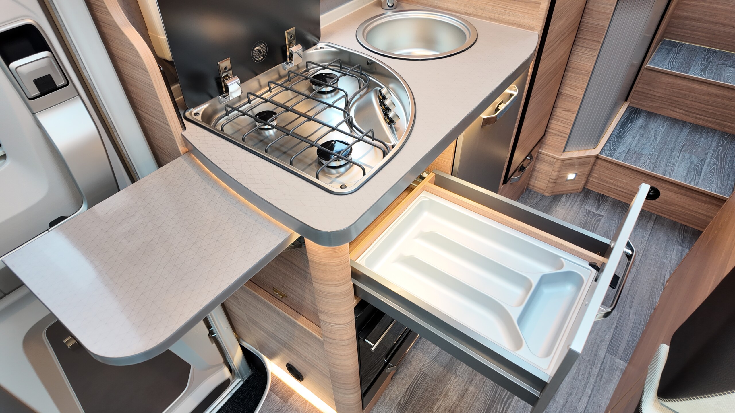 • 3-burner cooker with glass cover, stainless steel sink, recessed