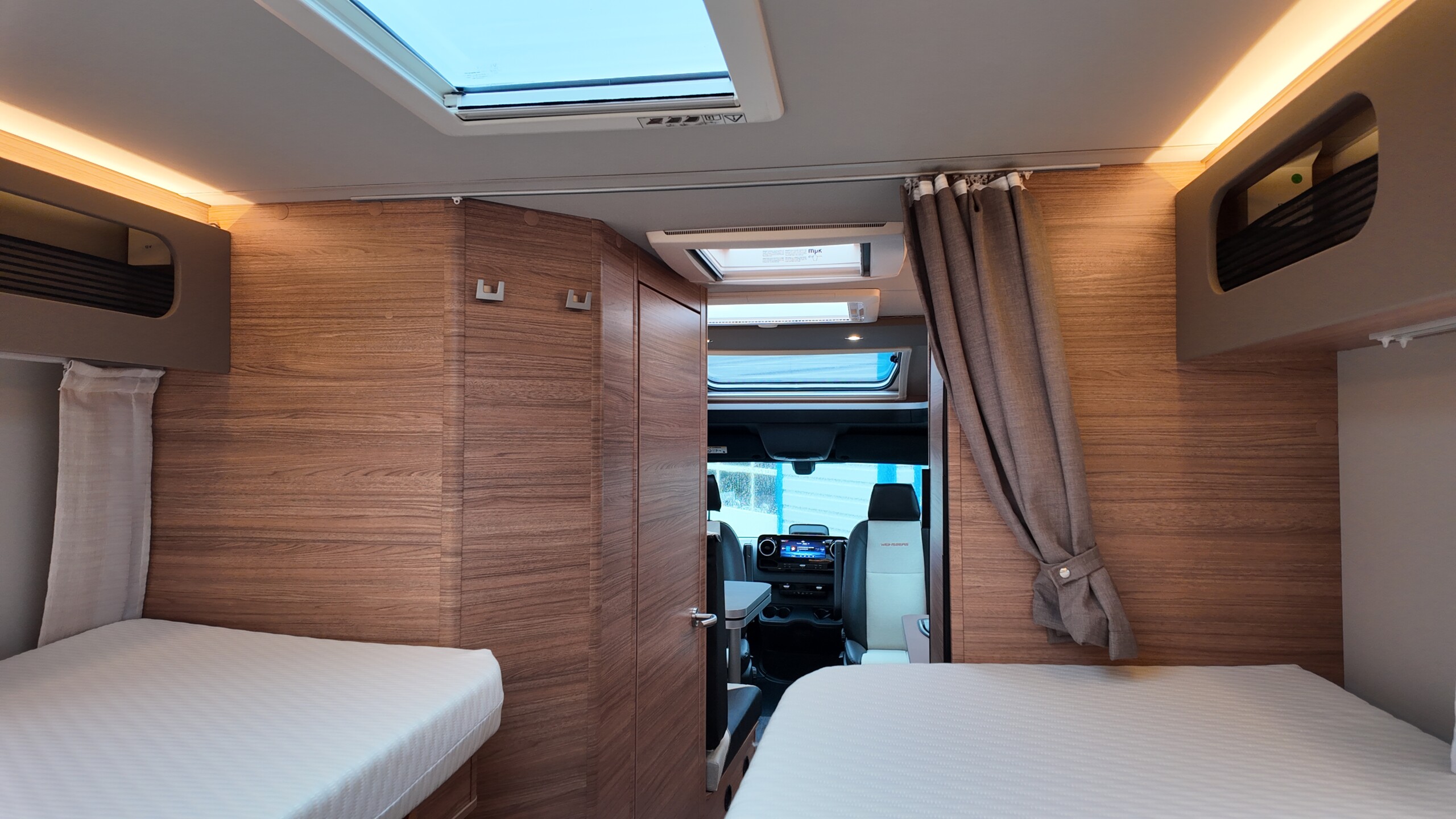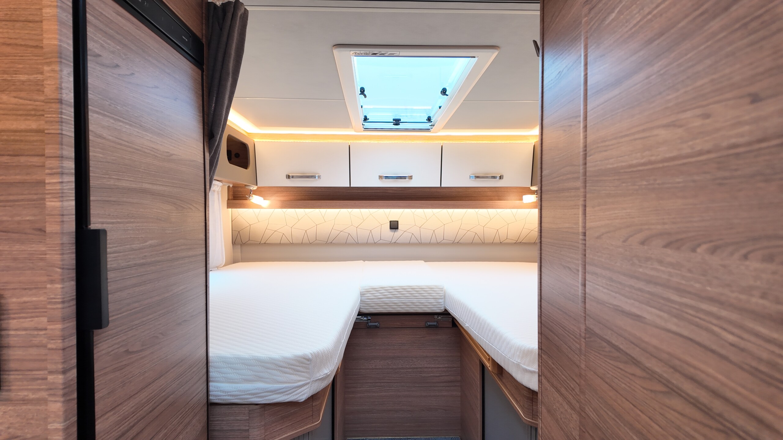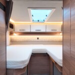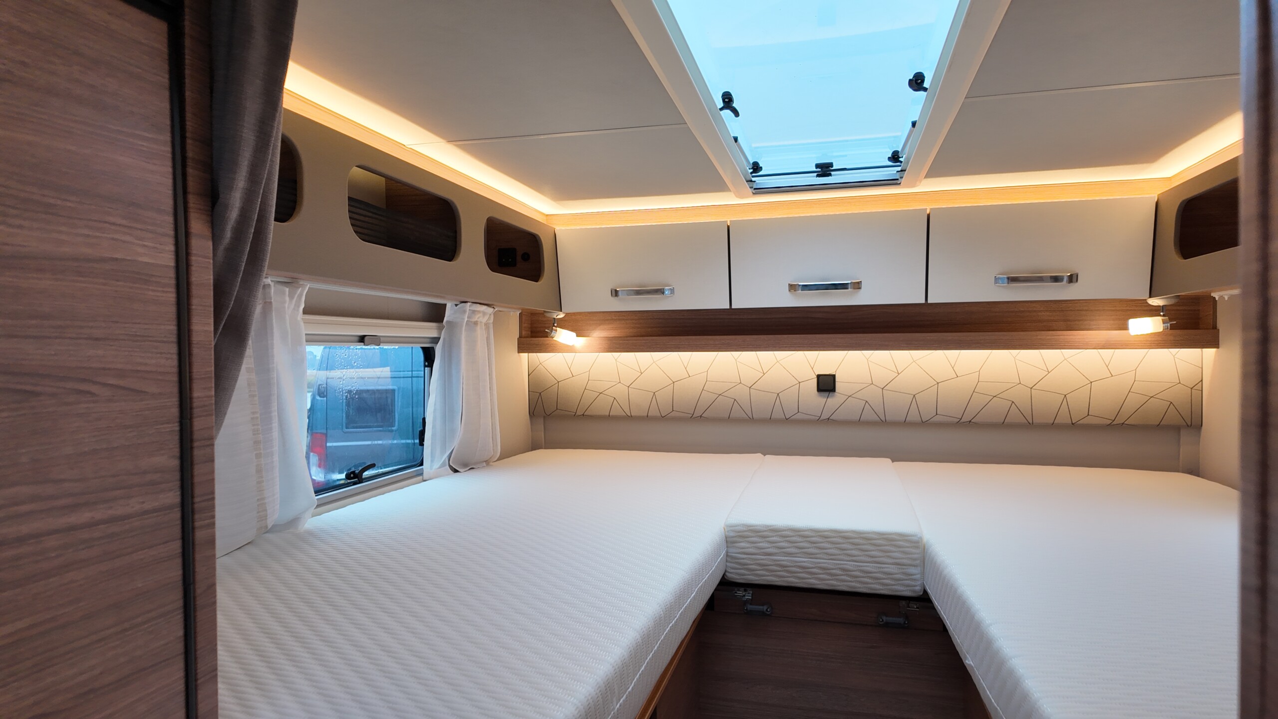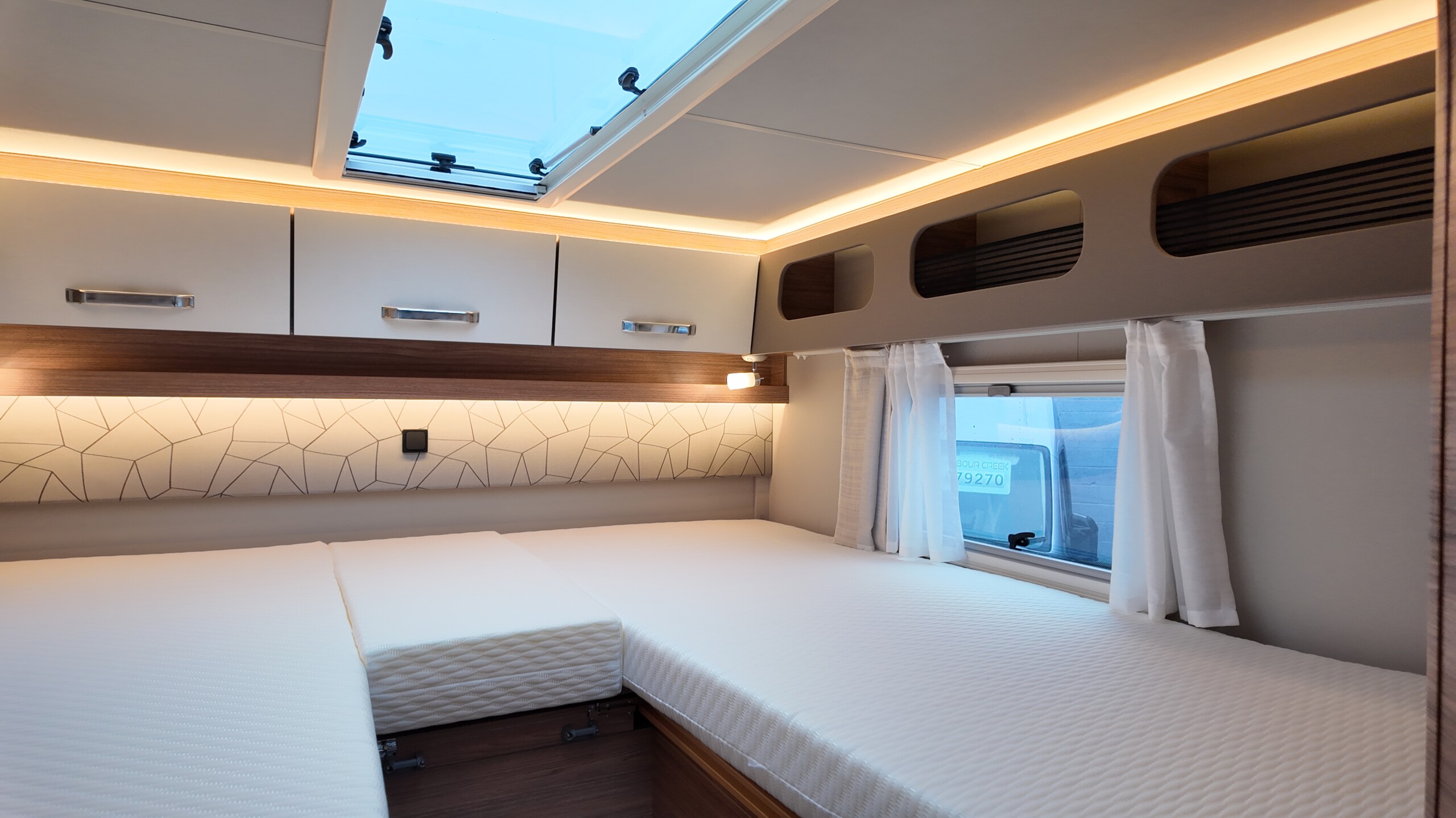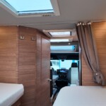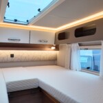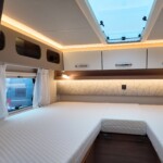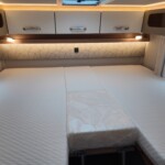 The rear of the vehicle is dedicated to high-comfort sleeping arrangements featuring Twin Single Beds: Two longitudinal beds, both approximately 200cm x 82cm, equipped with EvoPore HRC mattresses on sprung stave bases. A slide-out slatted frame and infill cushion allow these to convert into a large double bed measuring roughly 203cm x 161cm.