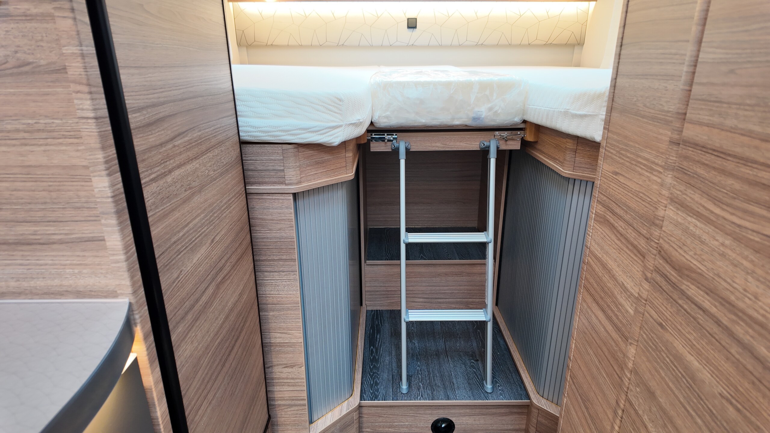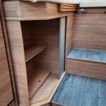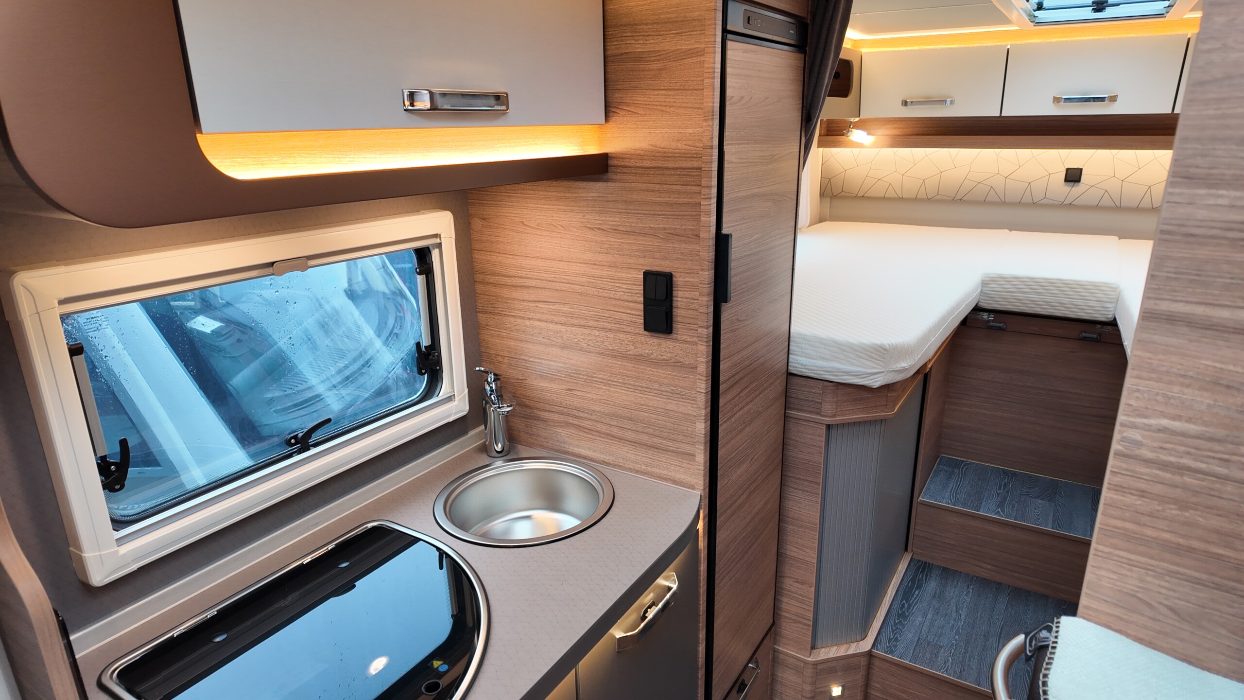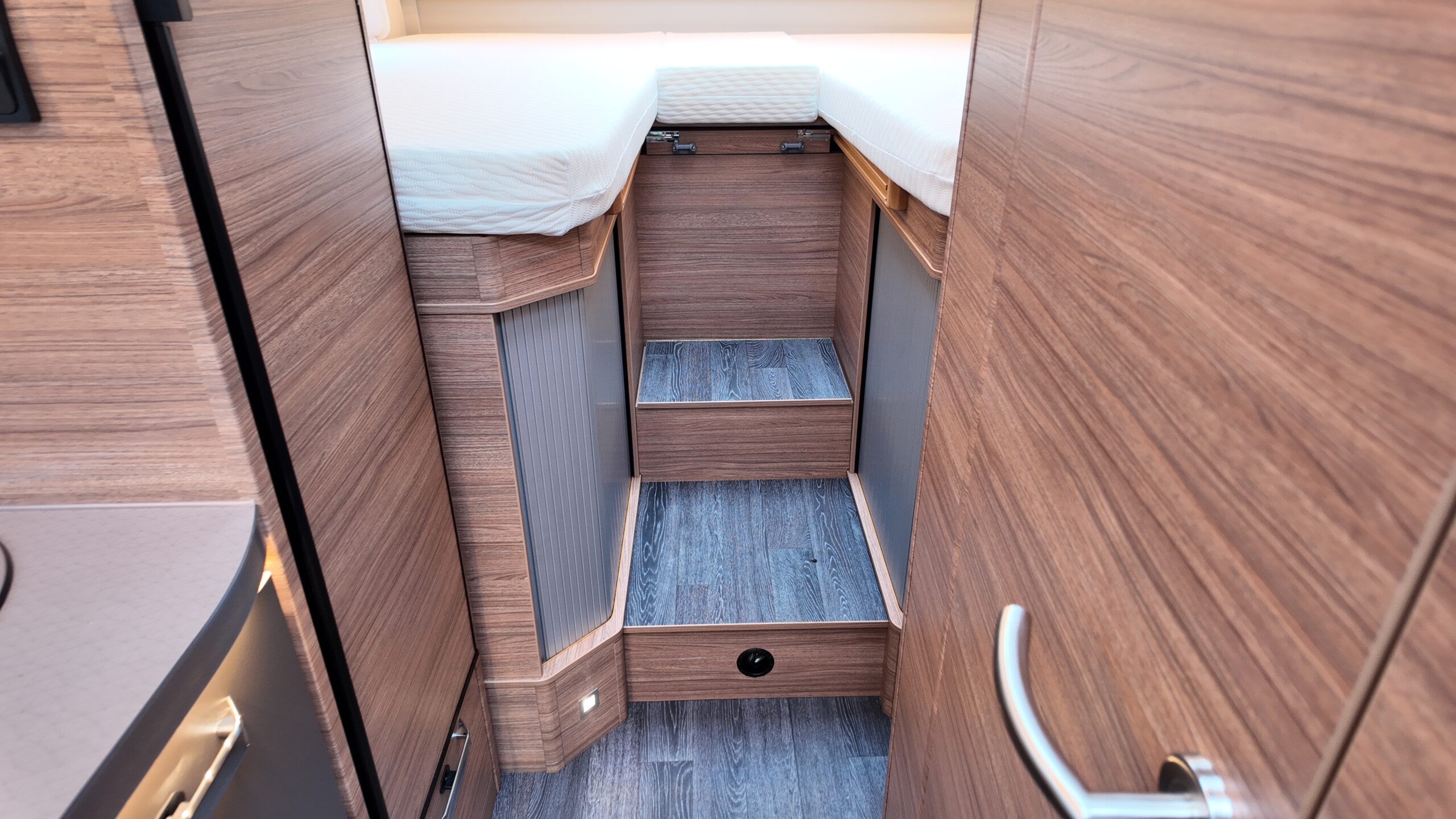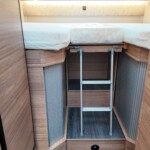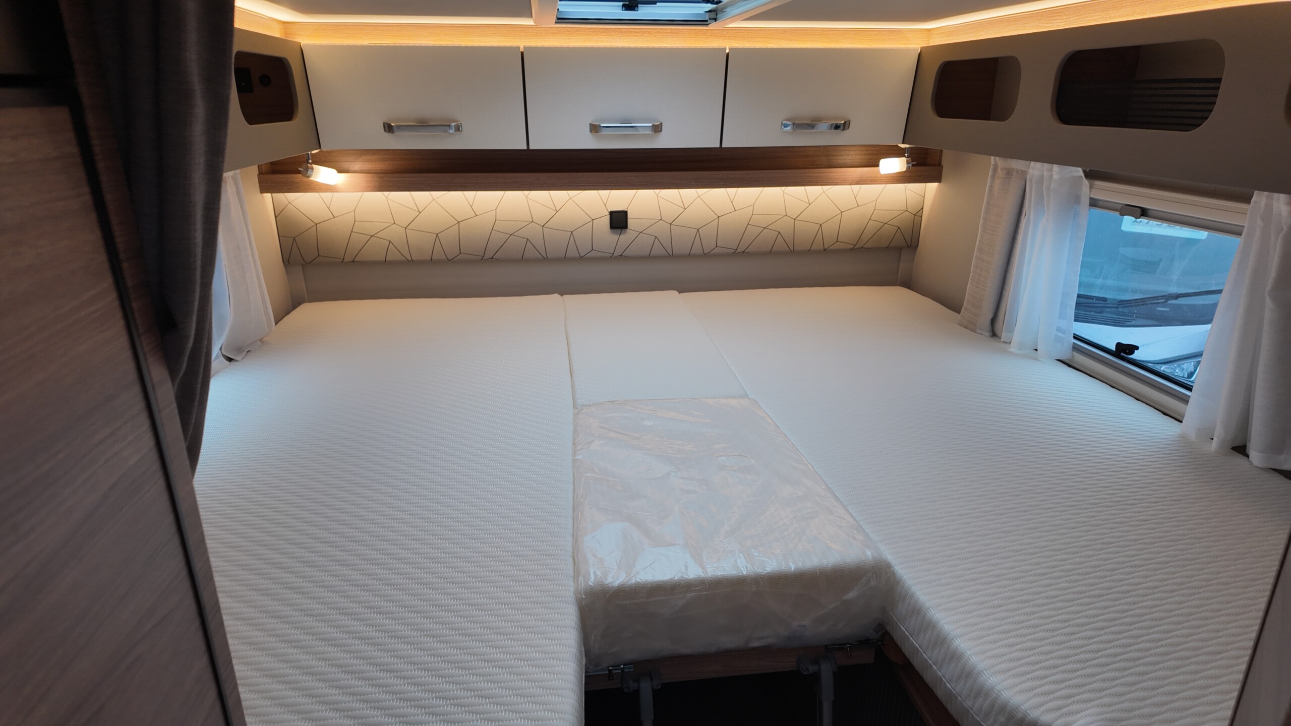 The rear of the vehicle is dedicated to high-comfort sleeping arrangements featuring Twin Single Beds: Two longitudinal beds, both approximately 200cm x 82cm, equipped with EvoPore HRC mattresses on sprung stave bases. A slide-out slatted frame and infill cushion allow these to convert into a large double bed measuring roughly 203cm x 161cm.