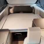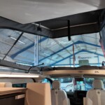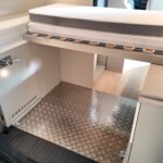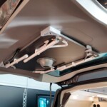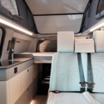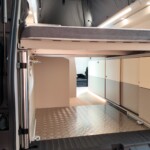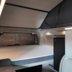 Inside, the key feature is the permanent transverse double bed, which measures 190cm by 130cm. Side extension panels fitted to the sides of the campervan give the vehicle extra width and allow the bed to be longer.