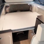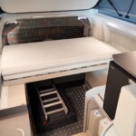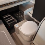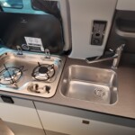 Featuring a side kitchen unit that has two gas burners, a 51-litre compressor fridge and a sink and a fixed cassette toilet in the back that slides out for use.