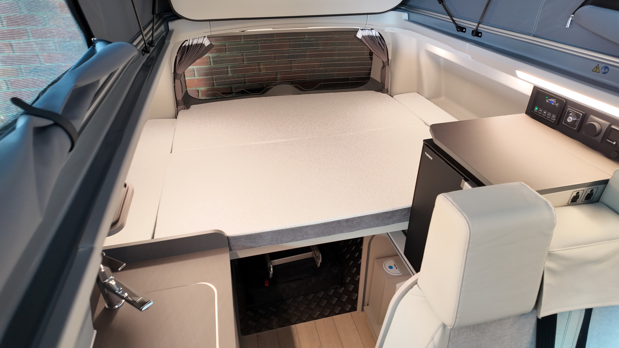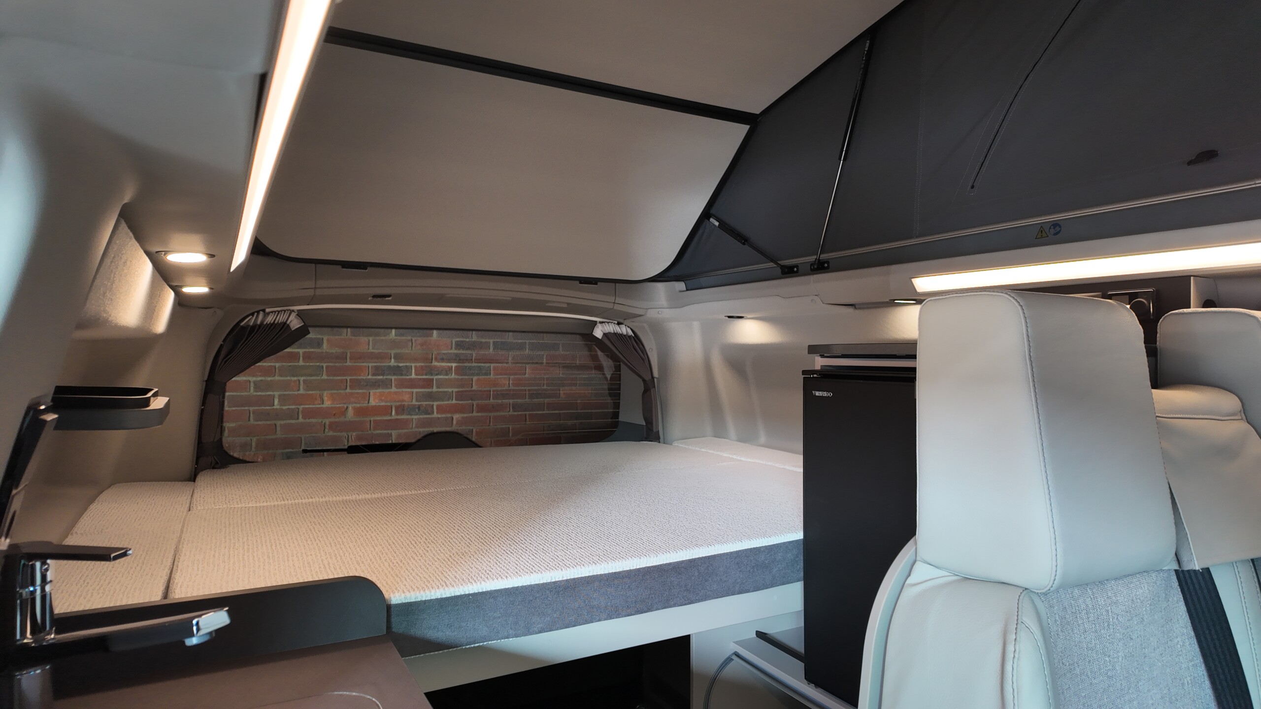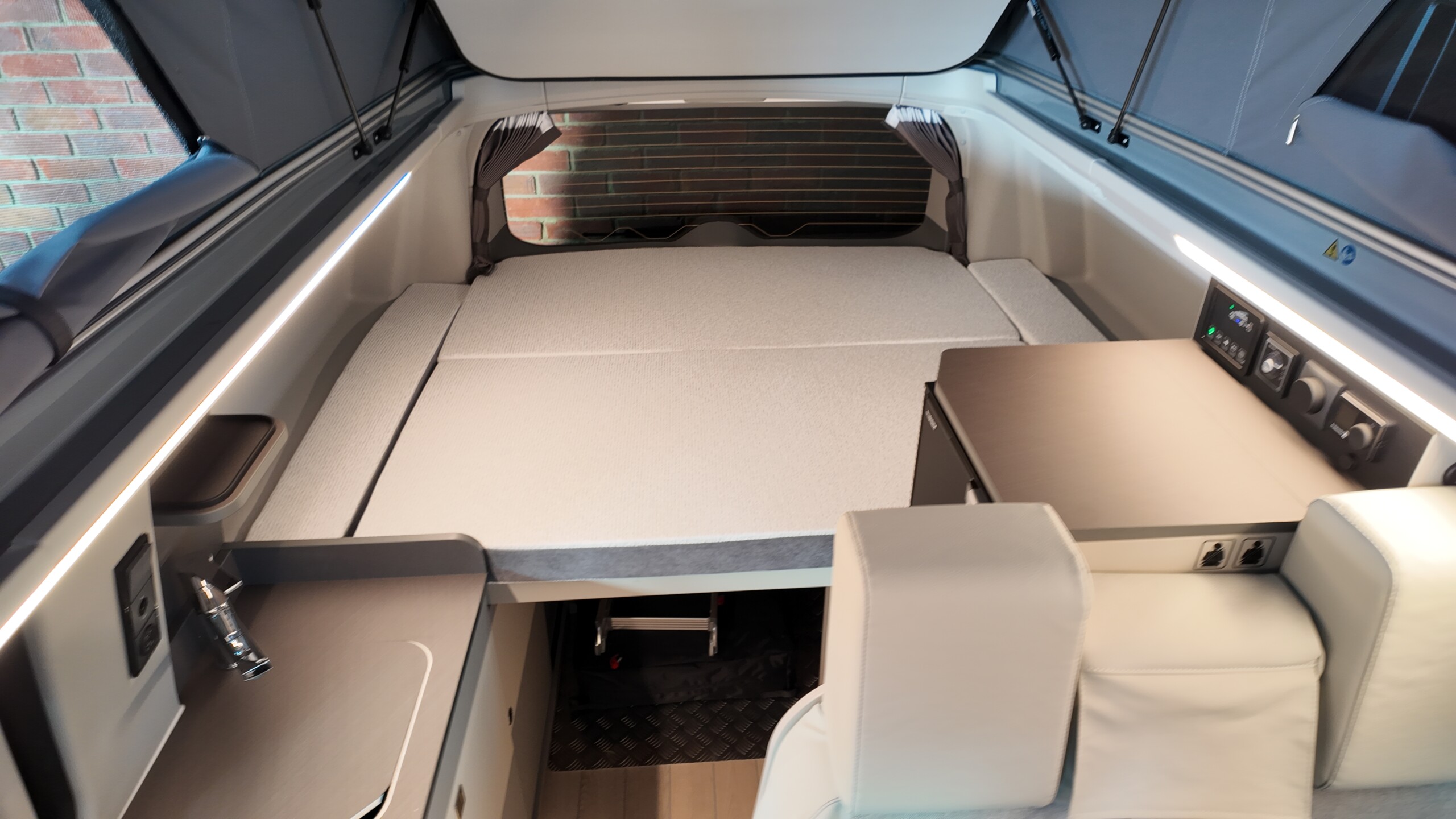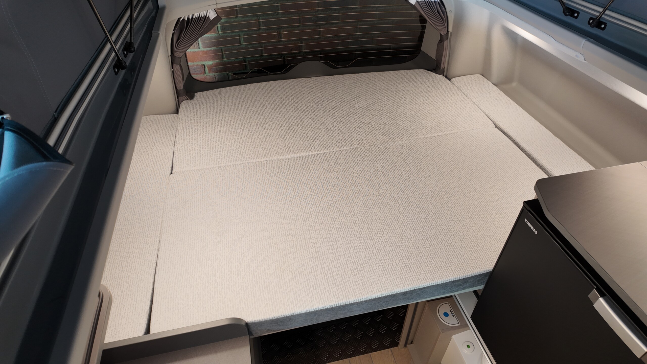 Inside, the key feature is the permanent transverse double bed, which measures 190cm by 130cm. Side extension panels fitted to the sides of the campervan give the vehicle extra width and allow the bed to be longer.