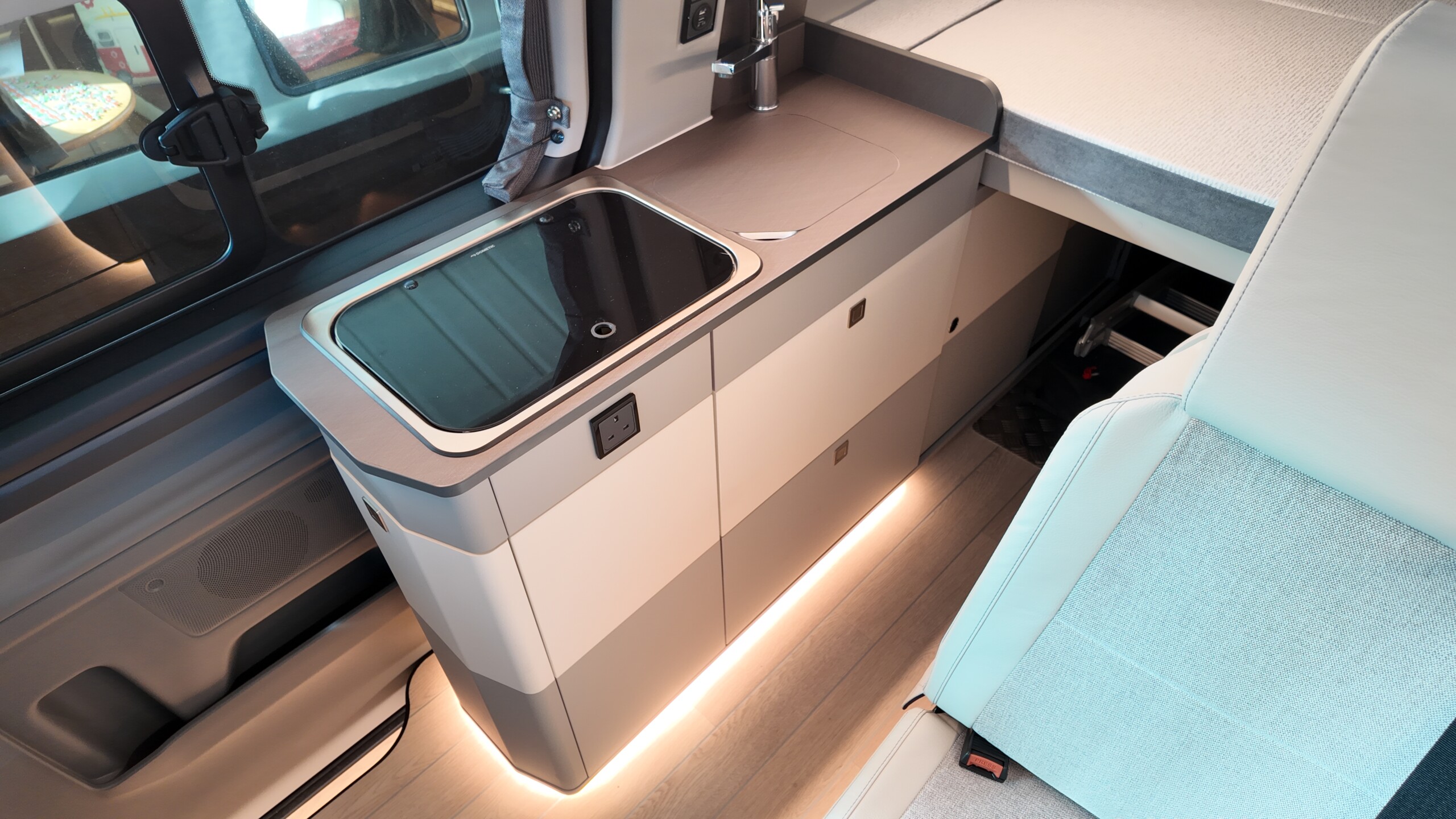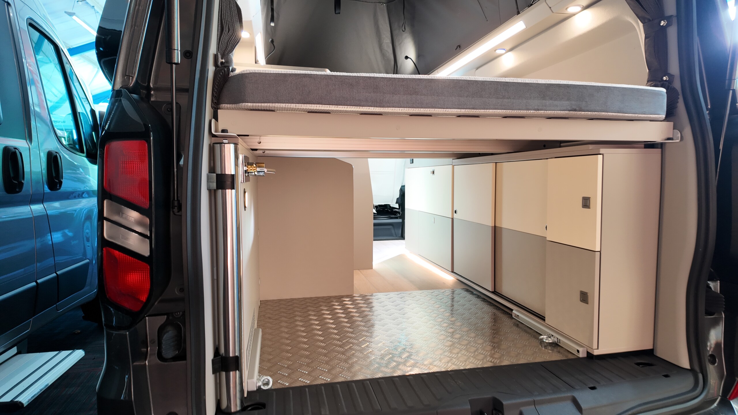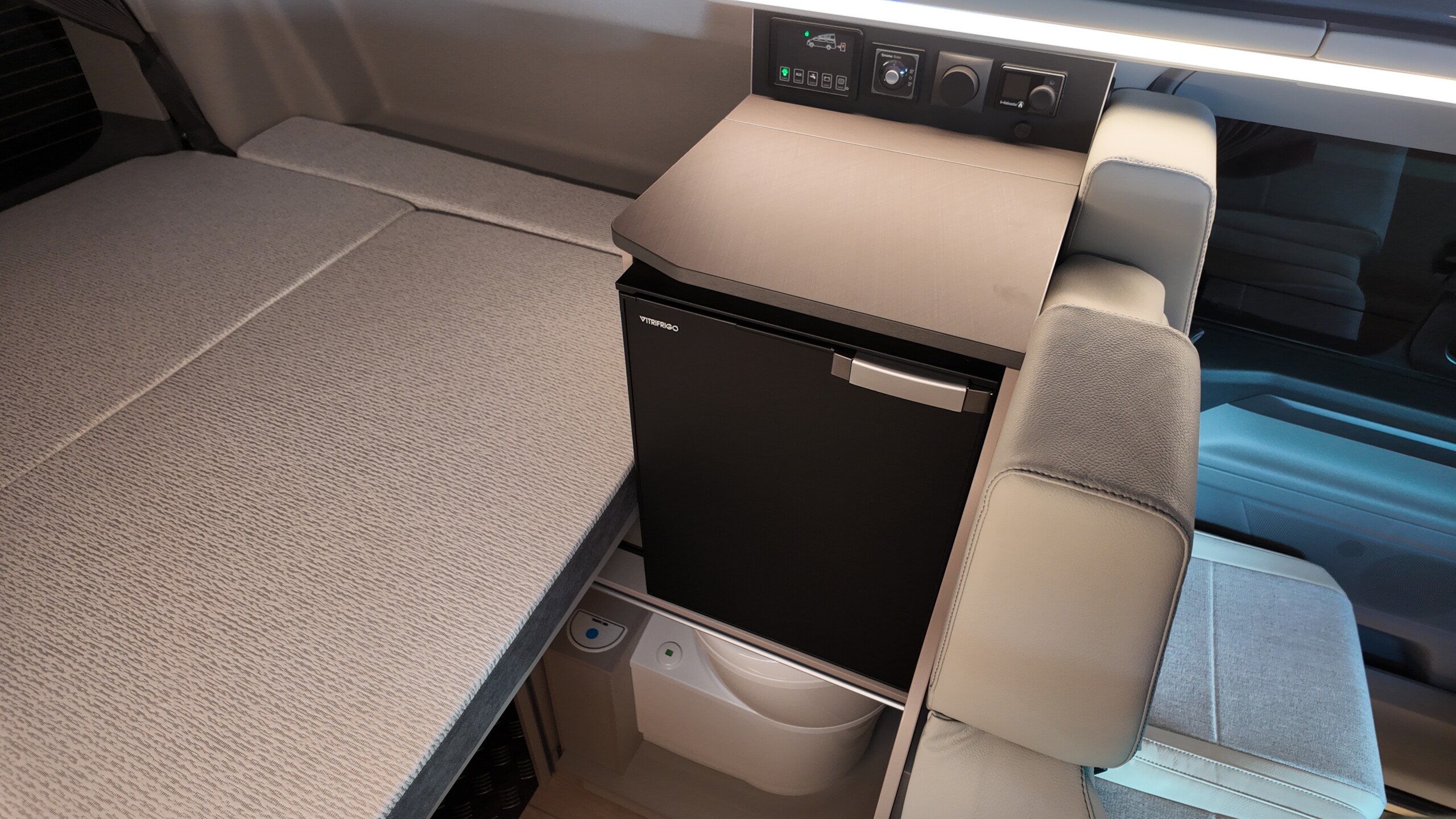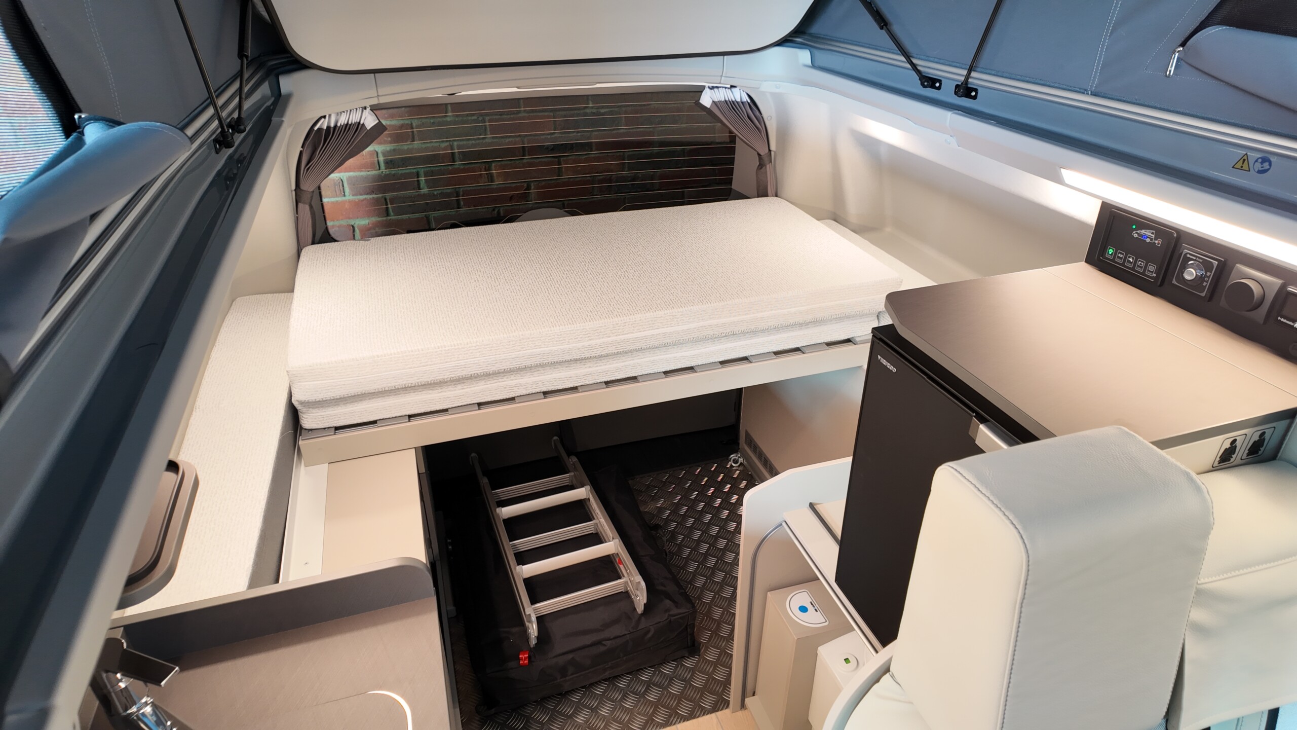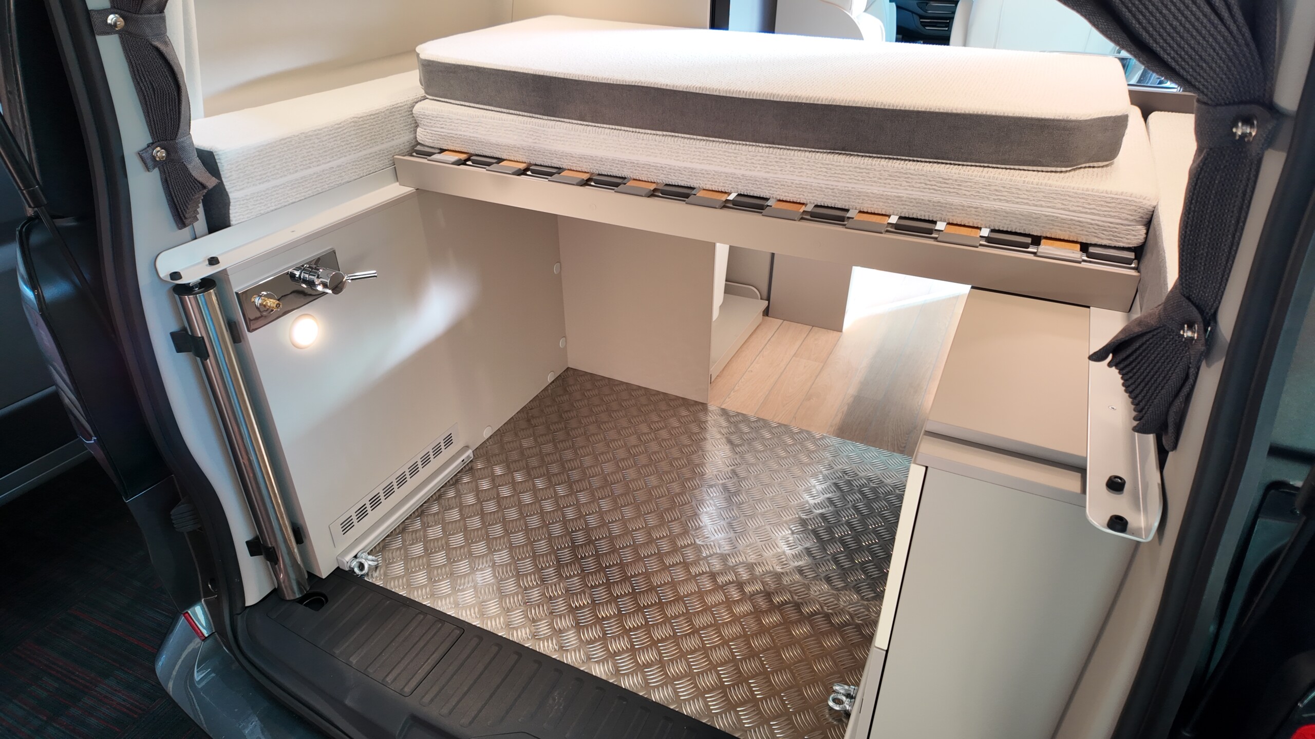 Inside, the key feature is the permanent transverse double bed, which measures 190cm by 130cm. Side extension panels fitted to the sides of the campervan give the vehicle extra width and allow the bed to be longer.