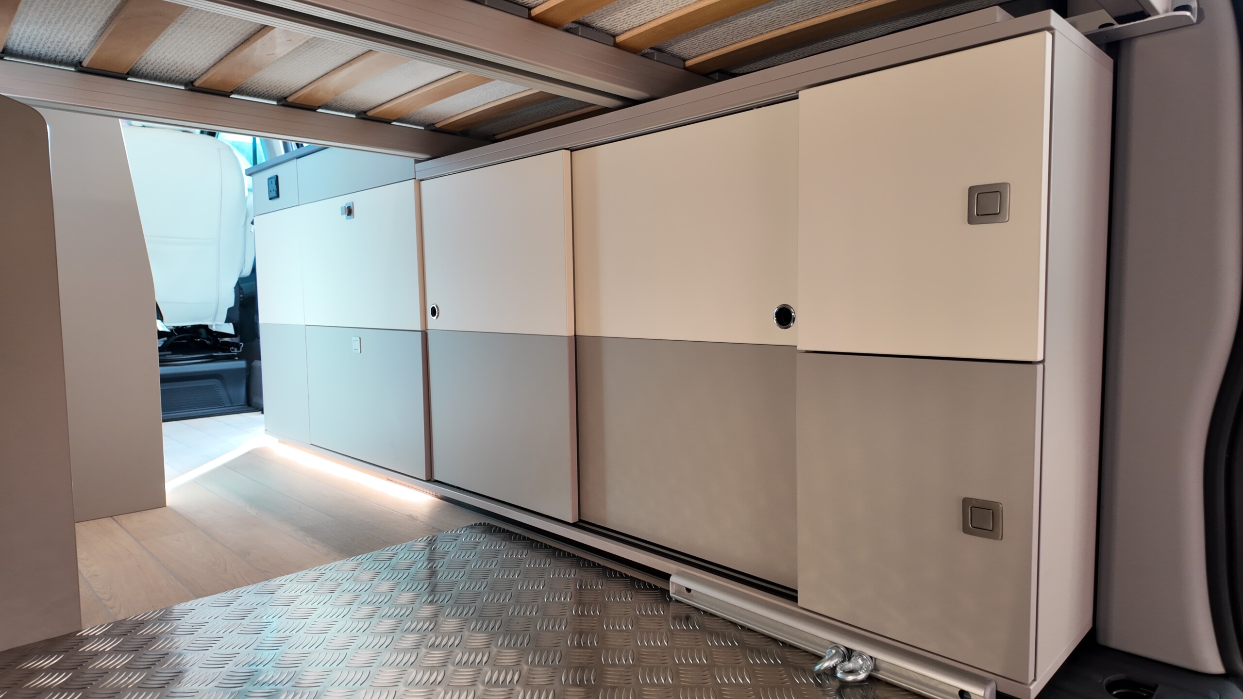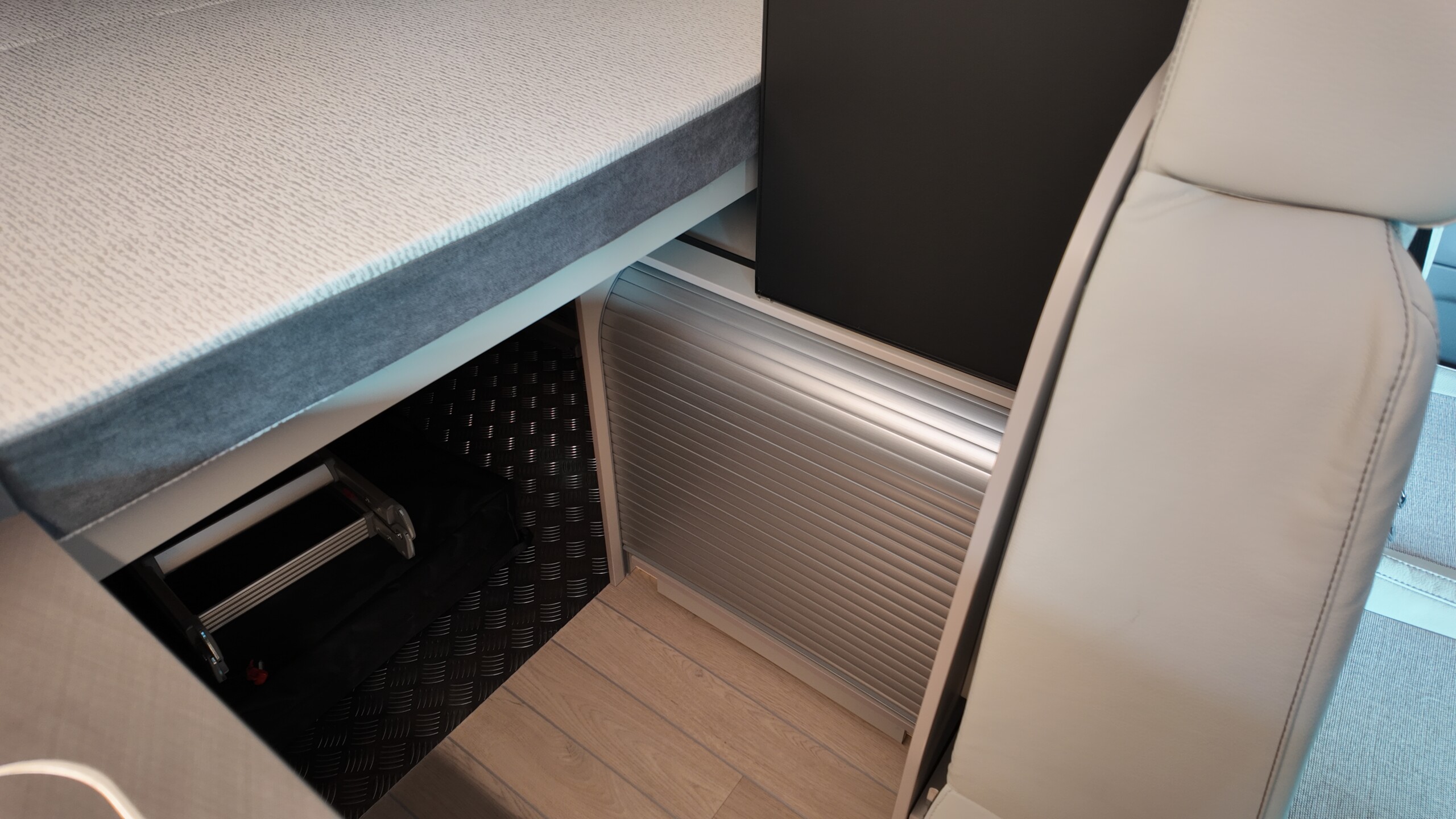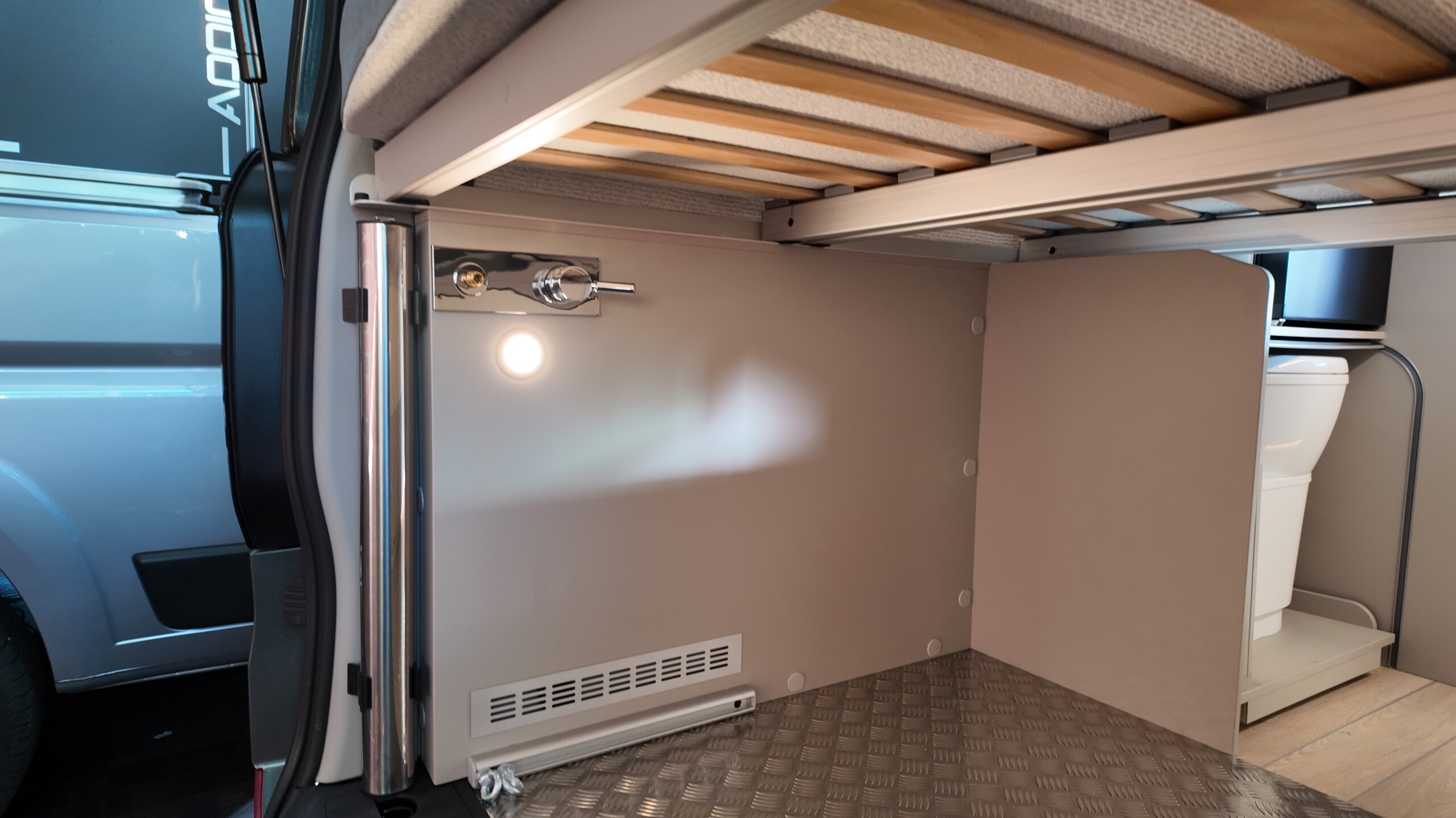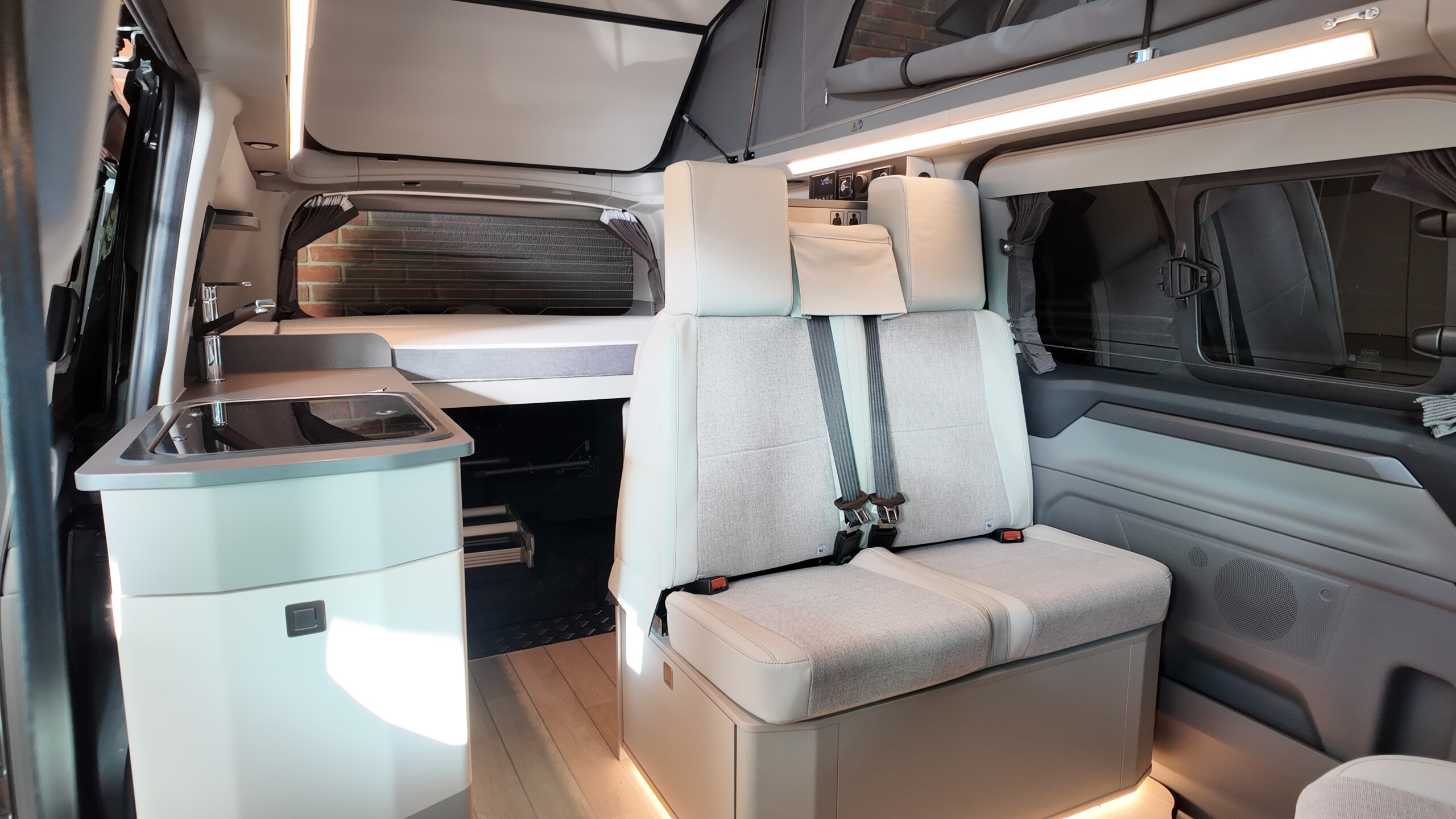 Inside, the key feature is the permanent transverse double bed, which measures 190cm by 130cm. Side extension panels fitted to the sides of the campervan give the vehicle extra width and allow the bed to be longer.