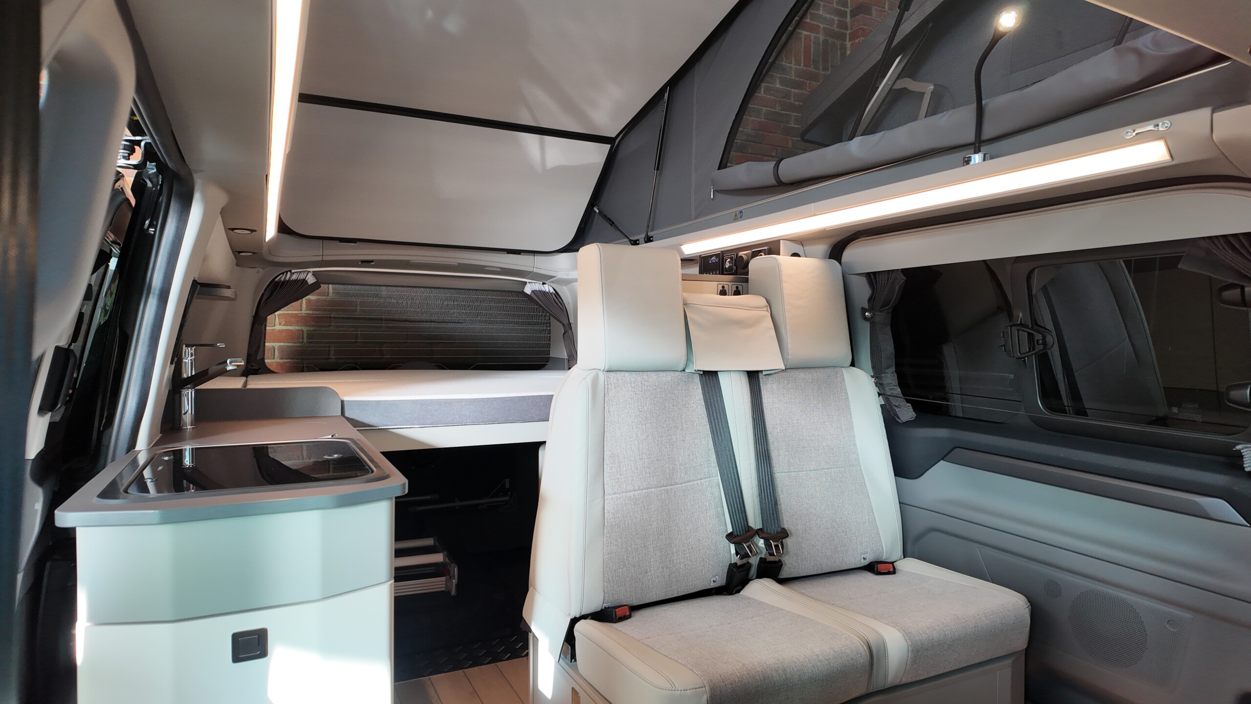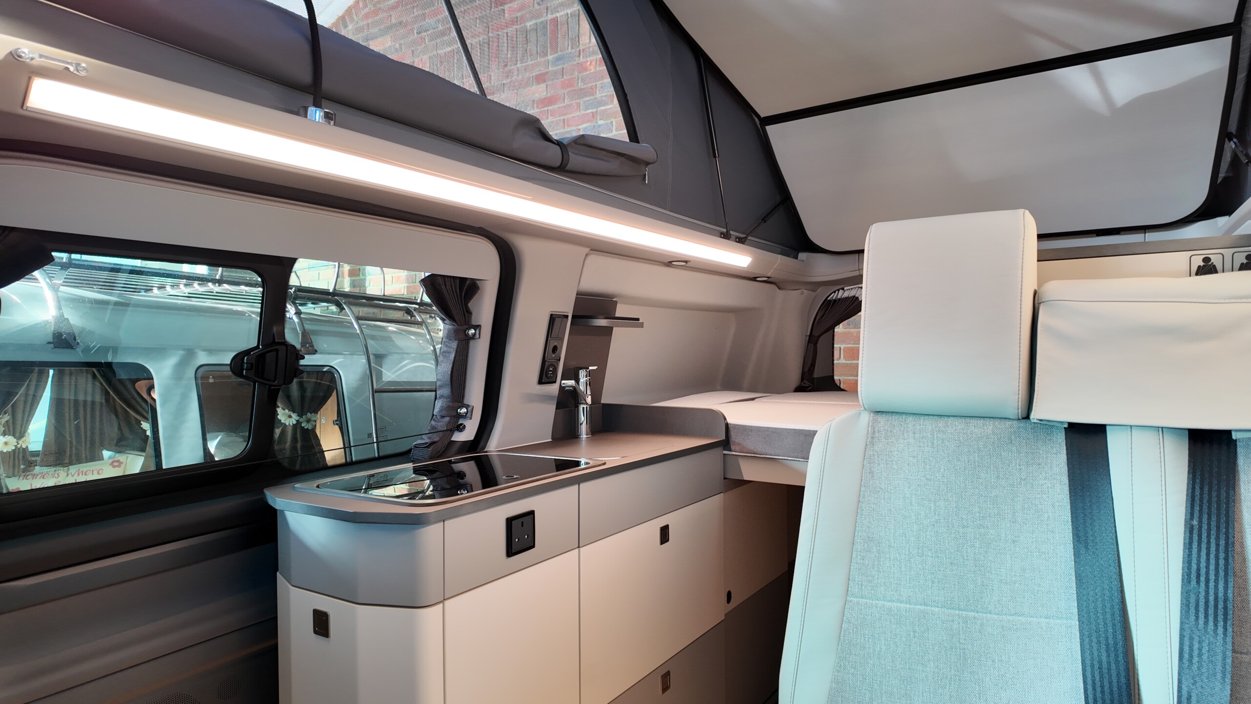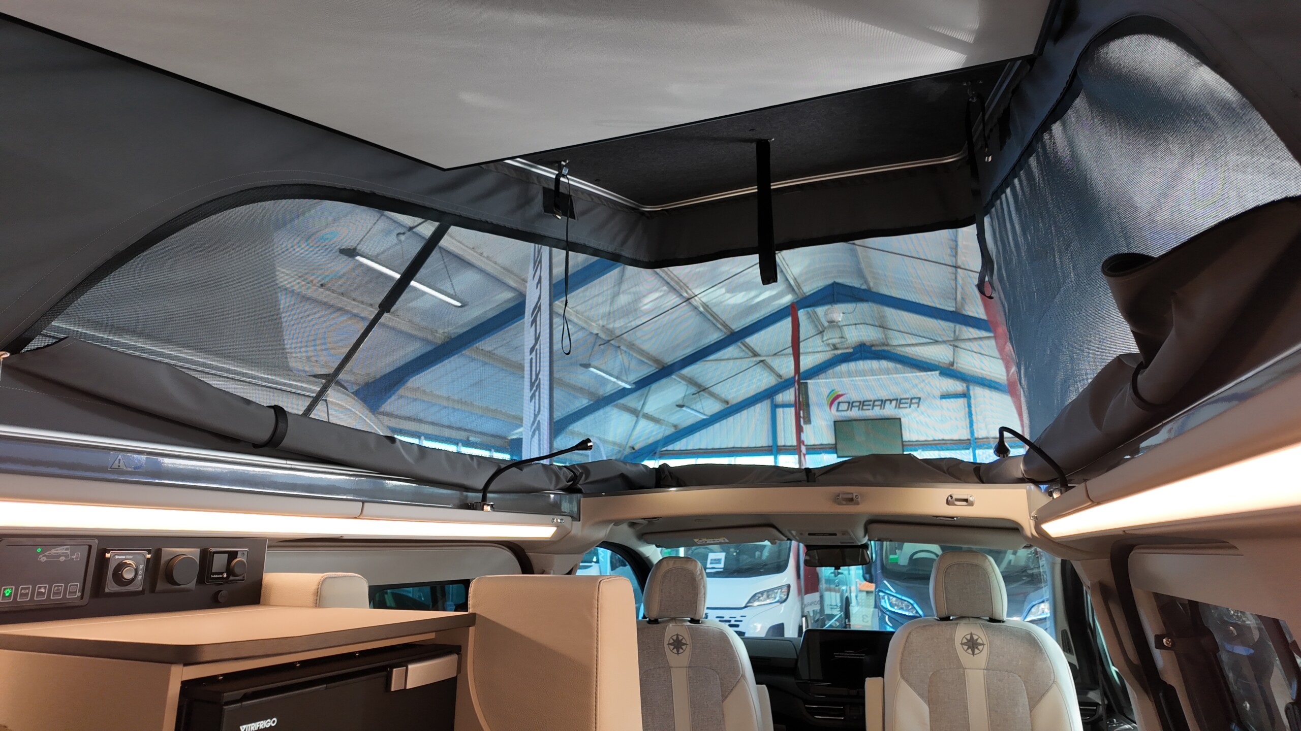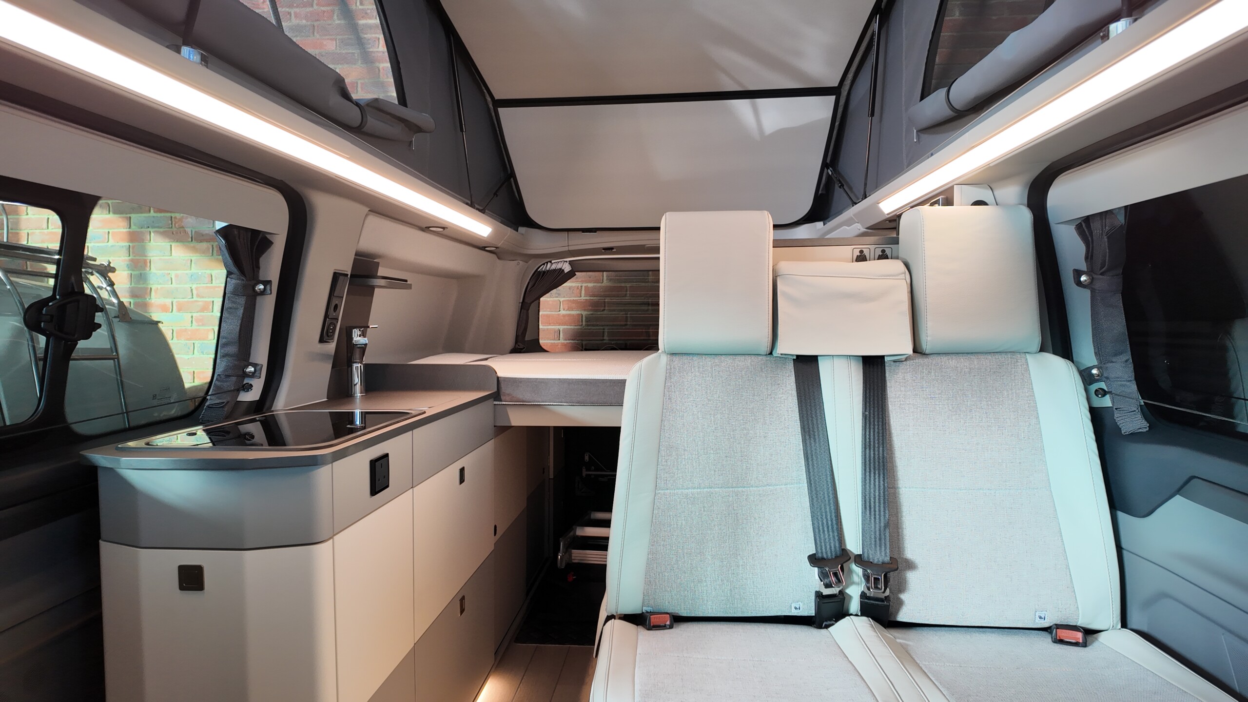 In the pop-top roof, there is a second double bed measuring 192cm by 128cm and on hot days the canvas can be zipped open to reveal panoramic mesh windows.