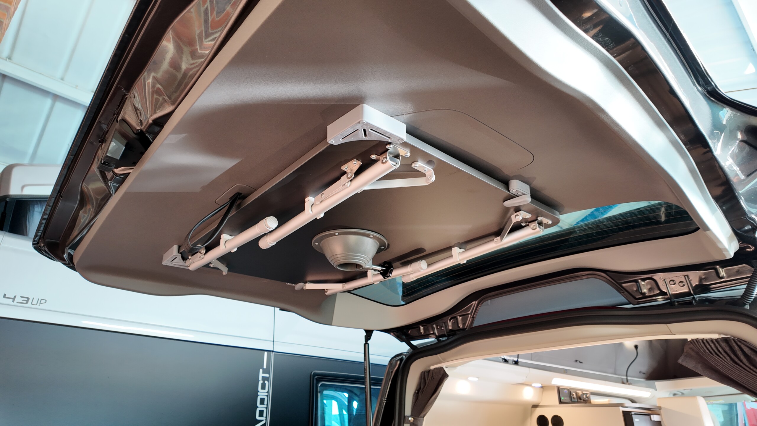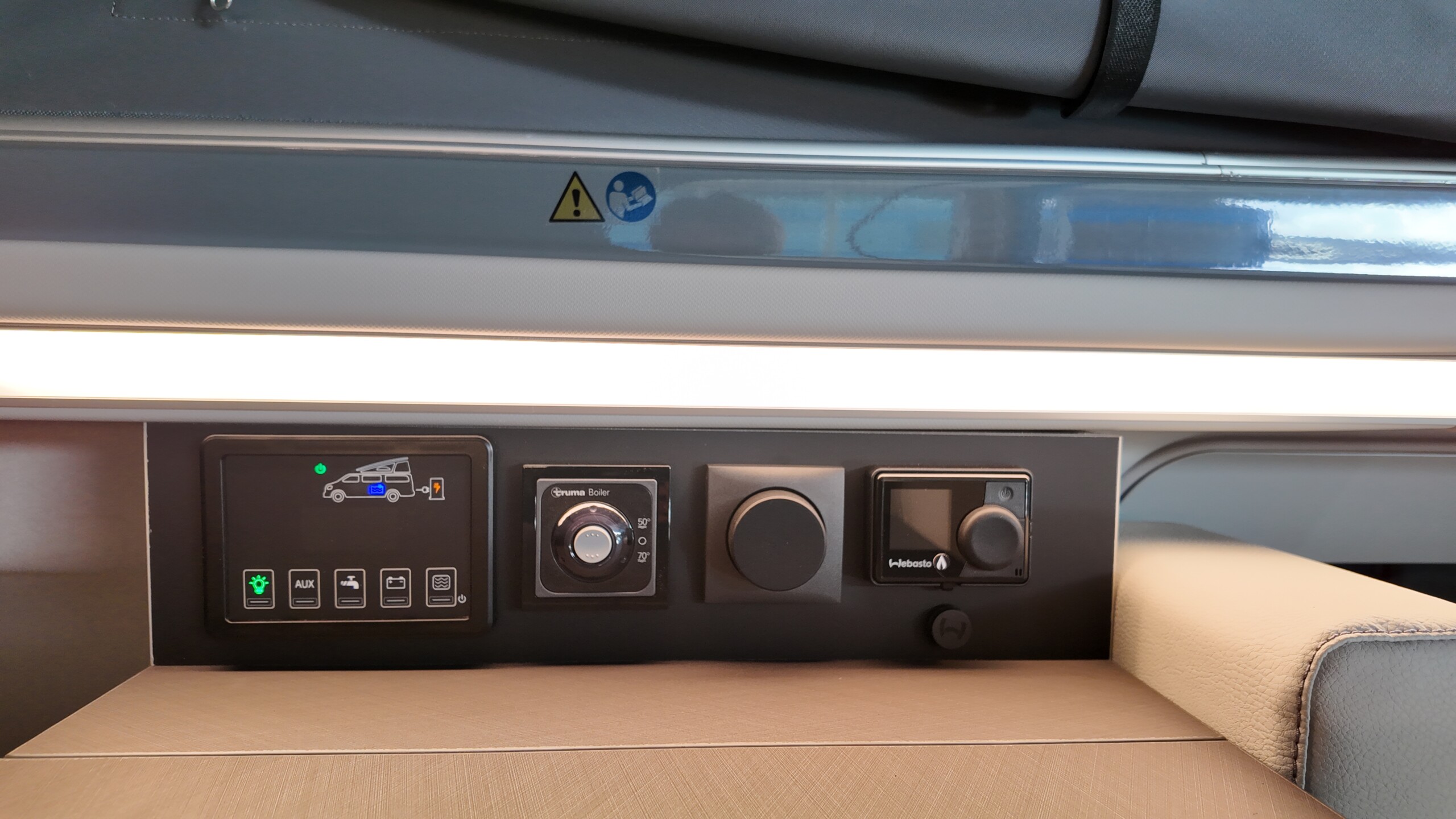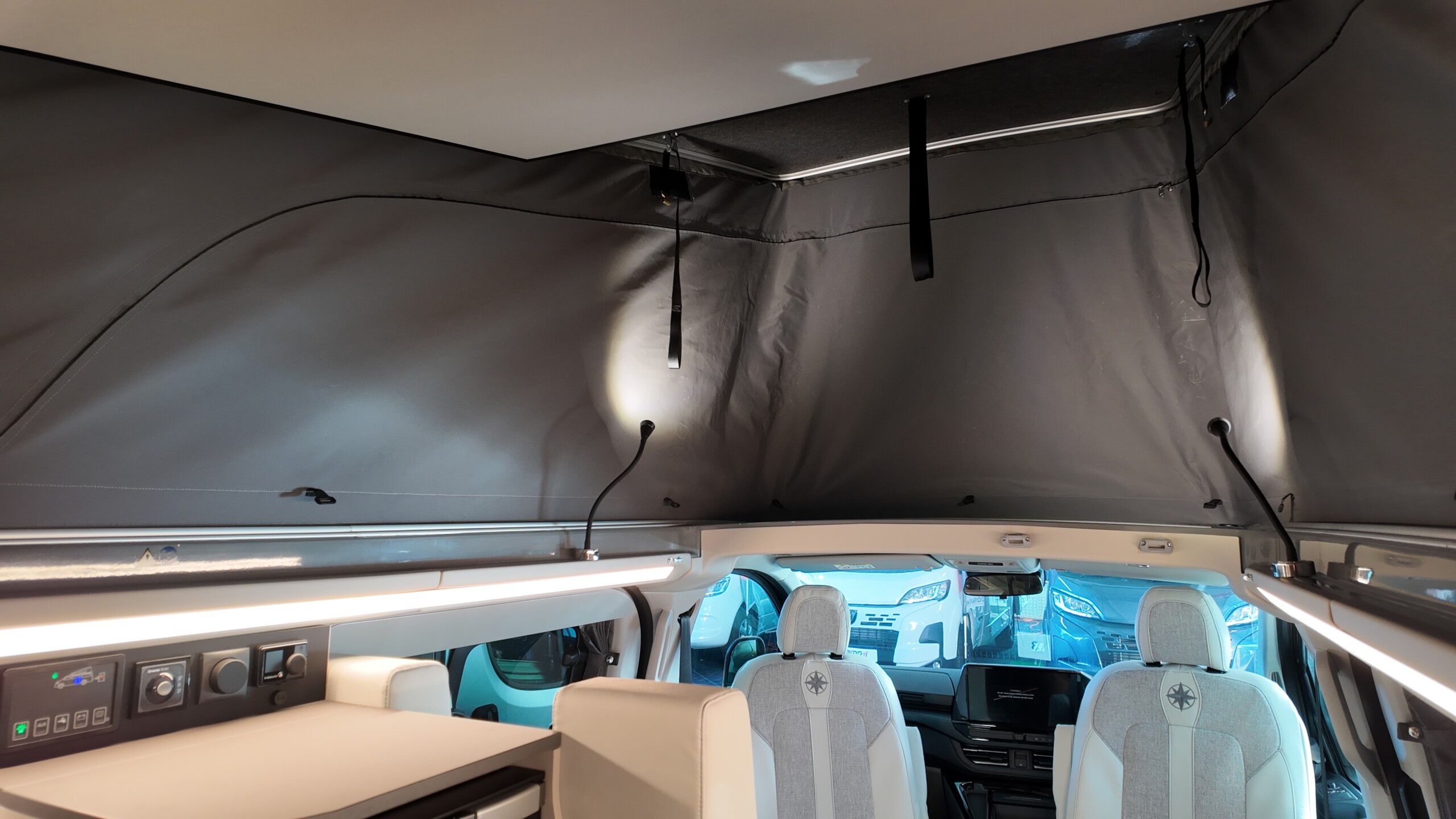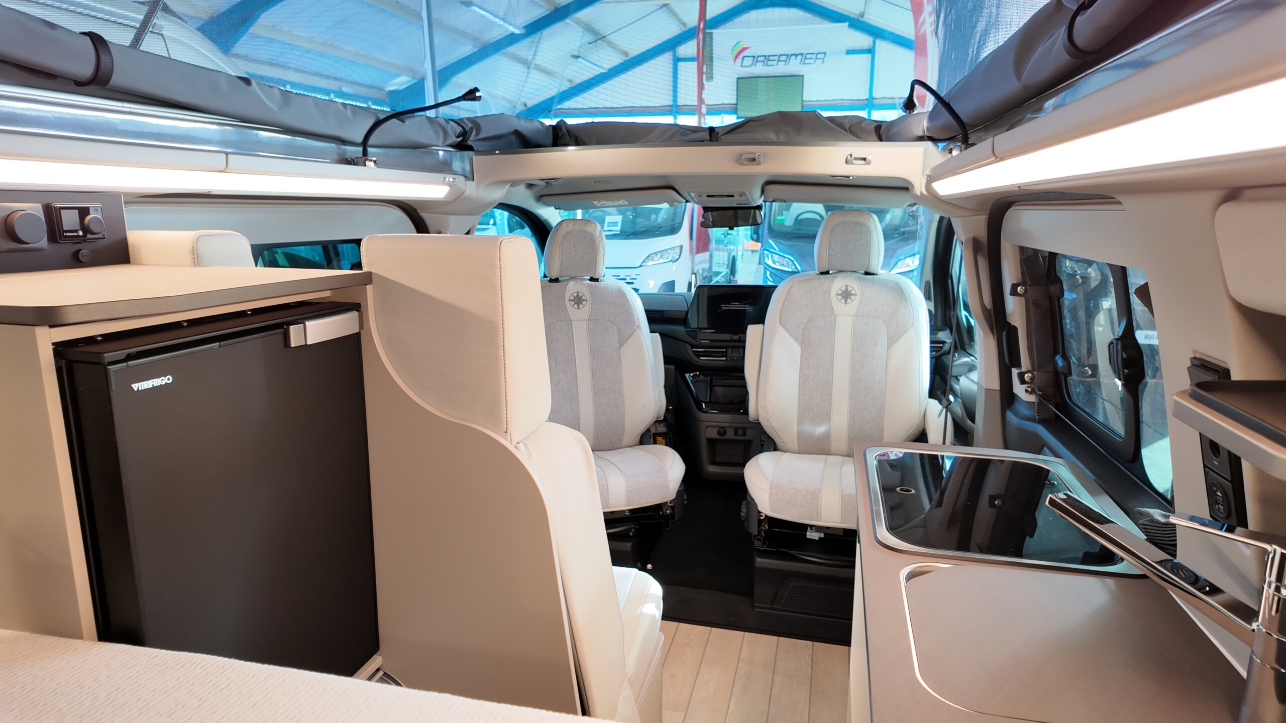 In the pop-top roof, there is a second double bed measuring 192cm by 128cm and on hot days the canvas can be zipped open to reveal panoramic mesh windows.