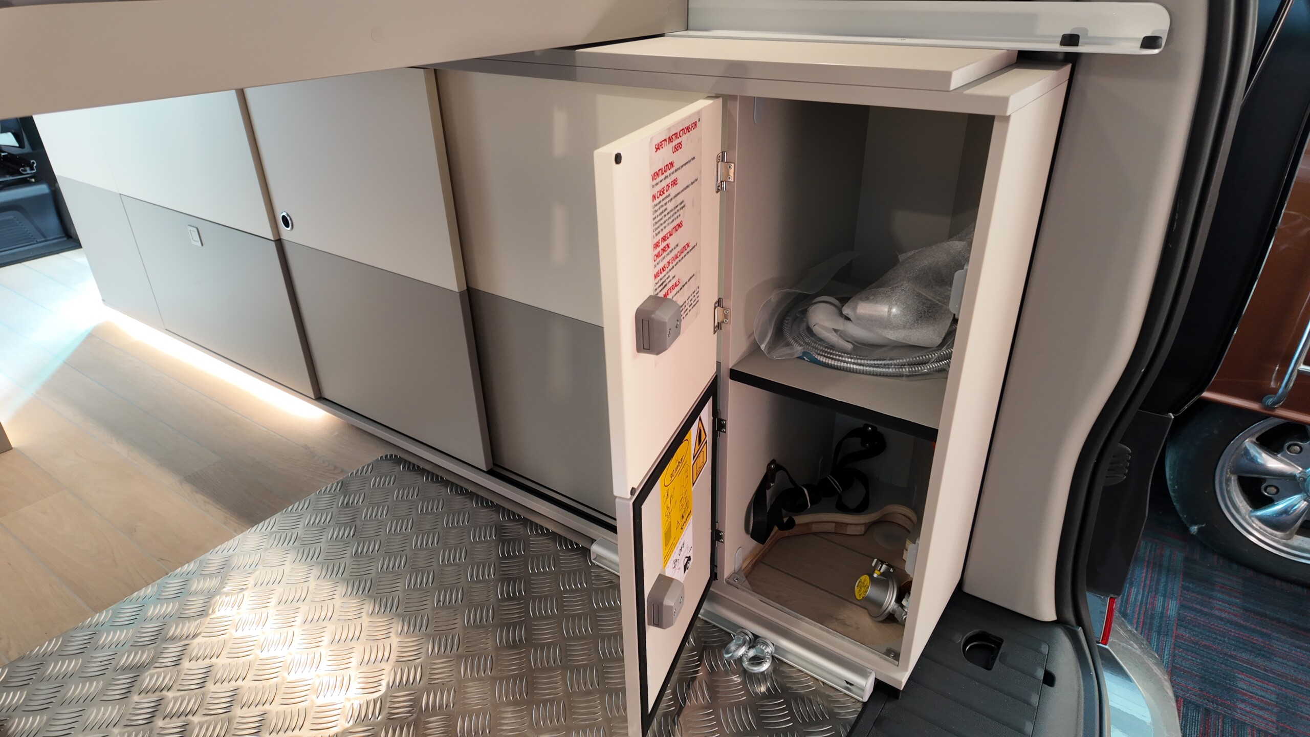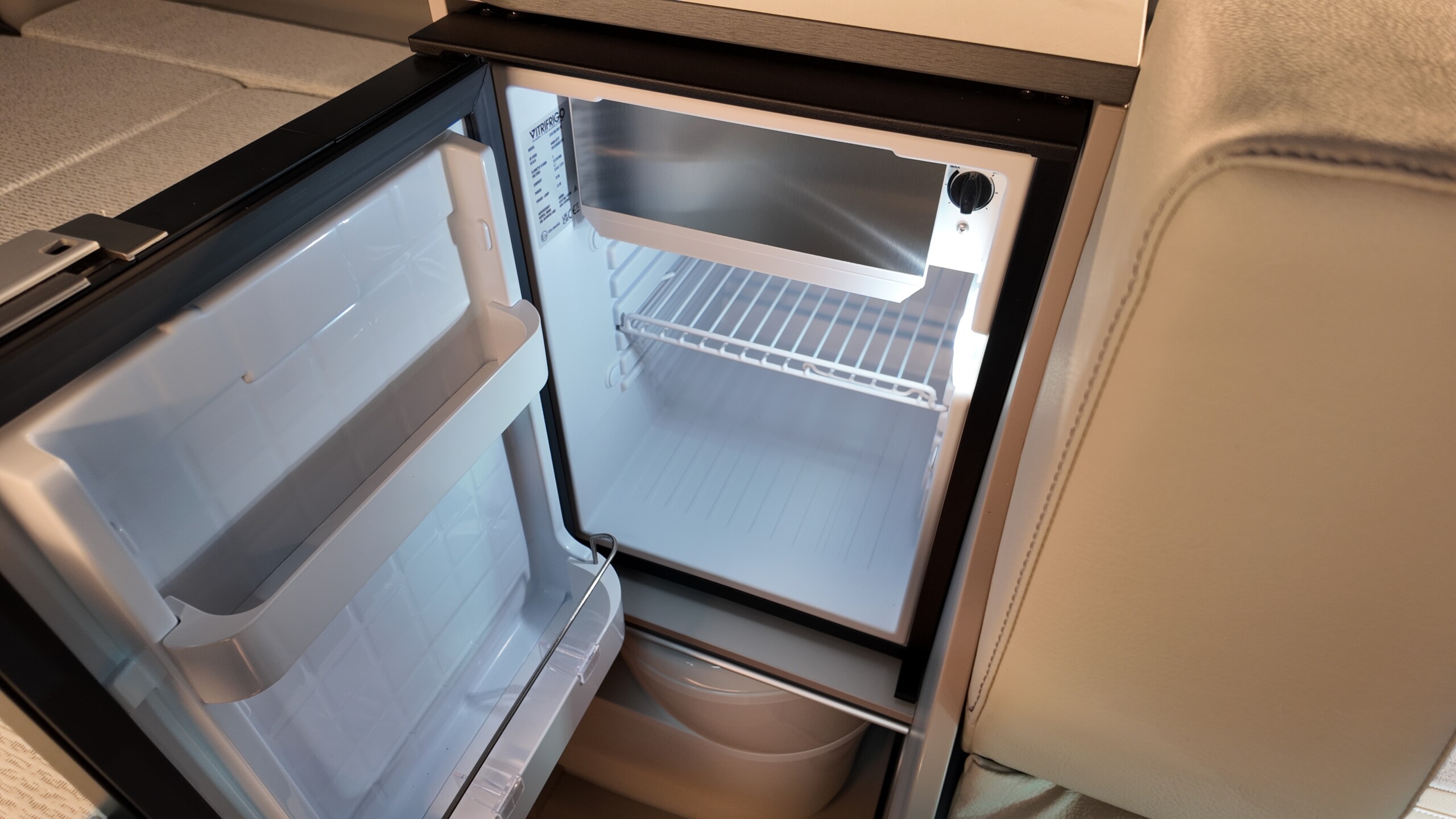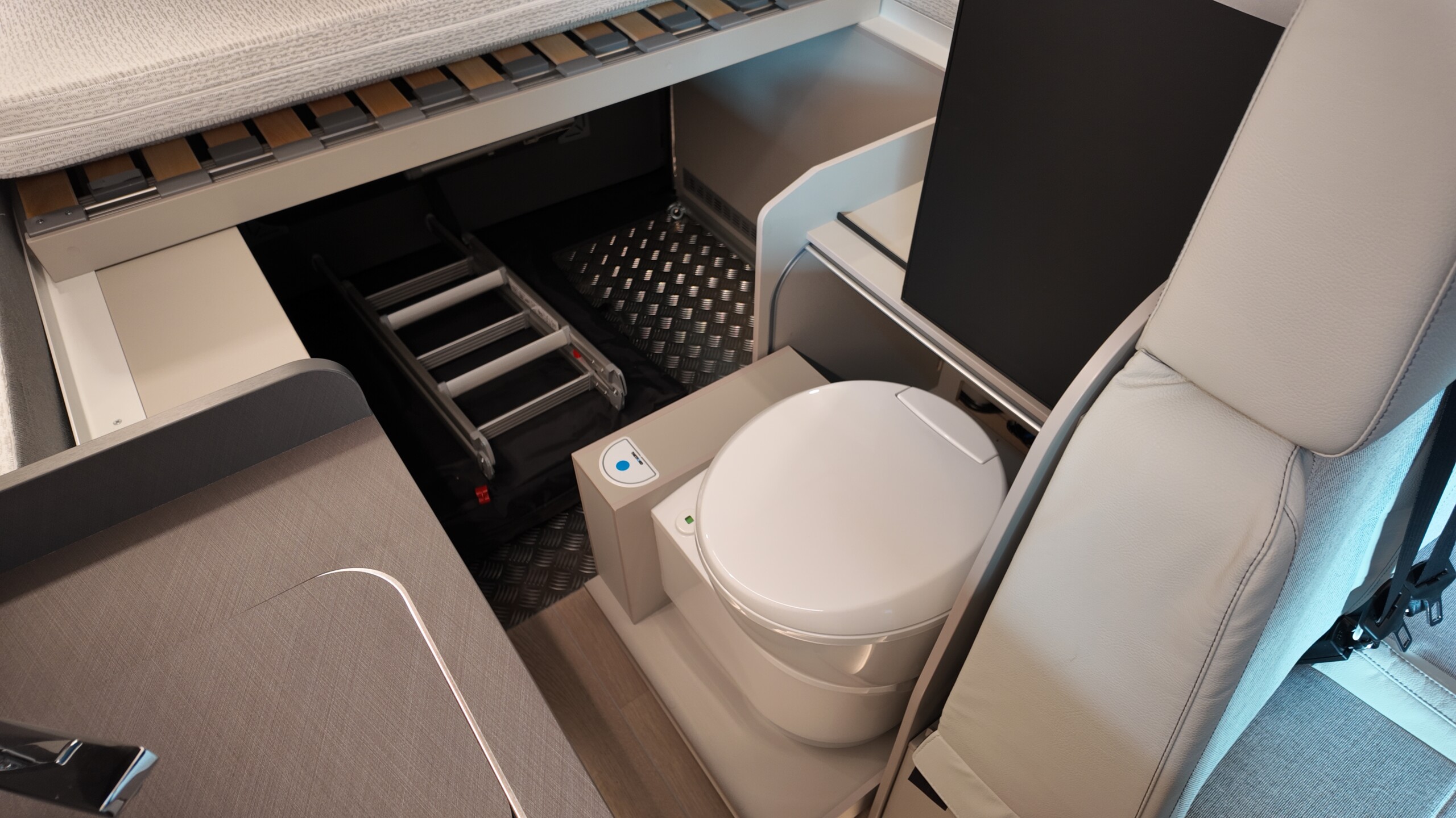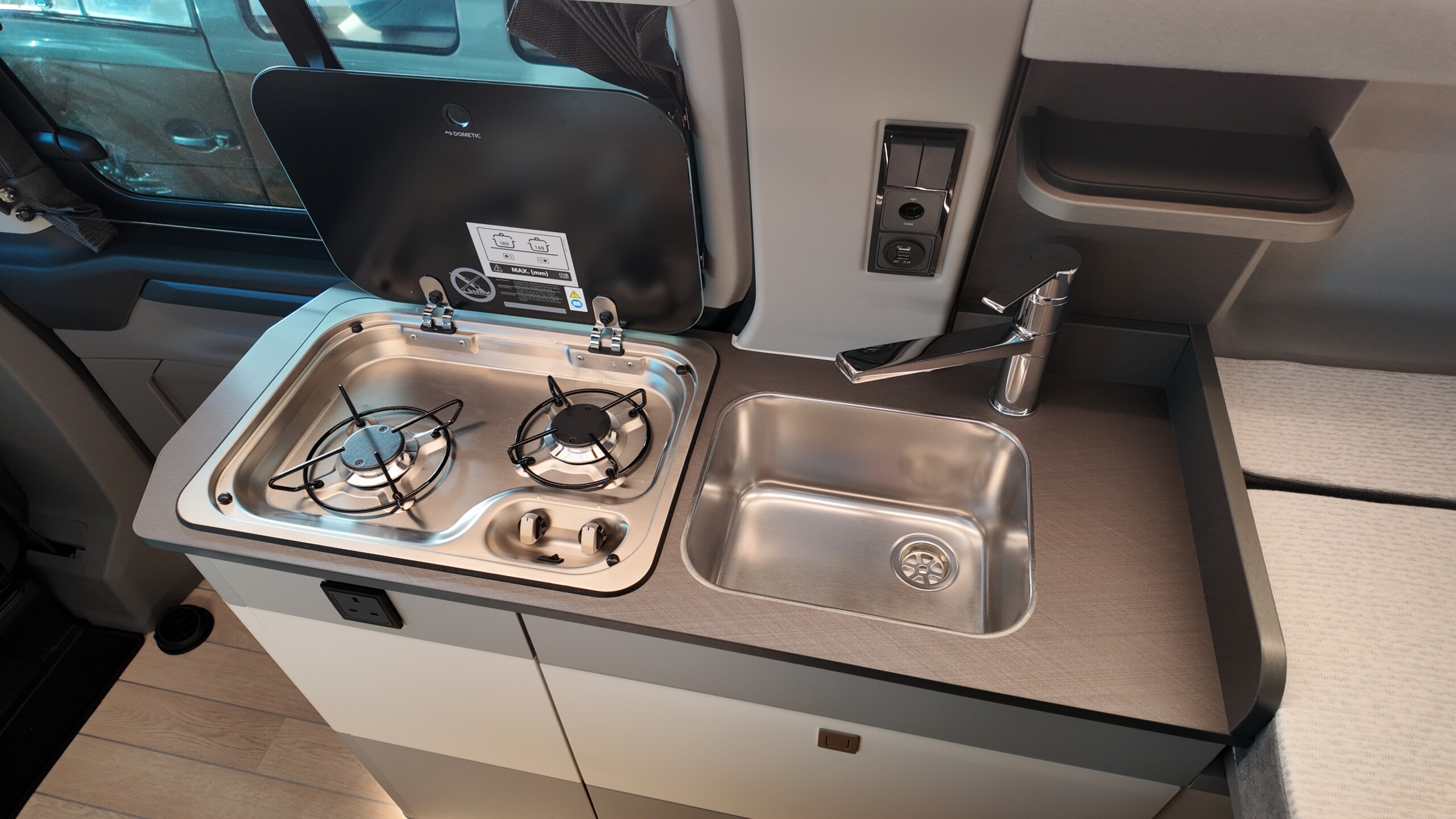 Featuring a side kitchen unit that has two gas burners, a 51-litre compressor fridge and a sink and a fixed cassette toilet in the back that slides out for use.
